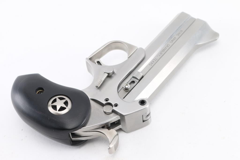 Stainless steel two shot derringer accepts 38 Special or 357 Magnum cartridges. Features break open over/under barrel assembly, manual extractor lever, manual safety, fixed sights, smooth wood grips with inset western stars, 4.25" barrels. Bores are excellent. Brushed stainless finish is near pristine with few minor blemishes. Grips are excellent. Includes original box and a black leather holster with thumb break. Condition is NRA Excellent *** Modern Firearm ***