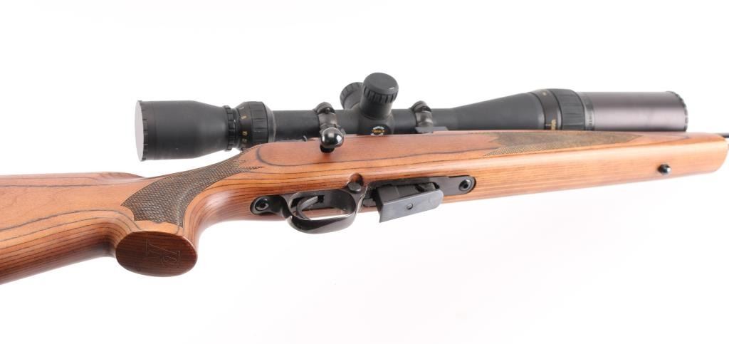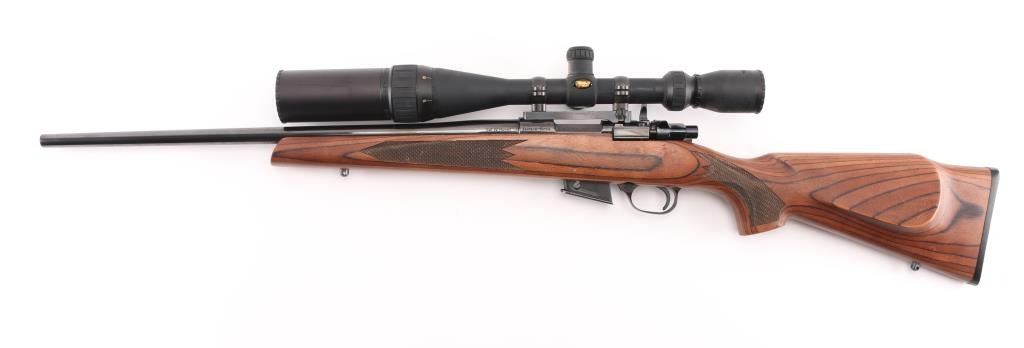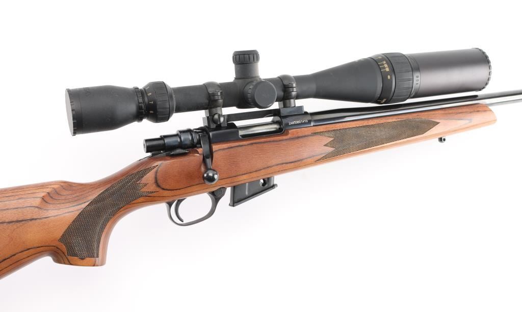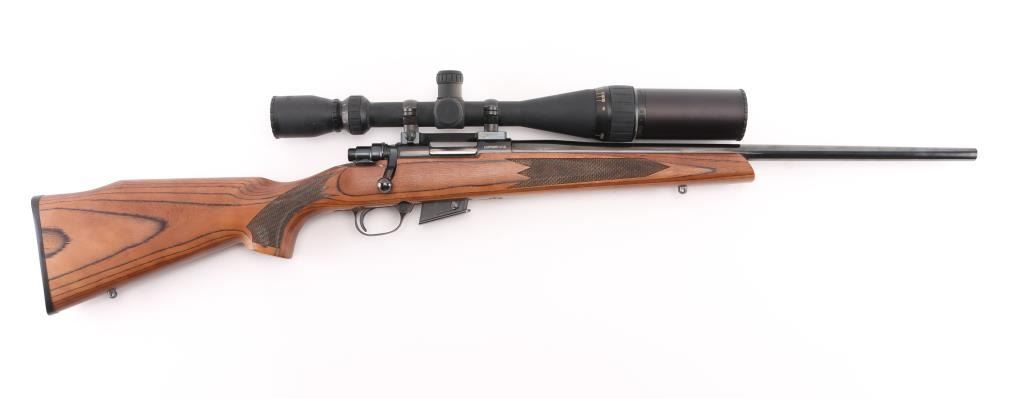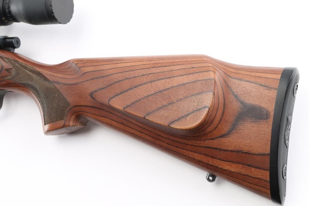 SN: ZA850601410 Serbian bolt action rifle imported by USSG, Rockledge FL, under the Remington brand. Features 20' tapered barrel, blued finish, laminated wood sporter stock, checkering at wrist & forend, factory black polymer buttplate, accepts detachable magazine with push button mag release, sling studs, one piece Leupold type scope base,no sights, mounts a BSA Contender 4-16x scope (threaded lens caps, adjustable objective,duplex reticle, clear view, currently mounted slightly canted). Bore is pristine. Retains 95% finish, with handling marks. Stock is near excellent. Includes one magazine. Condition is NRA Excellent *** Modern Firearm ***