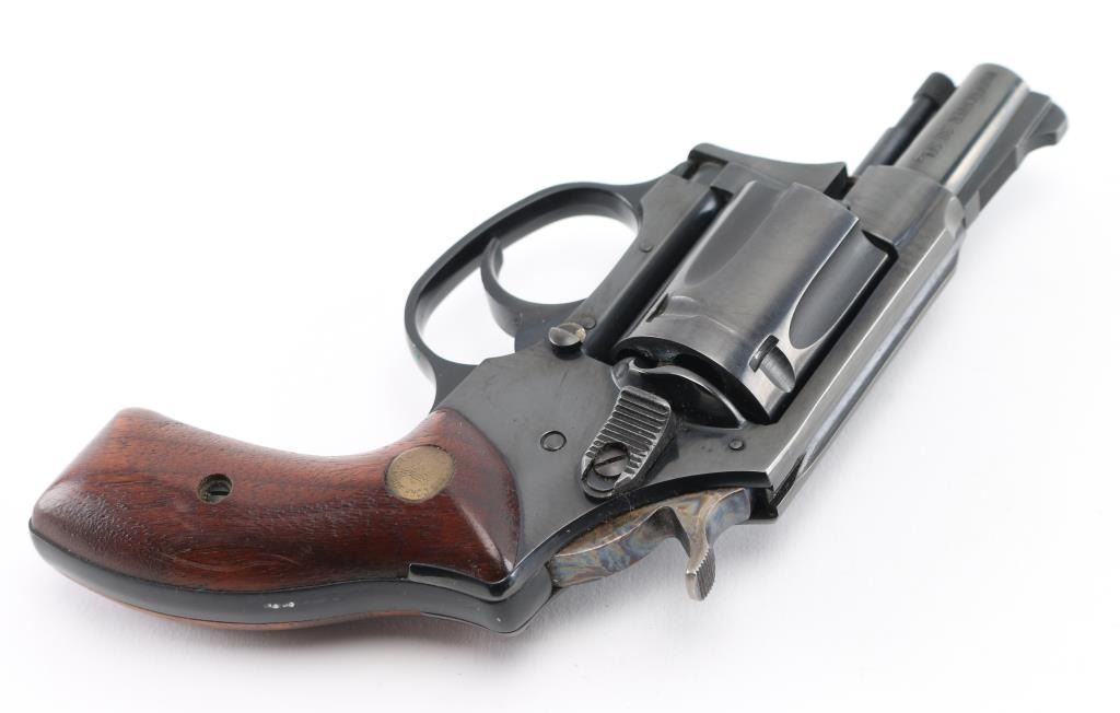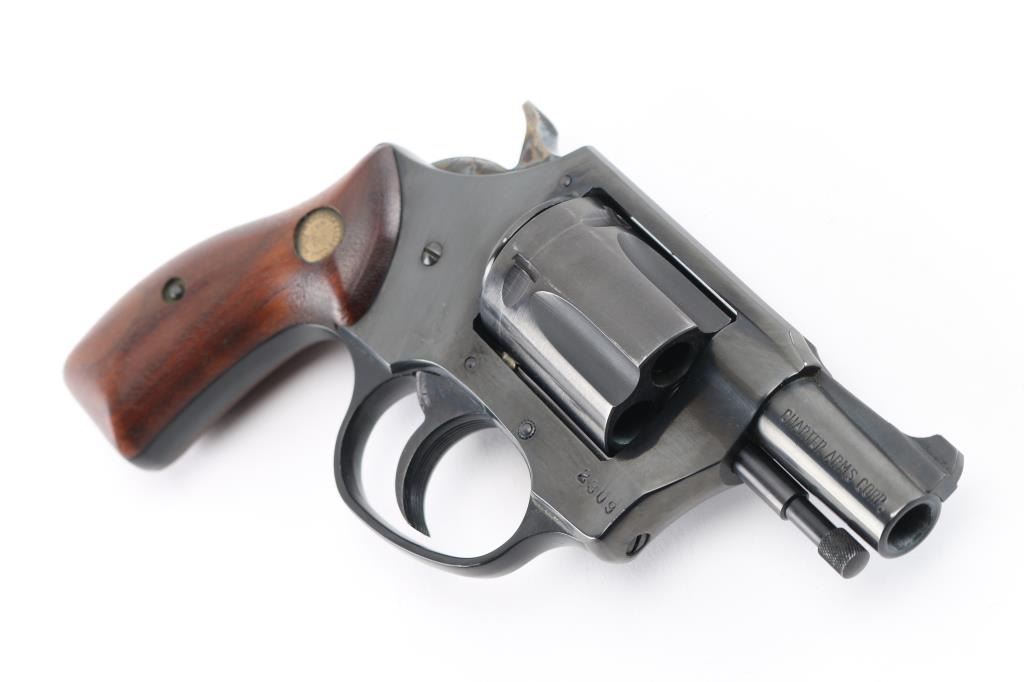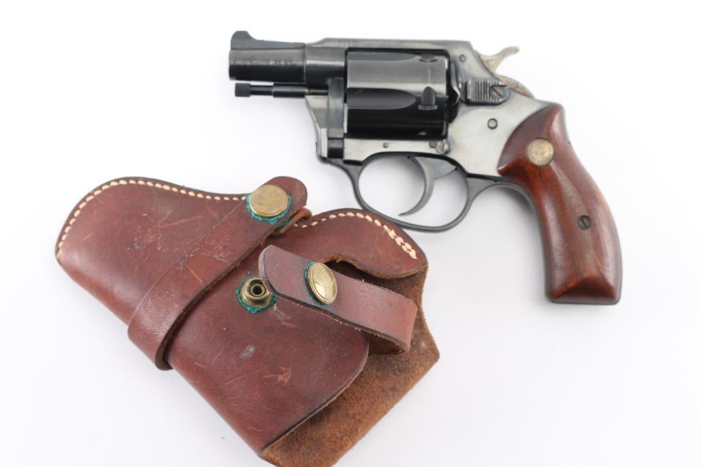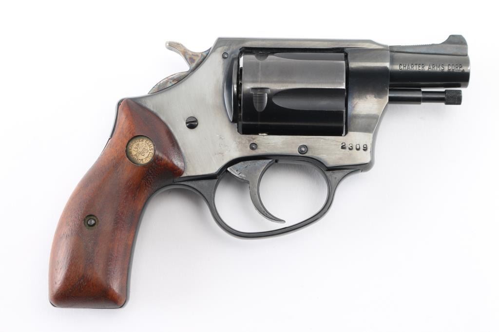 Double/Single action revolver features blued finish, smooth wood grips with Charter Arms medallions, 1.75" barrel, fixed sights, round butt. Bore is very good. Retains 98% blue with minor scratches. Grips are excellent condition. Action operates smoothly with tight lock-up. Comes with Hunter brown leather snap holster. Condition is NRA Very Good. Modern Firearm.