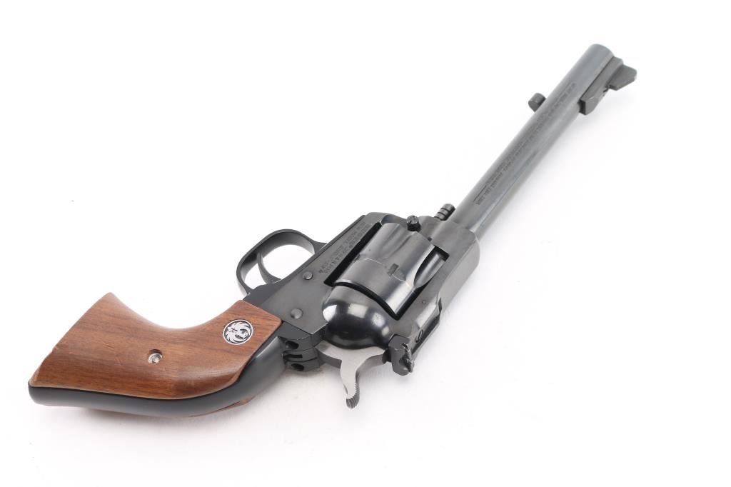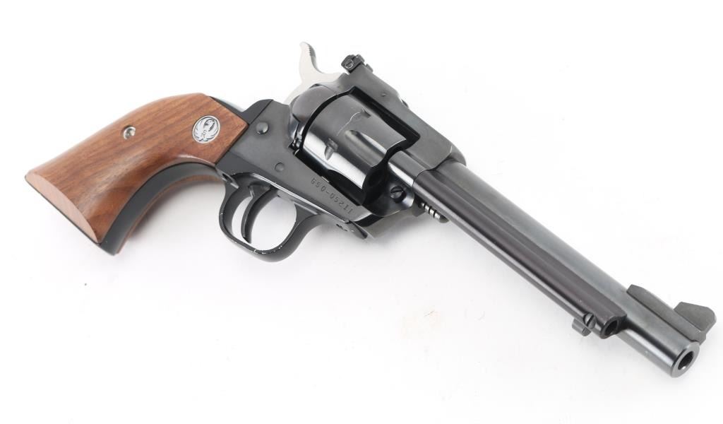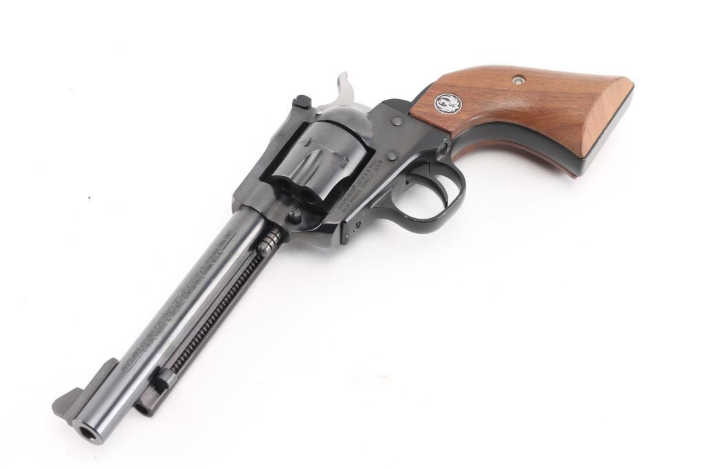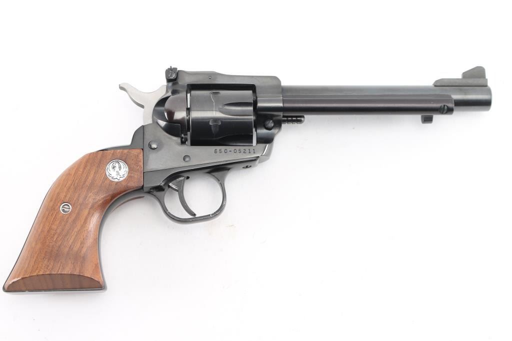 SN: 650-05211 Single action centerfire revolver manufactured circa 1984. Features blued finish, smooth wood grips with Ruger medallions, 5.5" barrel, ramped front & adjustable rear sights, fluted 6 shot cylinder. Bore is very good condition. Retains 95% blue with edge losses & handling marks. Wood grips are very good with few dents & scratches. Action is smooth with tight lock-up. Condition is NRA Excellent *** Modern Firearm ***