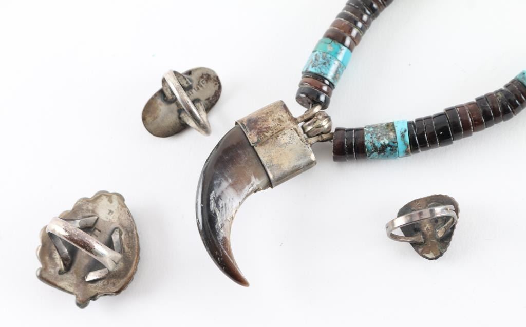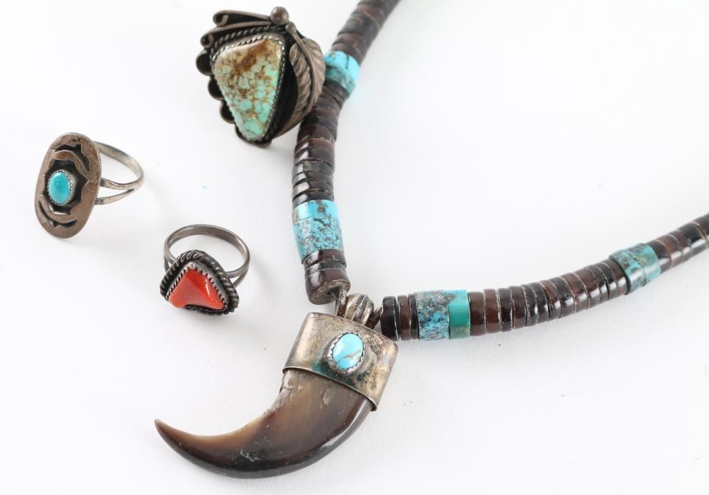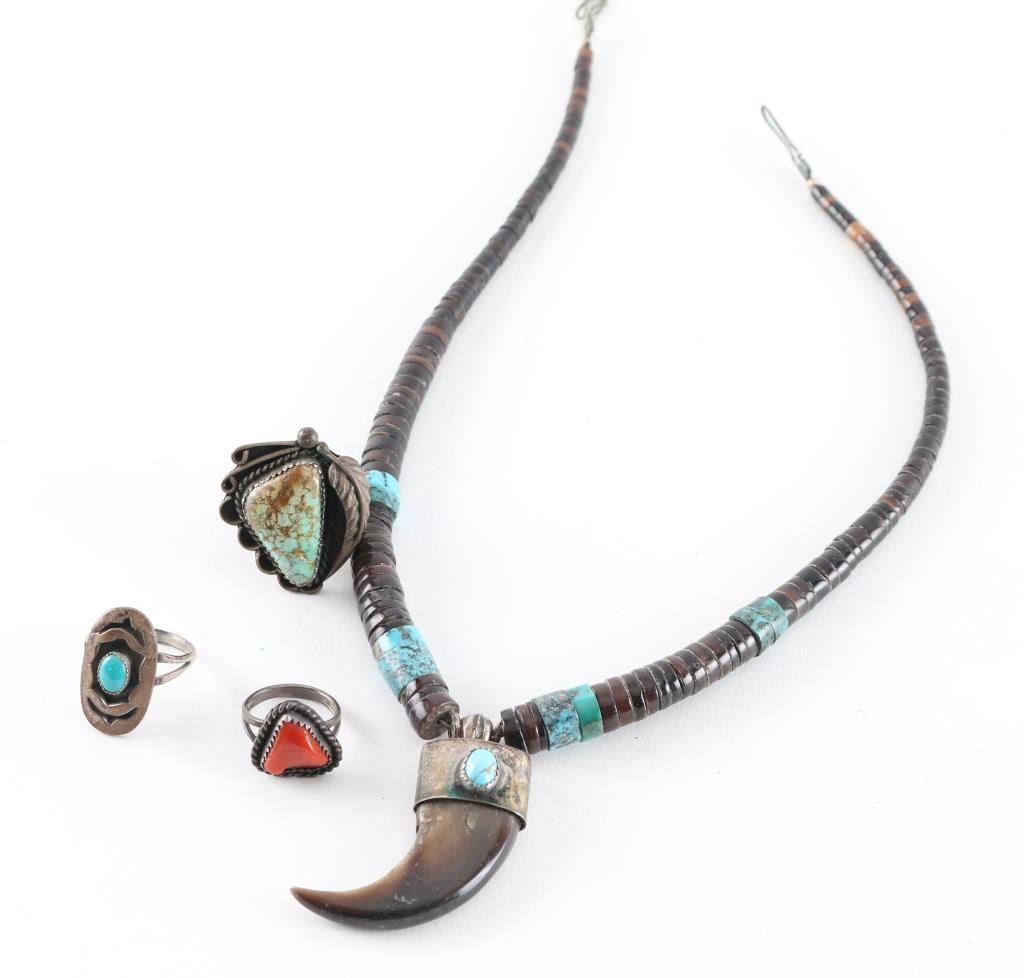 (1) Bear Claw Beaded Necklace (3) Navajo Rings
