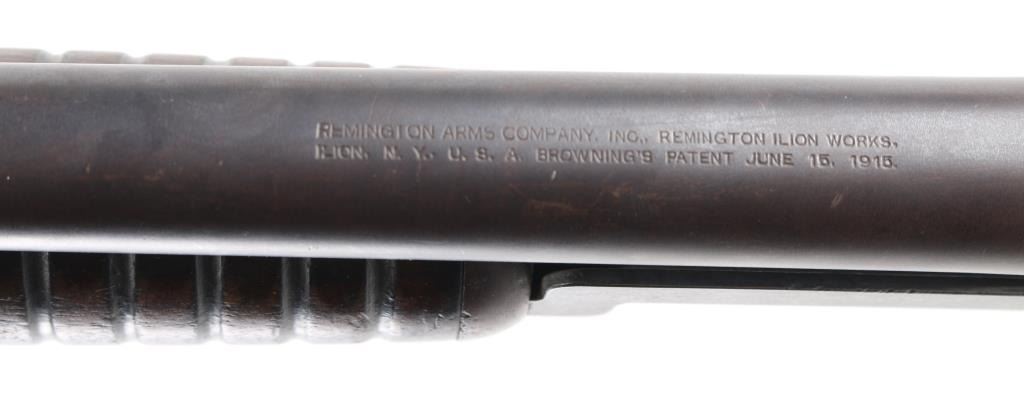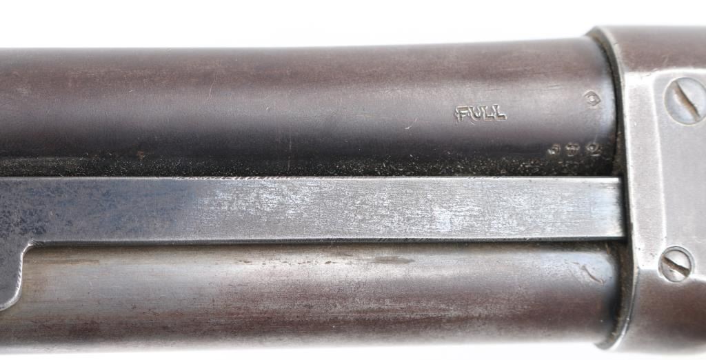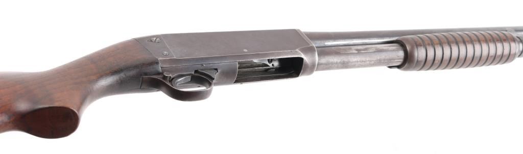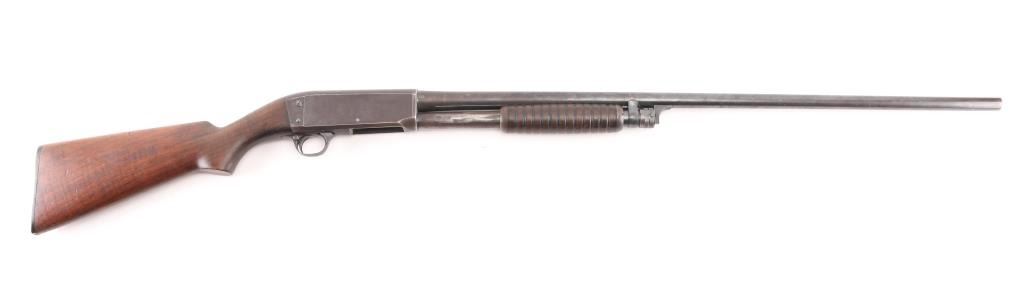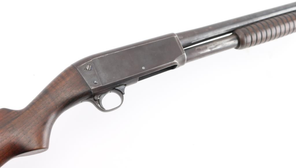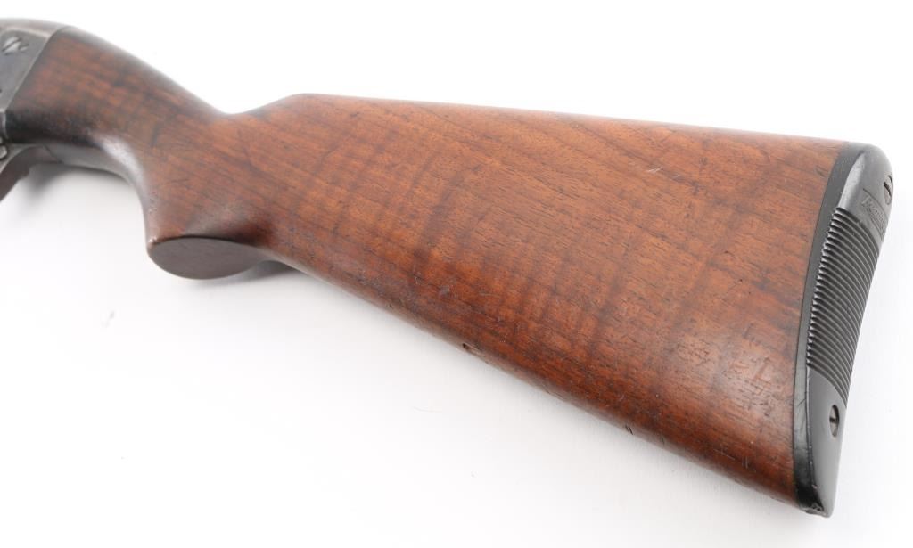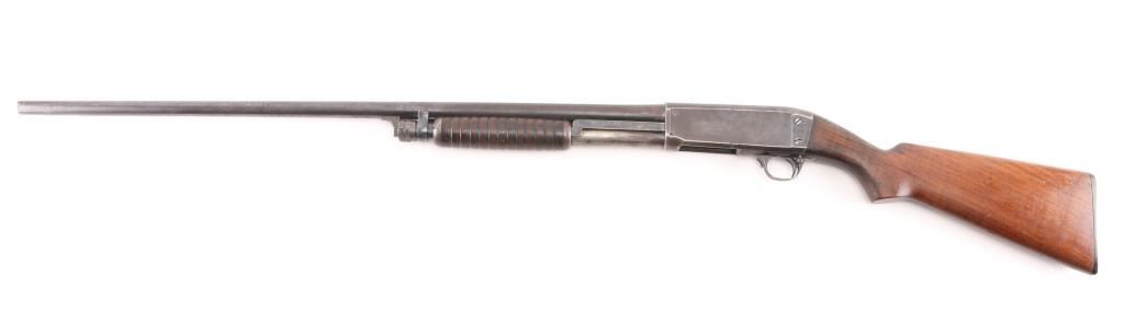 Pump action shotgun with barrel date code indicating manufactured circa 1921-41. Features blued finish, grooved wood pump handle, smooth wood semi-pistol grip shoulder stock, grooved hard rubber buttplate, pushbutton safety, solid receiver with bottom ejection, 30" plain barrel, Full choke, missing steel bead front sight. Bore is very good condition, Dusty. Retains 40% finish, turning a brown patina on receiver, wear areas from moving parts, edge losses. Wood is very good overall with scratches and some finish loss, a small hairline crack on the left wrist. Markings are crisp. Condition is NRA Fair. C&R Firearm.