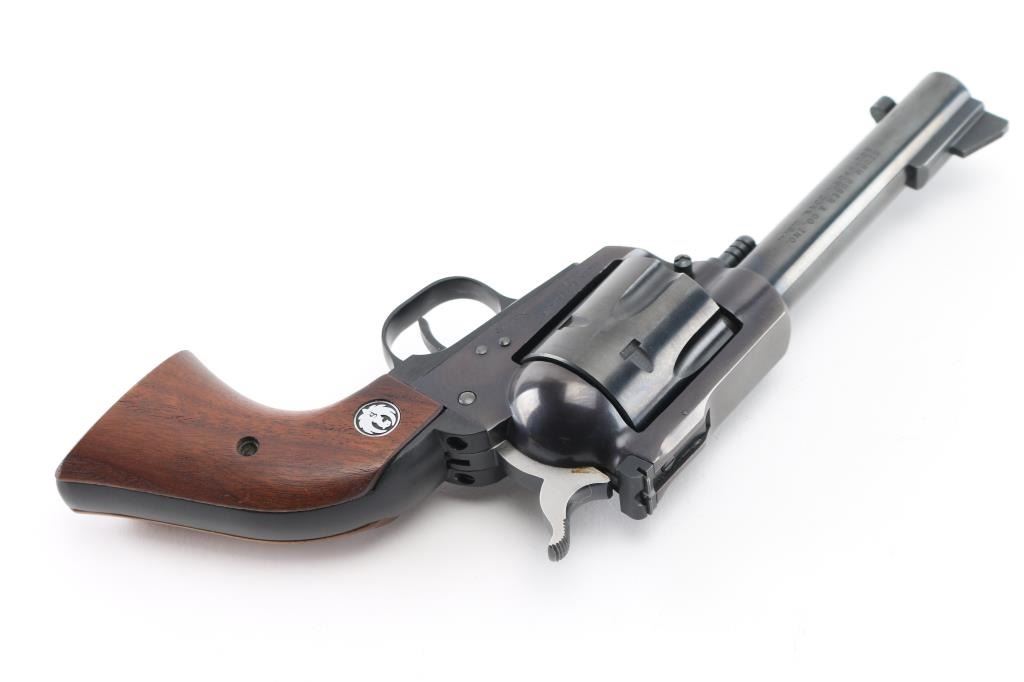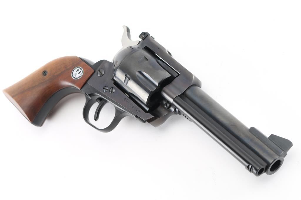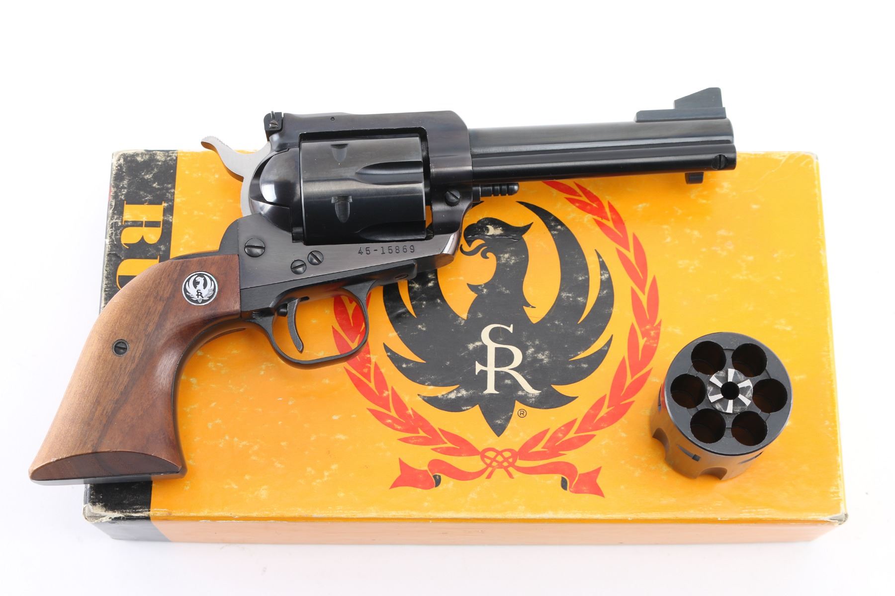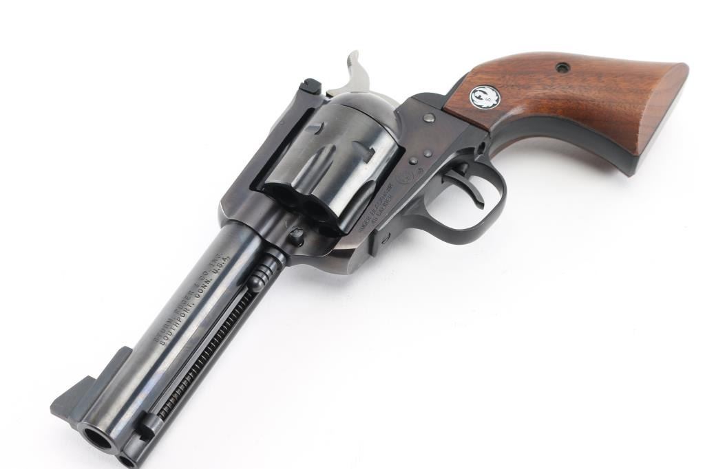 Single action six-shot revolver chambered in .45 Colt, convertible to 45 ACP. Features a blued finish, 4-5/8" cold hammer-forged barrel, raised serrated ramp front sight, adjustable rear sight with square notch, ejector rod, fluted cylinder, smooth trigger, serrated hammer spur, transfer bar safety, and two-piece smooth walnut grips with Ruger medallions Revolver exhibits 99% of the blue/black finish. Action is smooth with very good lock-up, the bore is excellent and the wood grips are fine. Includes 45 ACP cylinder. NRA Condition-Excellent. Modern Firearm.