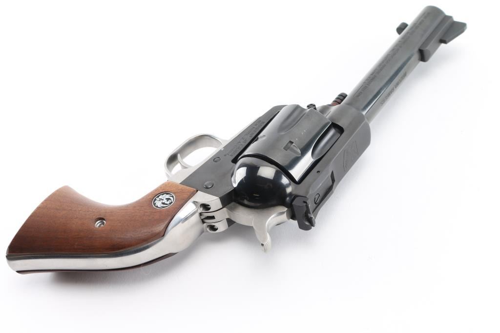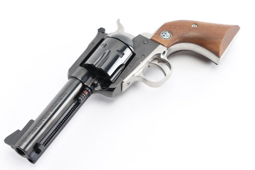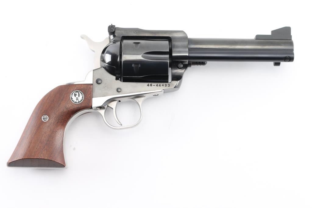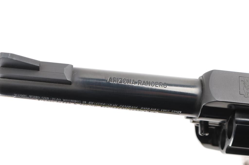 SN: 46-44493. Arizona Ranger Commemorative Single Action Revolver, circa 1979. Chambered in 45 Colt, sporting a 4-5/8'' barrel, blue finish, stainless steel grip frame, stainless hammer, smooth walnut grips with Ruger ''silver eagle'' medallions, standard blade front sight, and square-notched fully adjustable rear sight. Top of the barrel is marked ''ARIZONA RANGERS''; top of the frame with ''Arizona Rangers'' emblem.( Cowboy on horseback in desert in the outline of Arizona) This revolver is #221 of only 304 produced and is numbered on the butt. All of the factory lettering and commemorative markings are clear and defined. There is no sign of use with the exception of a very faint drag line on the cylinder. Grips are excellent, bore is excellent. Action is crisp, tight lock-up. NRA Condition-Excellent, like new. Modern Firearm.