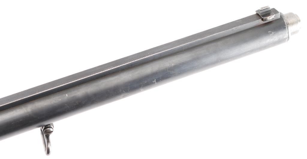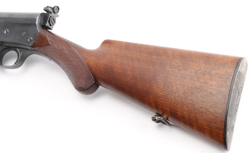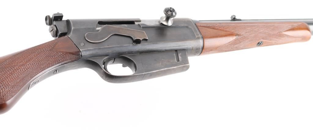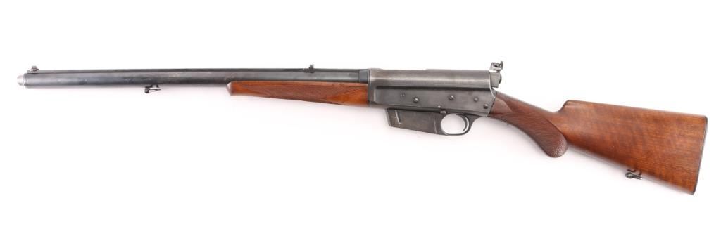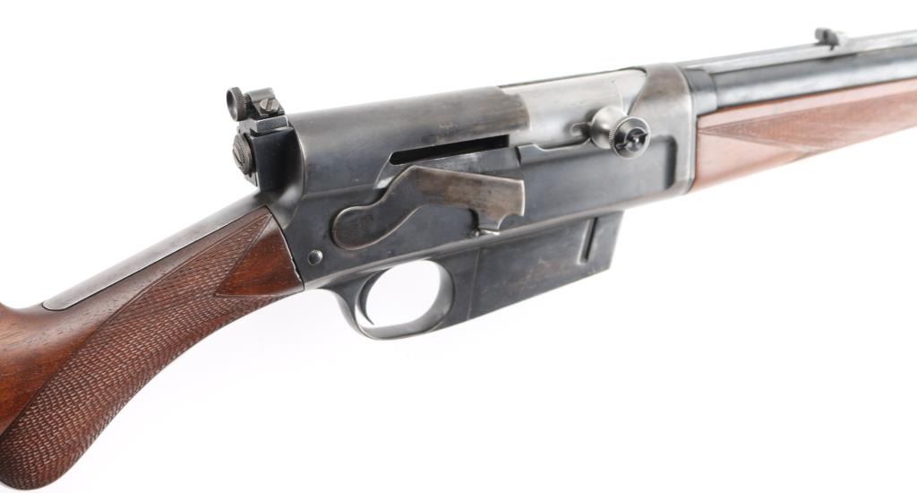 Vintage semiautomatic rifle, with less than 5000 manufactured in Belgium circa 1910-1929. The FN M1900 was basically the same rifle as the Remington model 8 with minor changes. Chambering not marked. Bore measures 35 cal, and historical sources indicate the FN version was only made in 35 Remington, but chambering needs gunsmith verification to provide certainty. Features blued finish, checkered walnut stocks with curved "Prince of Wales" type grip, 22" barrel, barrel jacket with raised solid matted rib, blade front and notch rear sights (2 settings selectable by flipping the hinged rear sight), adjustable rear peep sight mounted to receiver rear, fixed 5 round magazine with last round hold open, side lever safety, sling swivels, FN marked composition buttplate. Bore is very good. Appears reblued, with 85% coverage, some losses to edges of markings, some blemishes retained under finish. Shows edge losses, patina in places, some minimal denting to barrel jacket. Wood is very good with minor blemishes. Belgian proofed. Condition is NRA Very Good (possible reblue) *** C&R Firearm ***