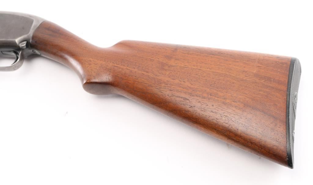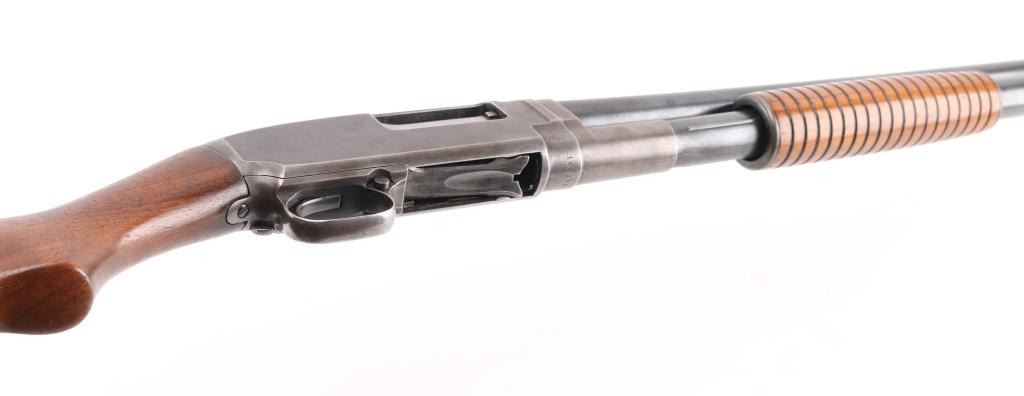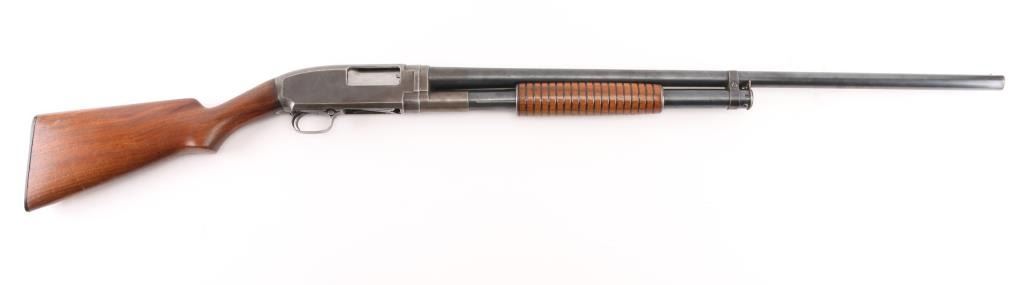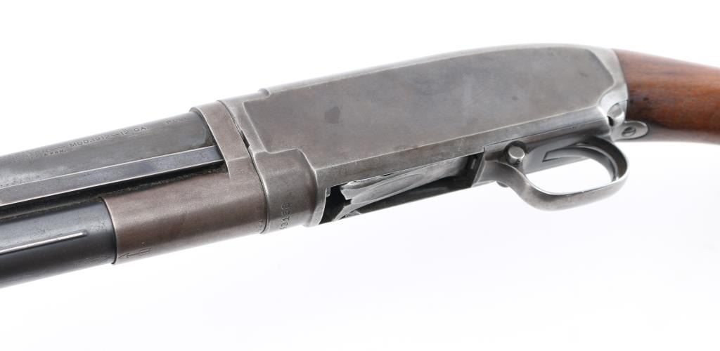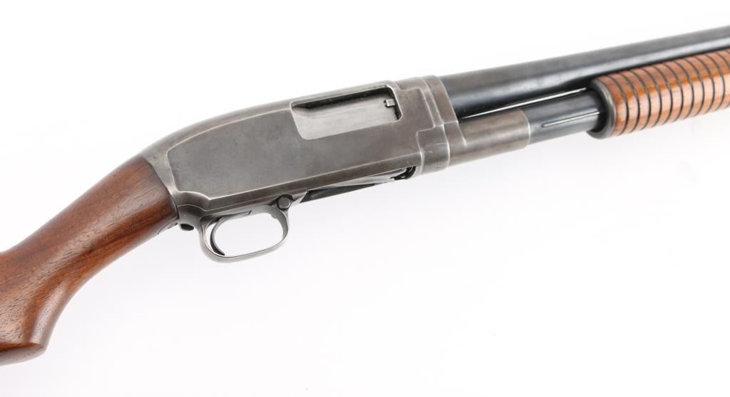 Take down pump action shotgun manufactured circa 1916. Features 30" plain barrel, barrel marked "FULL" choke, brass front bead, blued finish, wood stock & pump handle, factory plastic buttplate, manual safety. Bore is very good/bright. Retains 60% finish with edge wear, handling loss, mostly on the receiver, some darker bluing on barrel. Wood is very good with minor scratches.. Numbers match on receiver & extension. Condition is NRA Good. C&R Firearm.