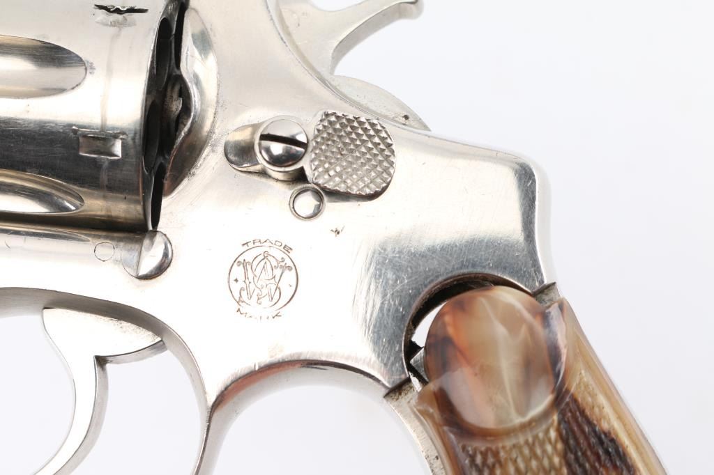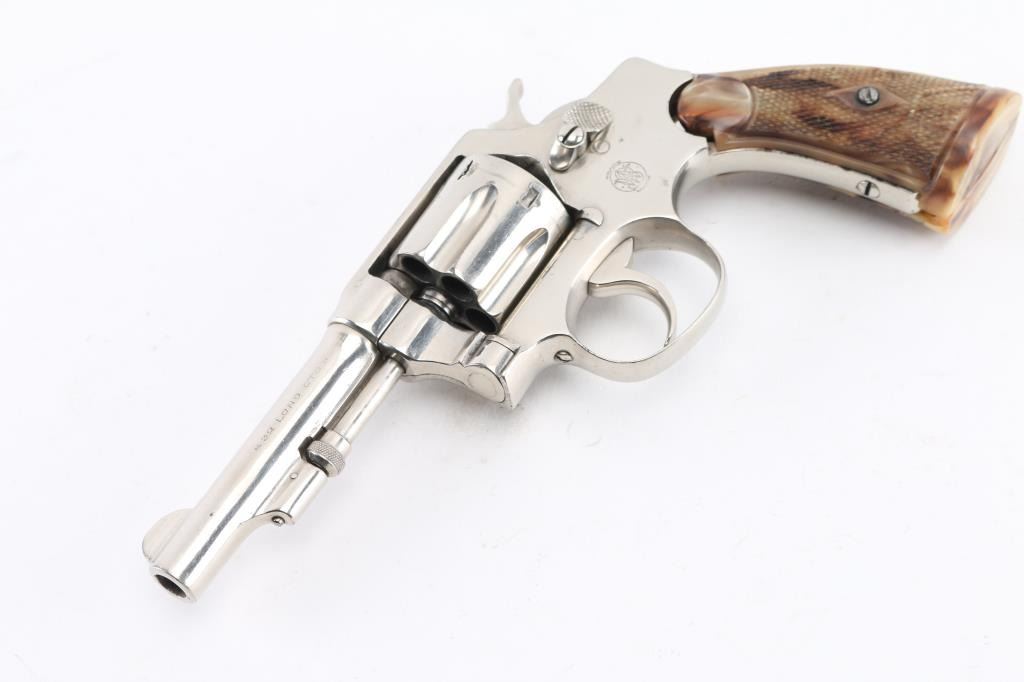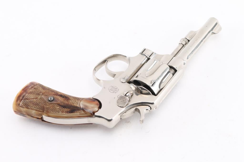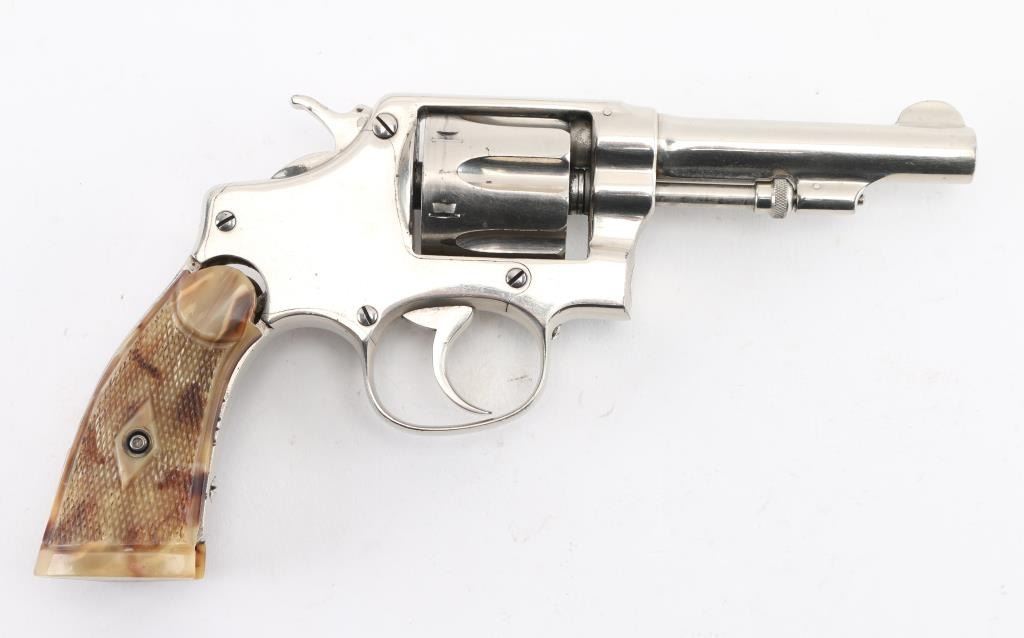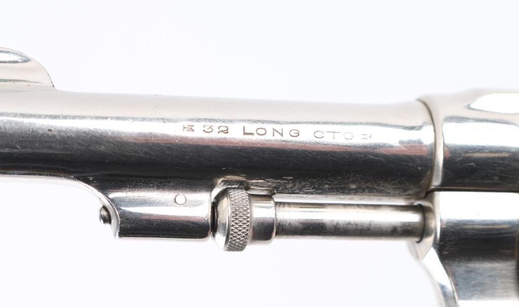 SN: 34288 'Second Change' Double action 6 shot revolver manufactured circa 1904-05. Refinished. Features 3.5" barrel chambered in .32 Long, half moon fixed front sight and fixed rear sight, cylinder swings out to load & unload, "five screw" K frame round butt, polished nickel finish, checkered "Franzite" synthetic conversion (change profile to square butt) grips. Bore is good or better condition with some light pitting. Nickel finish is very good with few blemishes, little clouding. Visible minor loss of contours at edges from heavy buffing. Grips are good condition overall, have shrunk, fair fit to frame, screw too long. Numbers on barrel & cylinder match frame. Action has mechanical issues, cylinder bolt does not lock up properly. Condition is NRA Fair - needs repair *** C&R Firearm ***