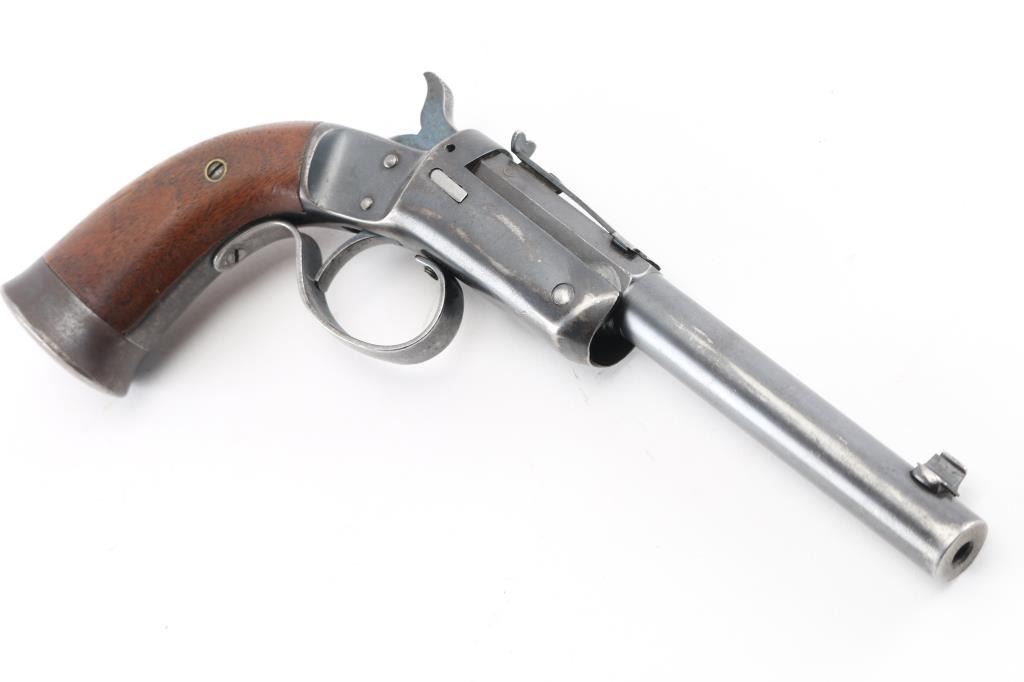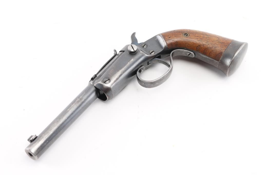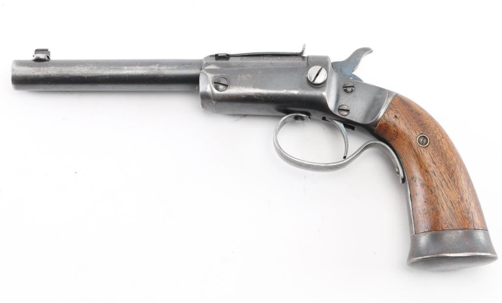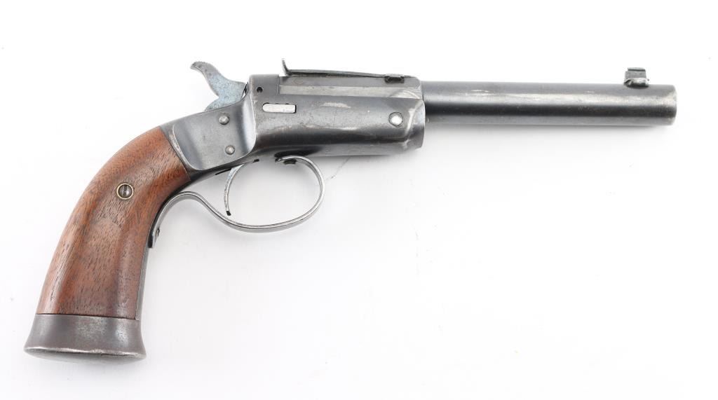 Vintage American made single shot rimfire pistol manufactured circa 1929-1942. Features blued finish, 6" part octagon/part round tip-up barrel, automatic extractor, dovetailed blade front sight, sporting rear sight, smooth trigger, knurled hammer spur, stamped steel trigger guard, weighted & flared butt cap, and two-piece smooth walnut grips. Bore is very good condition. Retains 75% finish, thinning or showing bare metal in places, with scratches and other handling marks. Bright blue color on sides of hammer. Grips are very good, showing small dents. Action is smooth. Condition is NRA Very Good+ *** C&R Firearm ***