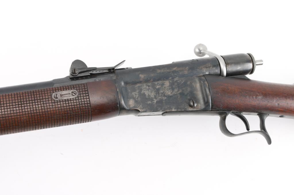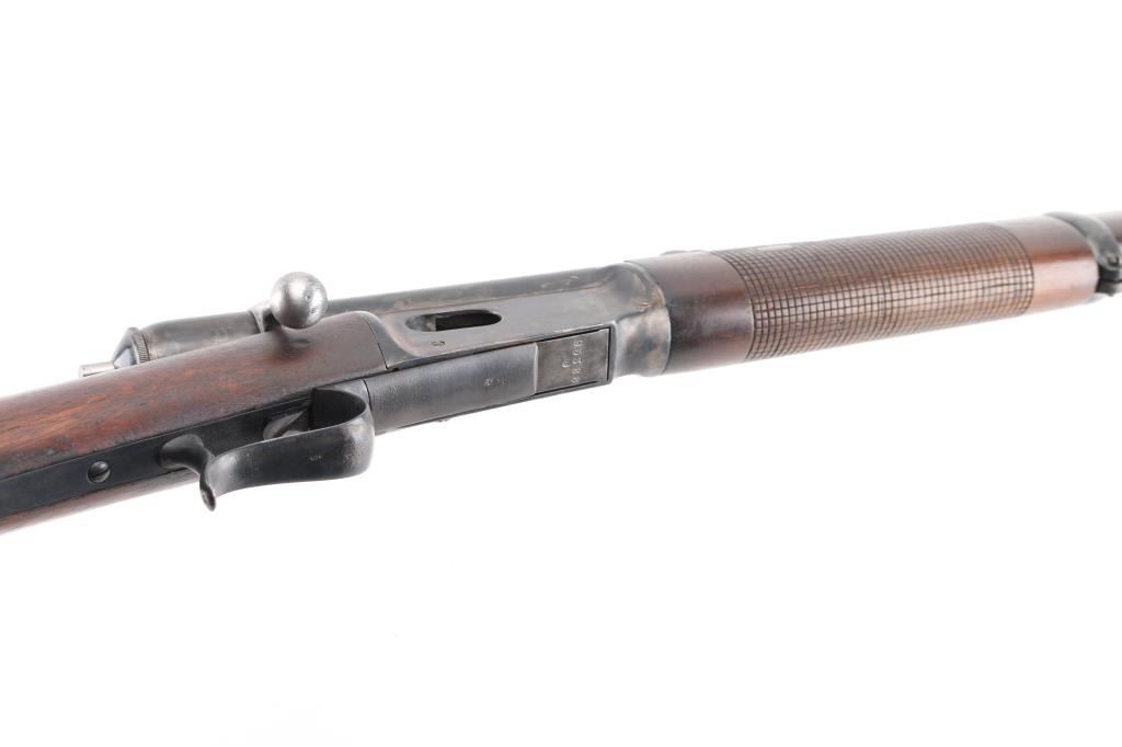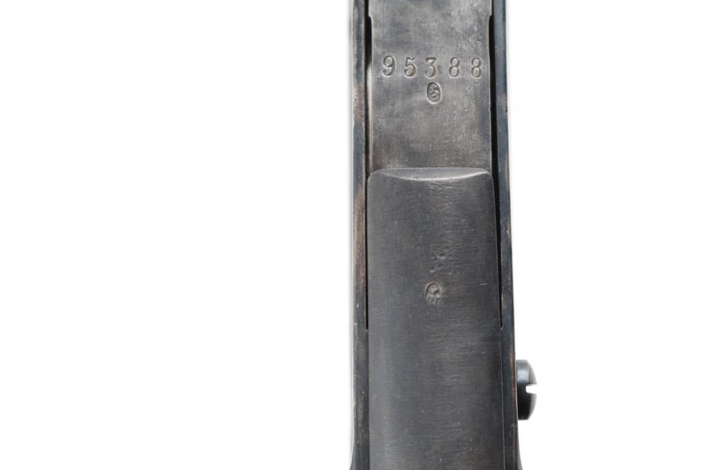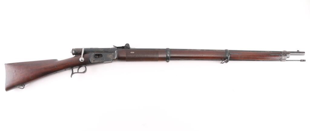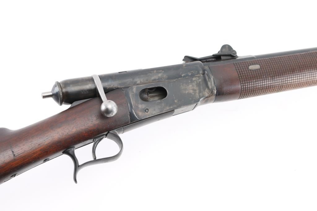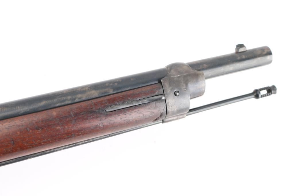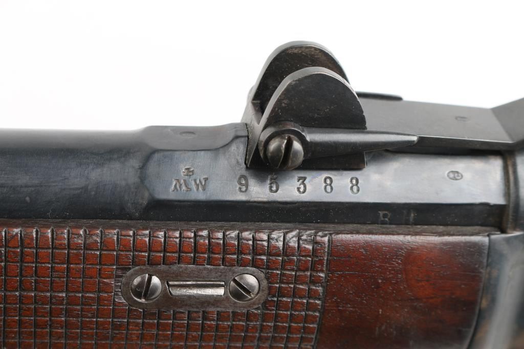 SN: 95388 Antique Swiss military tube-fed bolt action rimfire service rifle. Marked "MW" for 'Montierwerkstätte, Bern'. Features a blued finish, 33" barrel, blade front sight, elevation adjustable rear sight, tubular magazine under barrel, smooth trigger, finger rest trigger guard, cocked indicator on the rear if the bolt, cleaning rod, straight grip shoulder stock with smooth metal buttplate and cross hatching on forend. Matching serial numbers are found on the barrel, receiver and lifter. Bore is good condition, bright with some area of shallow pitting. Retains 60% blued finish, mottled in many areas where cleaned. Wood is very good condition, many small dents, slight erosion at toe. Condition is NRA Fine *** Antique Firearm ***