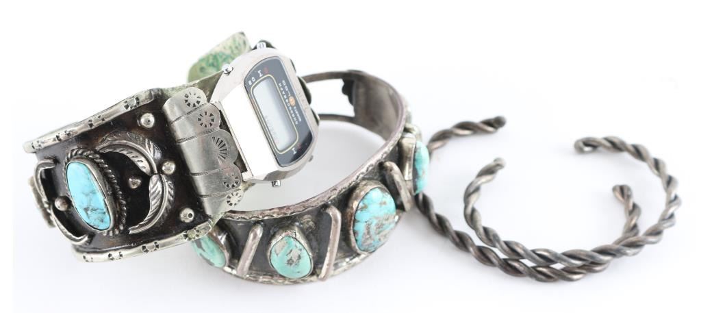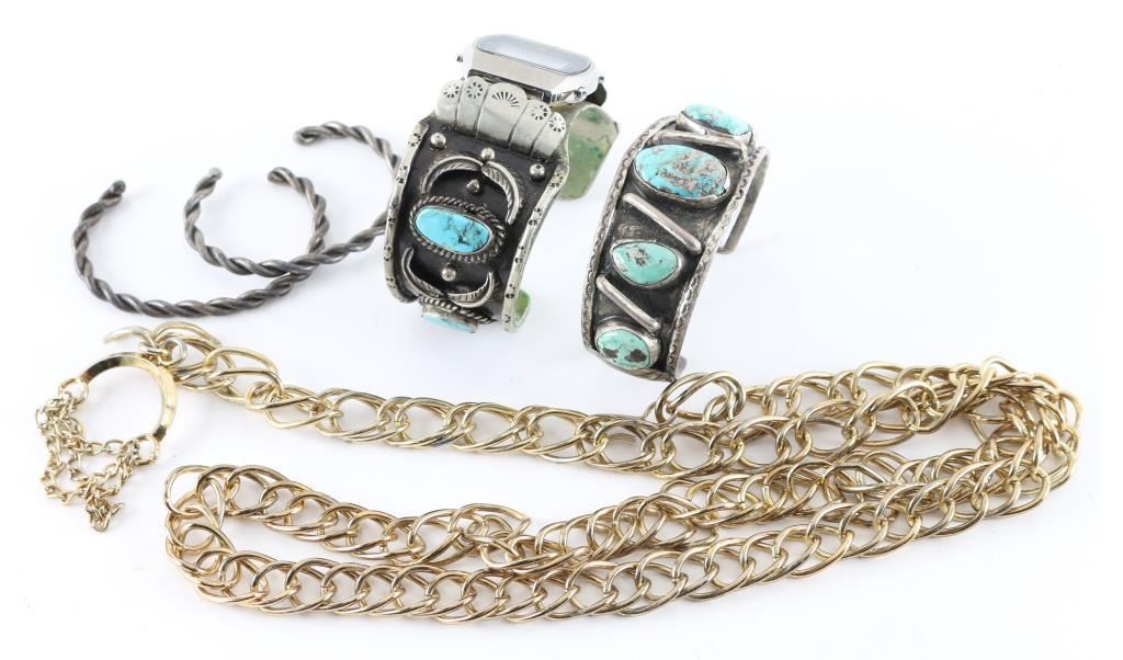 Old Navajo plated turquoise cuff, Old Navajo Watchband cuff nickeled with turquoise, Costume linked belt, and two twisted style cuff bracelets.