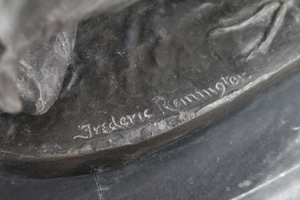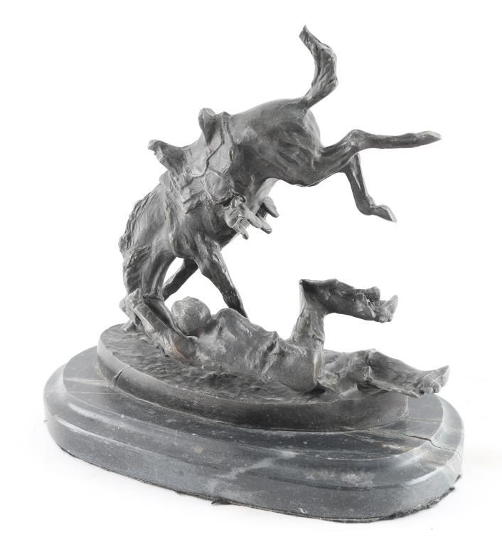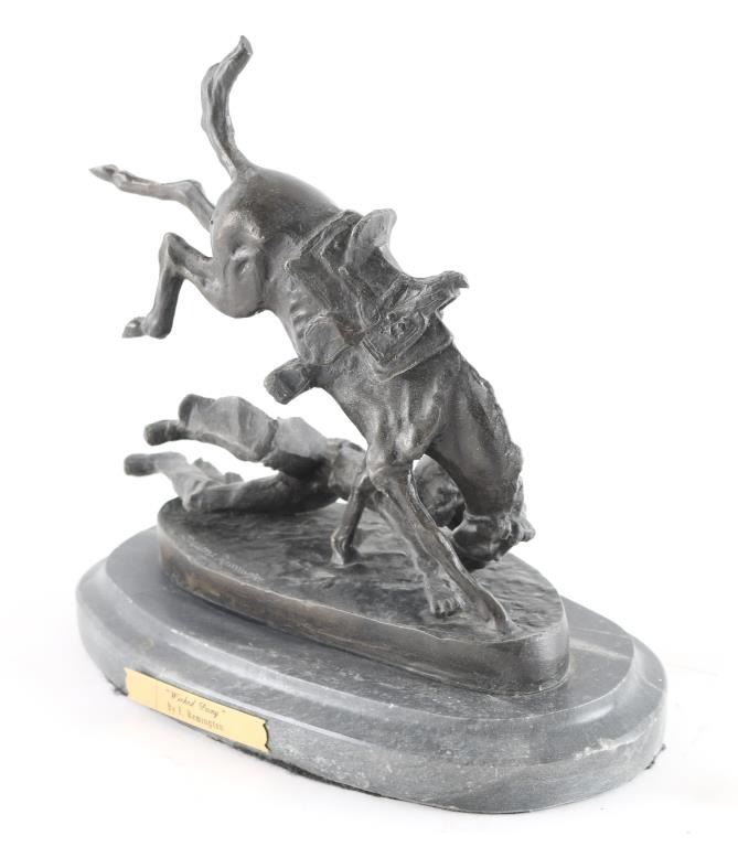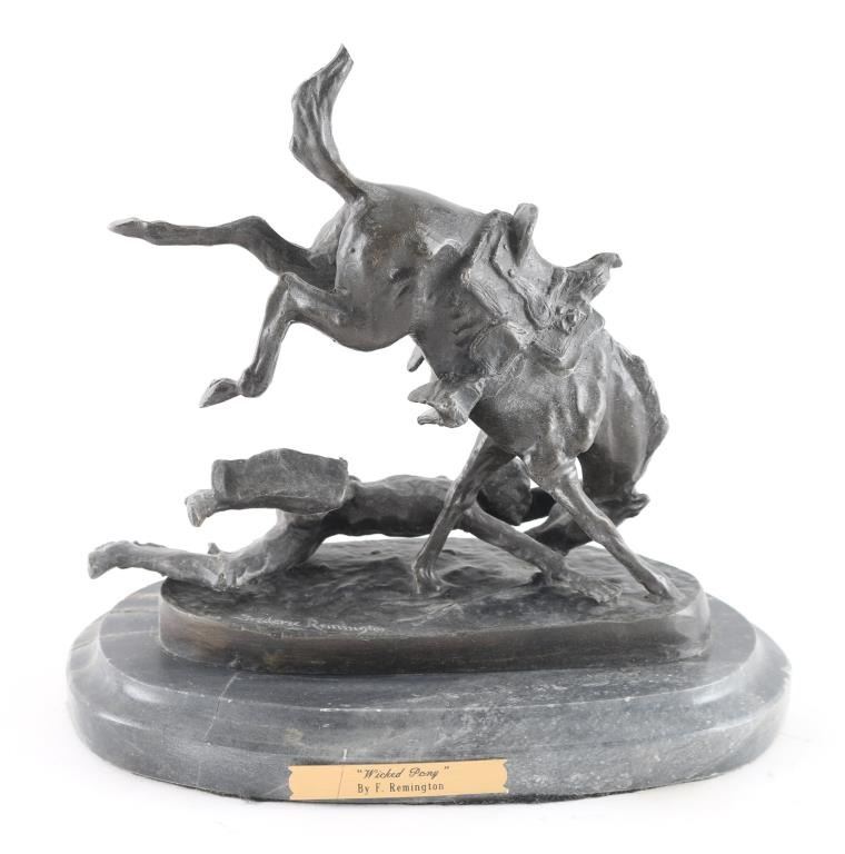 By famous artist Frederic Remington entitled "Wicked Pony" signed on base. Mounted on marble base, measures 9x7".
