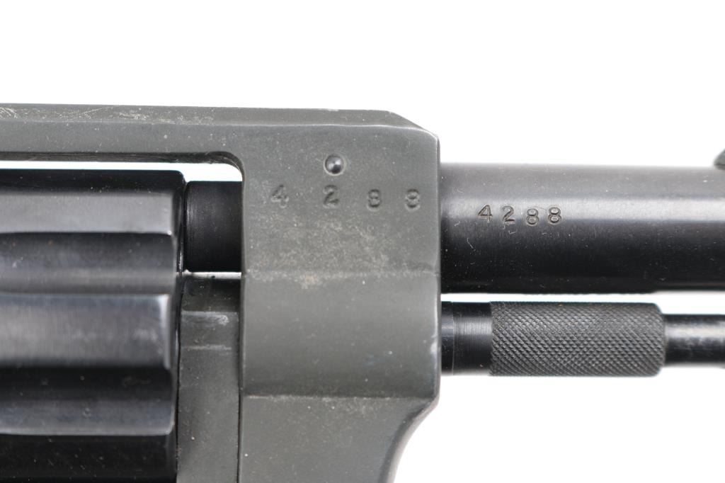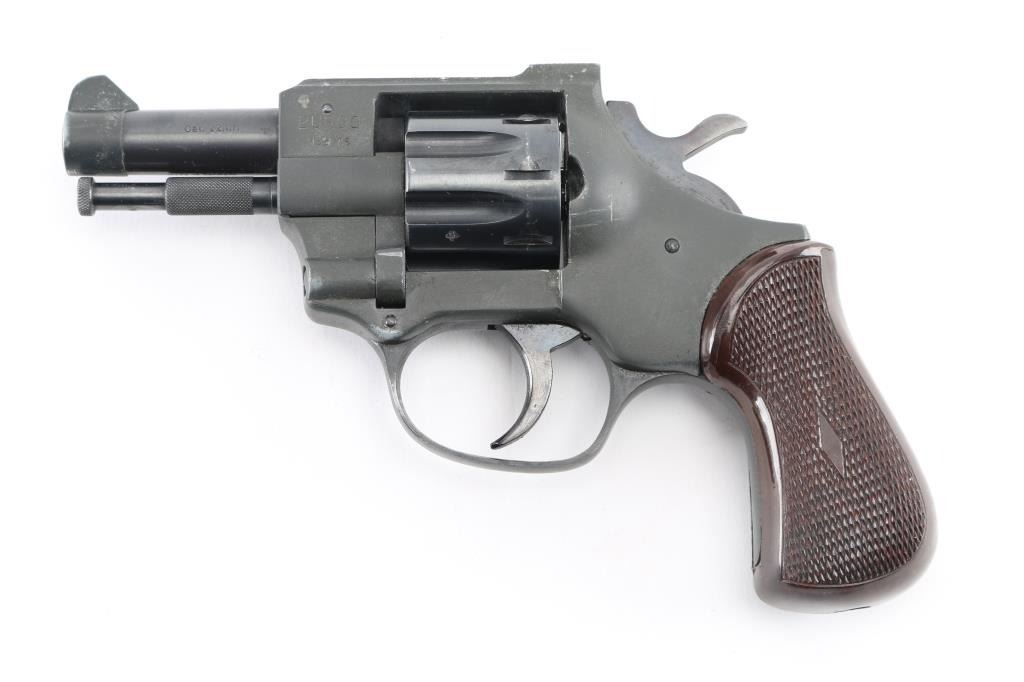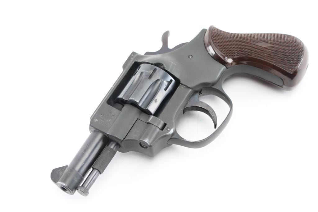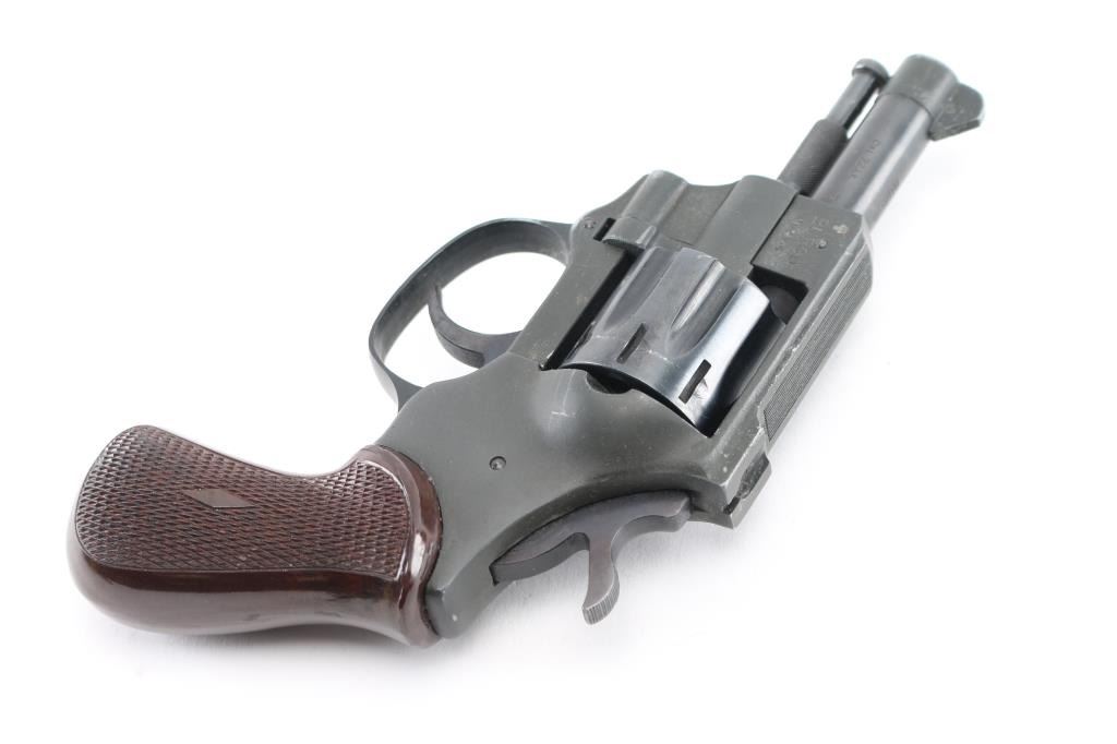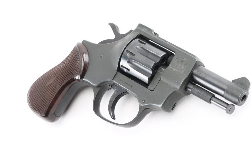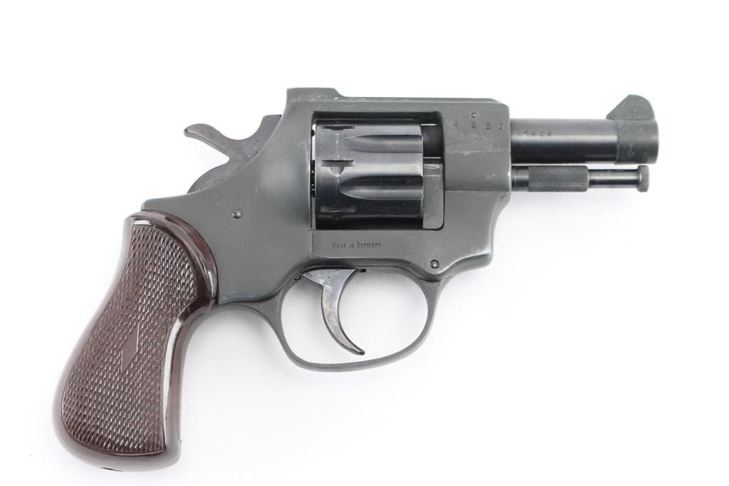 German made double action revolver. No importer markings. Features blued cylinder, dark color parkerized finish on the alloy frame & barrel sleeve, fixed sights, 2.5" barrel, 8 shot fluted cylinder, checkered brown plastic grips. Ejector rod pulls forward to unlock cylinder, allowing it to swing open. Bore is very good. Retains 95% finish with handling marks. Surface finish appears a bit rough under what appears to be a factory finish. Grips are pristine. Action is smooth, lock-up is good. Condition is NRA Excellent *** Modern Firearm ***