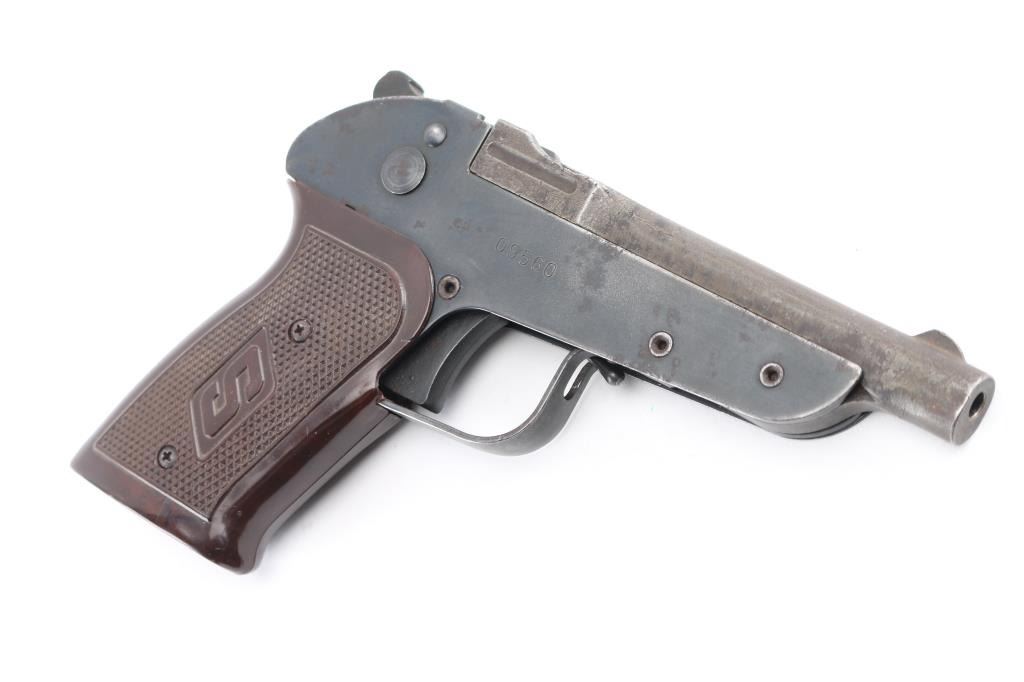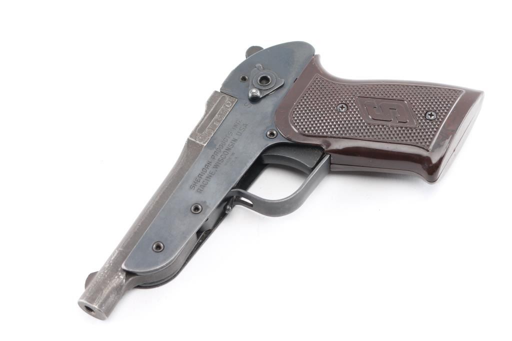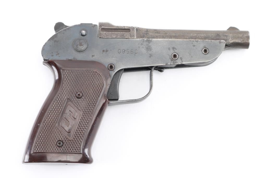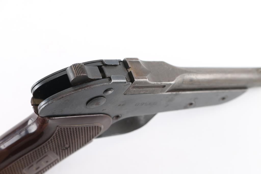 Single shot break open pistol manufactured circa 1953-1960. Often referred to as the "Knocabout', although not so marked. Features blued finish, checkered brown plastic grips, 5" barrel, small opening latch in front of triggerguard, fixed sights, rotating manual safety on frame blocks the hammer from hitting the firing pin. Single action with exposed hammer. Bore is very good, dirty, might improve with cleaning. Retains 90% finish, small amounts of patina throughout frame, fading towards gray color on cast barrel. Grips are pristine. Condition is NRA Very Good+ *** C&R Firearm ***