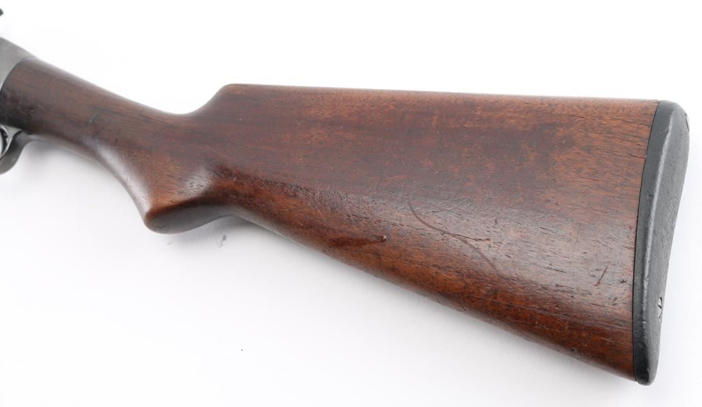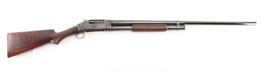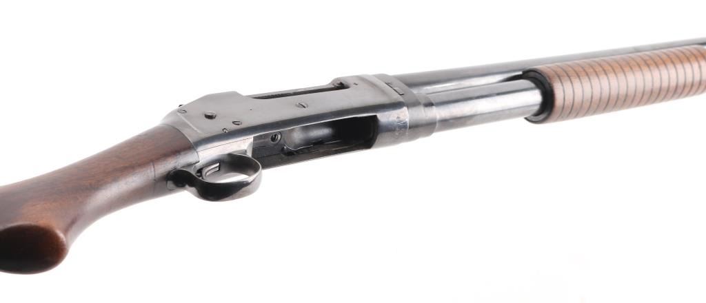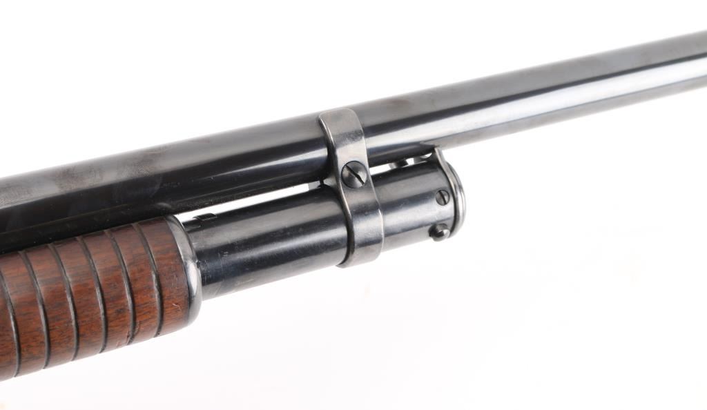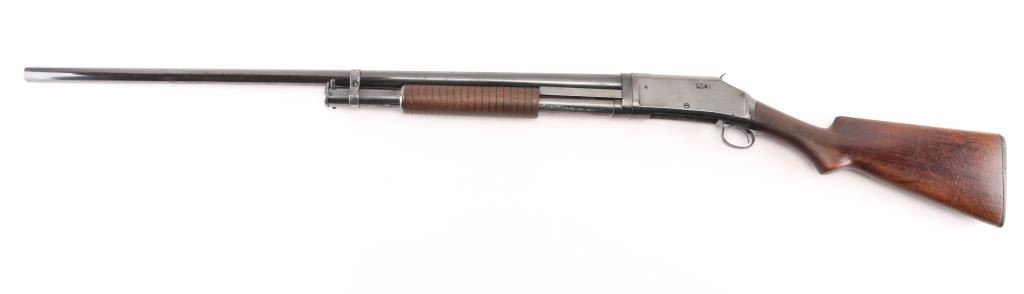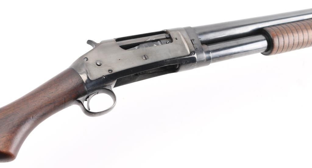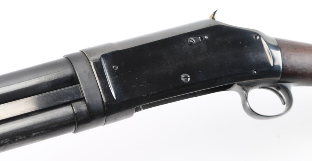 Refinished American made shotgun, designed by John Moses Browning, manufactured in 1908, pump action, 32" barrel, integral full choke, bore has scattered light pitting, bead front sight, groove rear sight in receiver, external hammer, smooth trigger, wood stocks, approximately 96% reblue remaining, minor scratches, friction on the tube, action is crisp, The 1897 was identical to its 1893 forerunner, except that the receiver was thicker and allowed for use of smokeless powder shells. The serial numbers match on the barrel and receiver. Markings are faint due to the refinish, the hammer as a repair braised with brass, worn factory buttplate. NRA Condition-Good/Refinished. C&R Firearm.
