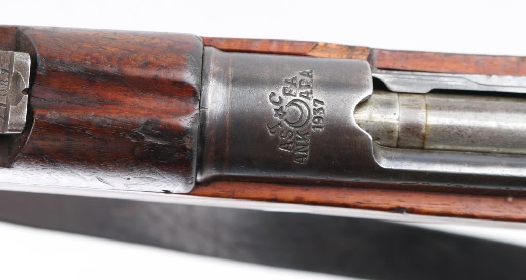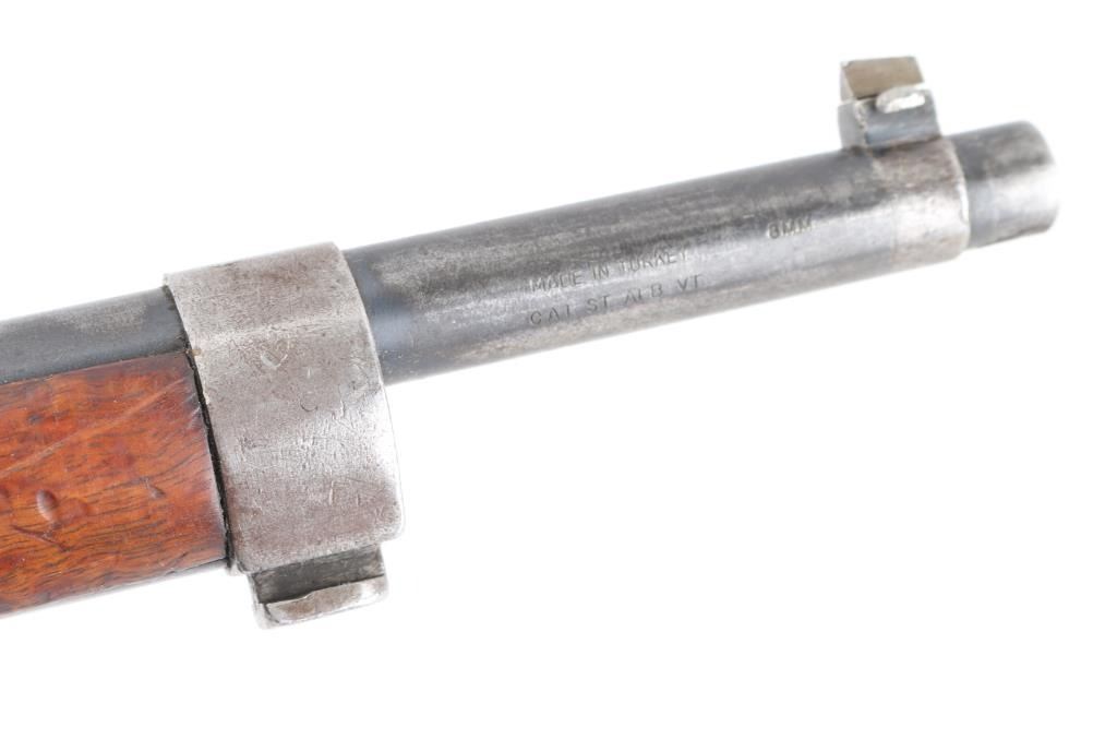 Turkish military bolt action rifle built by the ASFA Ankara Rifle Factory and imported by CAI, Georgia VT. Chamber dated 1937. Features blued finish, wood stock & handguard, 29" barrel, blade front sight, tangent rear sight, bayonet lug, no cleaning rod, sling swivels, straight bolt handle, manual safety. Bore is good condition, frosted with strong rifling. Retains 60% blue with large areas fading to brown or bare metal. Stock is good condition, showing many small dents & scrapes. Handguard is fair, darker color than stock.. Includes fair condition leather sling. Condition is NRA Good. C&R firearm.