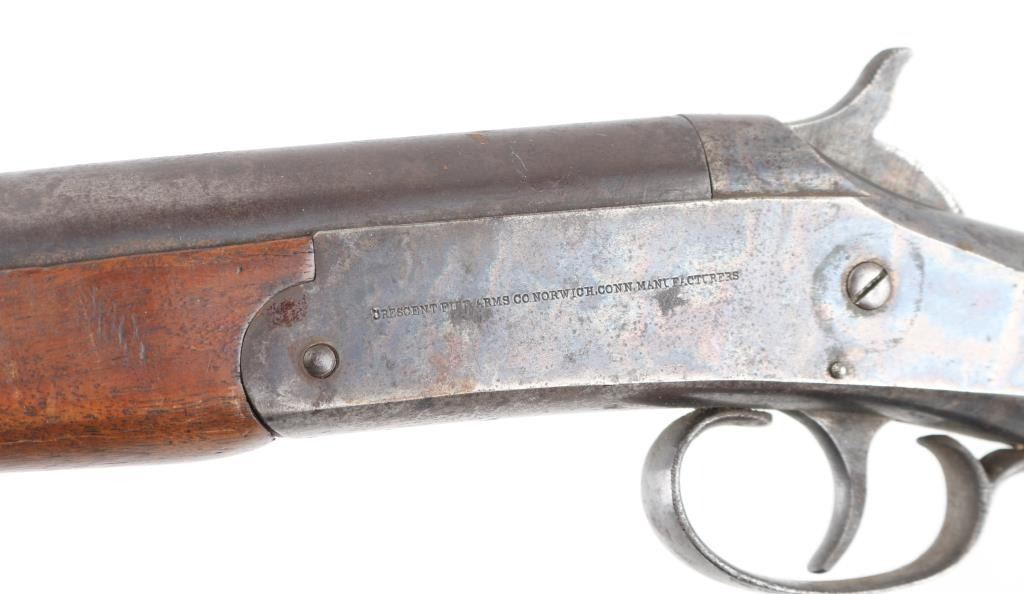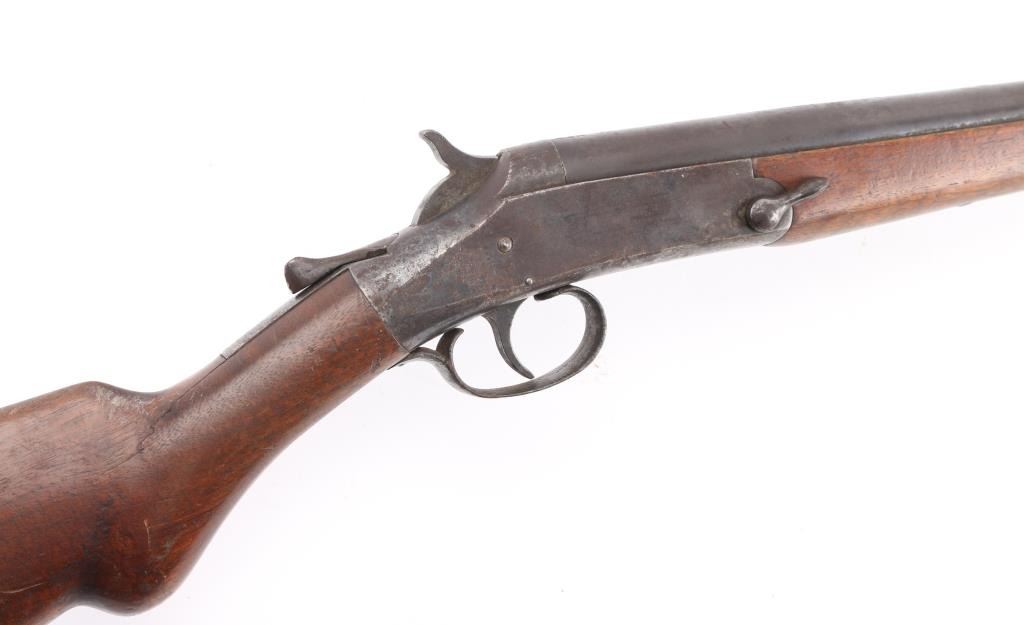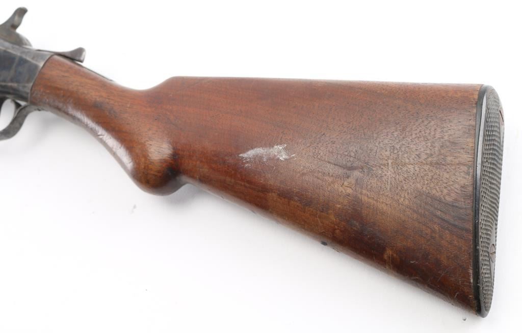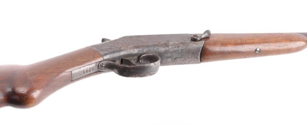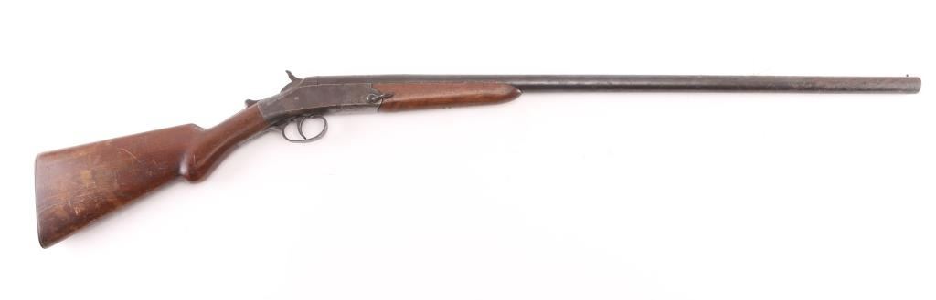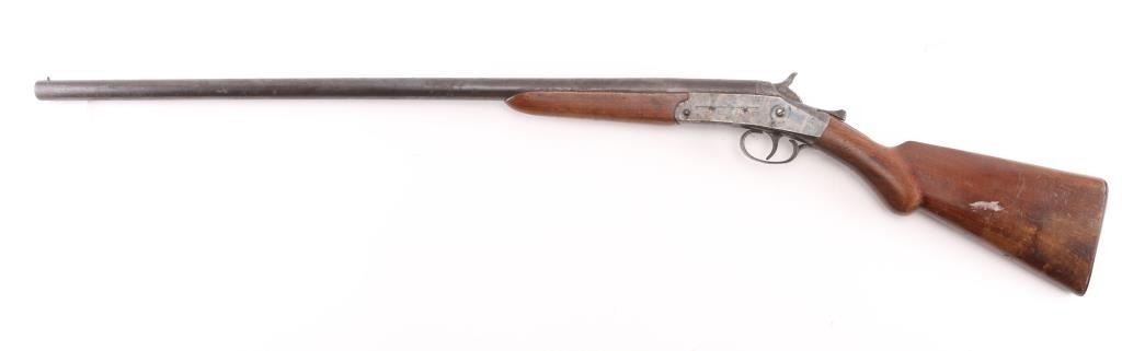 SN: 5781. Vintage single shot break-open shotgun with a blued finish, 30" barrel, automatic ejector, brass bead front sight, smooth trigger, knurled hammer spur, knurled top lever, smooth wood forend and pistol grip shoulder stock stock with factory buttplate. Shotgun displays a aged brown patina on the majority if it's metal surfaces, with scattered rust spots. Action is sound, the bore is rough, needs cleaning and the wood stocks are sound. Matching serial numbers. Condition is NRA Good. C&R Firearm.