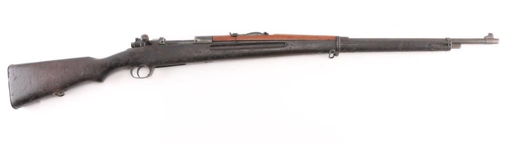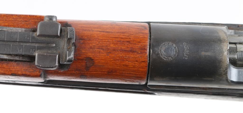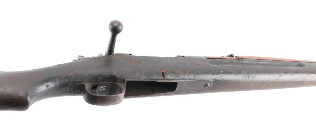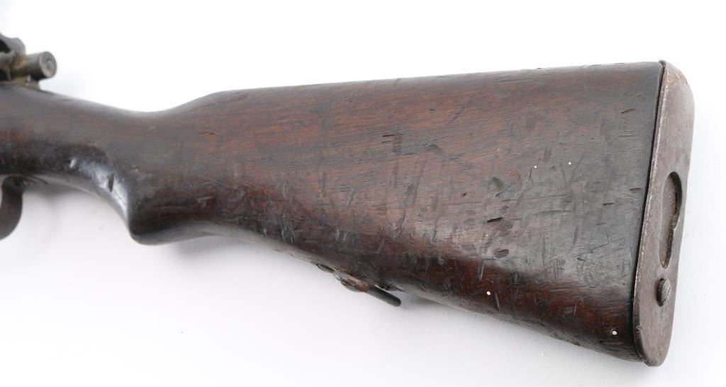 8x52R NVSN Siamese military bolt action service rifle chambered in 8x52Rmm, produced in Japan at the Koishikawa Arsenal. Features a blued finish, 29" barrel, dovetailed inverted 'v' front sight, rear tangent sight, straight bolt handle, manual safety, smooth trigger, internal box magazine, missing spring/follower, & floor plate. sling swivels, smooth wood handguard and semi-pistol grip shoulder stock with trapdoor metal buttplate. Missing front barrel band spring, no cleaning rod. Rifle exhibits an even dark brown patina with spots of emerging surface rust on the barrel near the muzzle and some scattered pin prick pitting found throughout. Action is smooth, bore is poor dark/rough with pitting and wood stock has numerous dents, handguard is a lighter color. Condition is Poor. C&R Firearm.