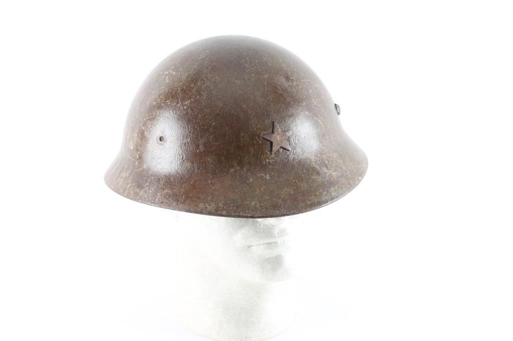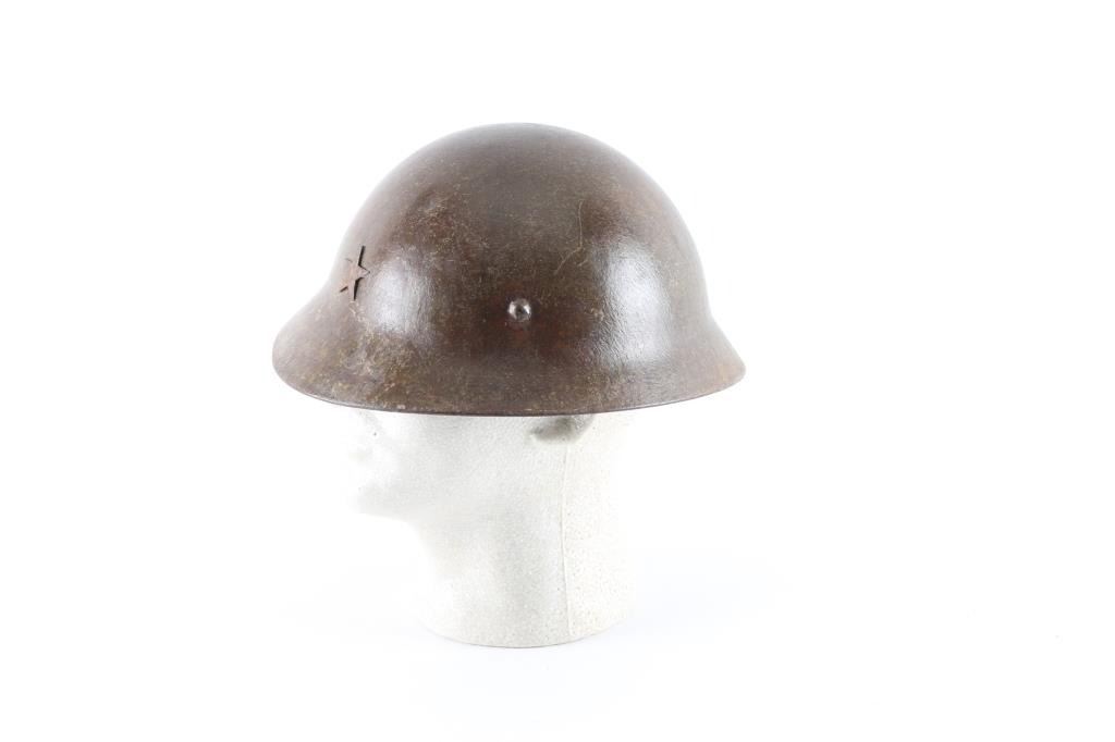 This is a rare Type 90 Civil defense helmet which was issued for use in the Imperial Japanese Army, hence the addition of the five pointed IJA star which was added to the front. This is a rare and little known variation of the military issue type 90 Tetsubo helmet. The Japanese WWII Civil Defense helmet was the final of four variations of the Type 90 Army helmet and was designed specifically for mainland civil defense. Standard original paint in the shade of "dead Grass", no liner or chinstrap.