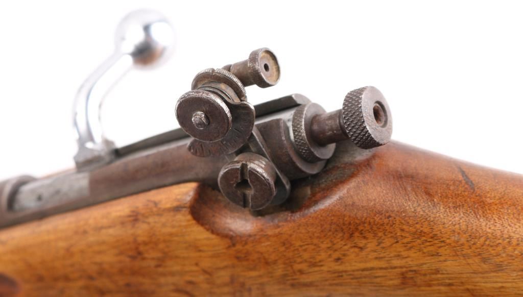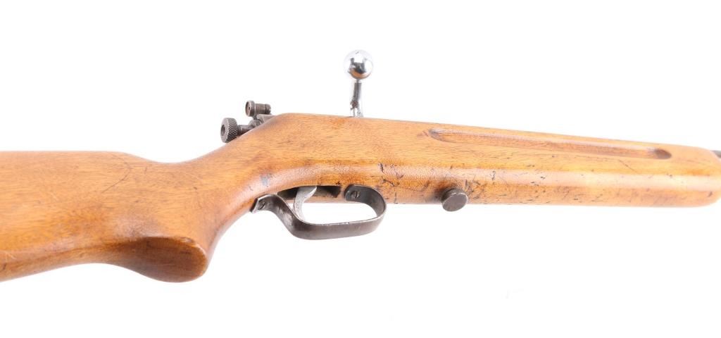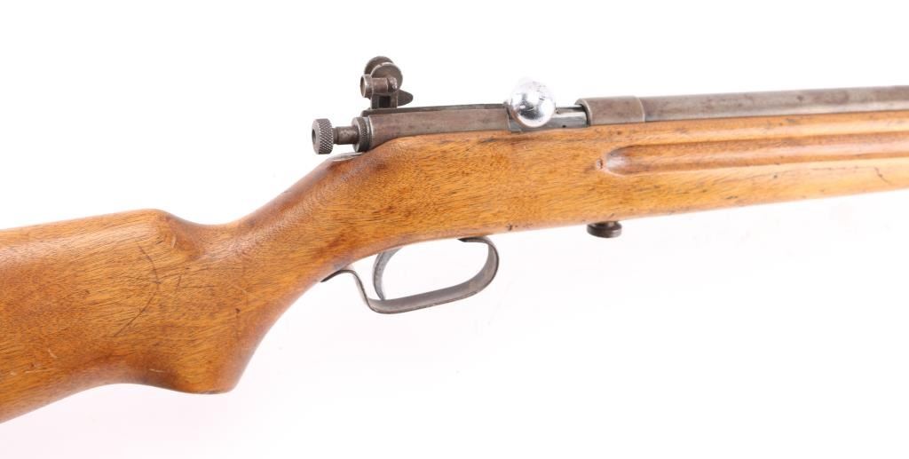 Vintage , single-shot, bolt action rimfire rifle. Made by Mossberg 1935-37, sold by Montgomery Wards . Features a 22' round barrel with blade front and adjustable peep sight mounted to the receiver, cocking knob on bolt, one piece wood stock with grasping grooves, steel buttplate. Bore is very good/bright, action works fine, wood is sound with minor scratches/dings, finish has turned a gray/brown patina. A good starter rifle. Must be cocked to fire. NRA Condition-Good. C&R Firearm.