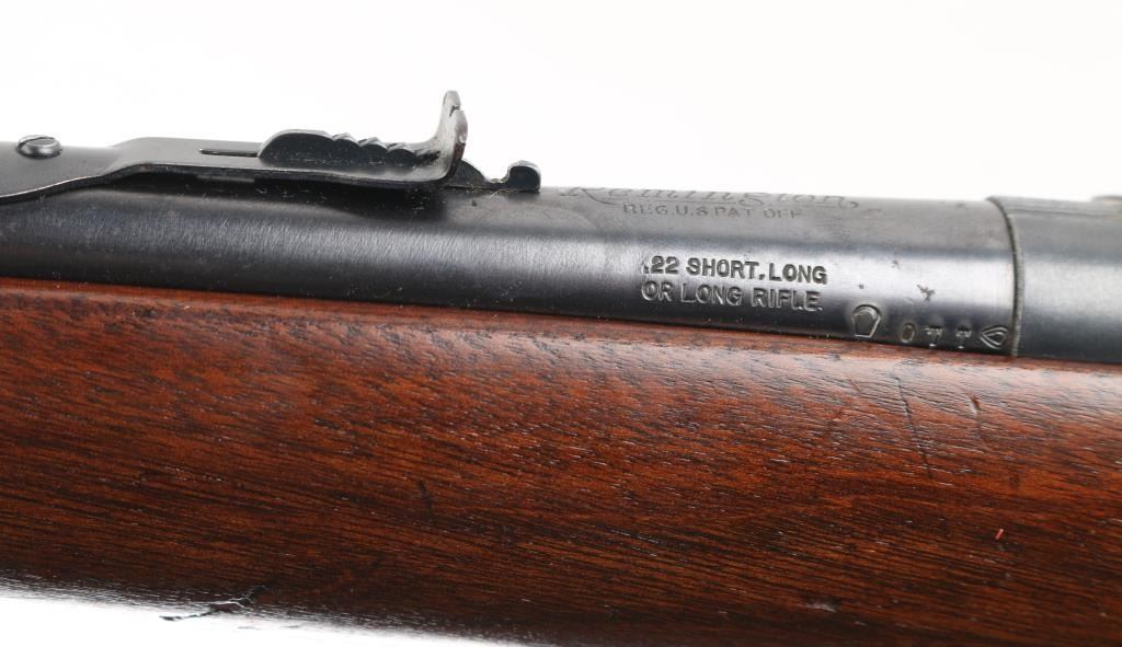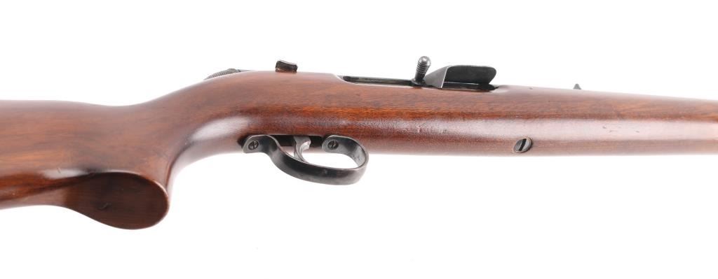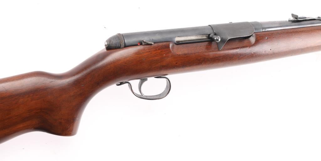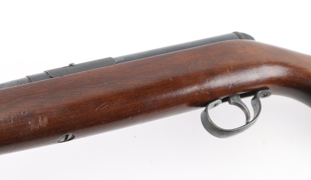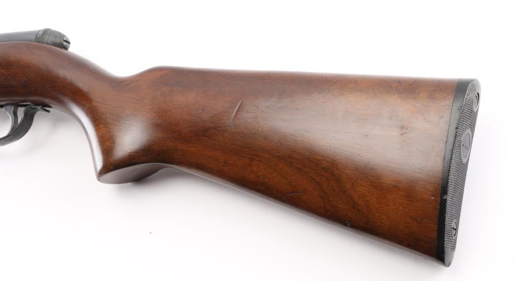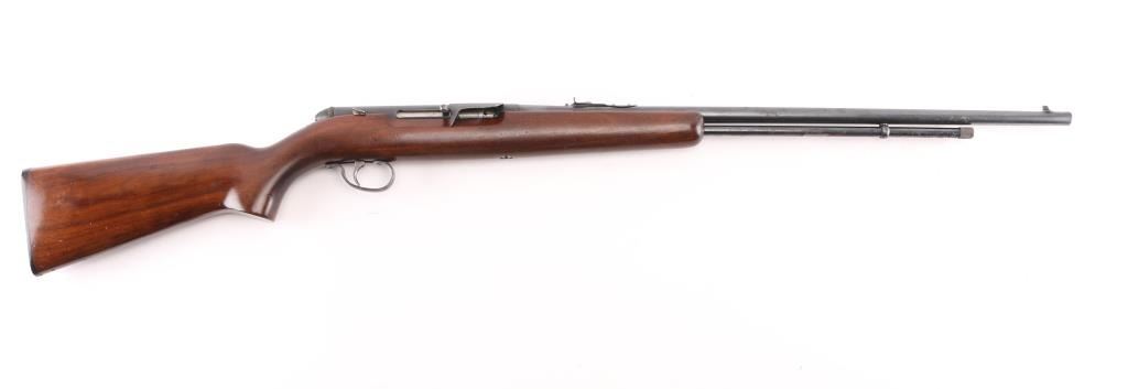 Vintage American made tube-fed semi-automatic sporting rifle chambered in .22 Short, Long or Long Rifle. Features a blued finish, 24" barrel, 4/5 length magazine tube dovetailed blade/bead front sight, adjustable rear sporting sight, case hardened serrated trigger, manual safety, baton shaped charging handle . downward shell deflector installed on receiver,and one-piece smooth wood pistol grip shoulder stock with factory hard rubber buttplate. Rifle exhibits approximately 90% of it's original blued finish showing scattered handling wear/scratches & some light surface rust. Action performs well, bore appears very good and wood stock is good with numerous small blemishes. NRA Condition-Good+. C&R Firearm.