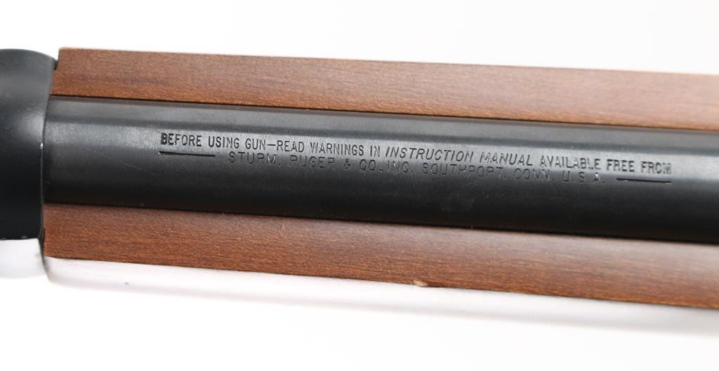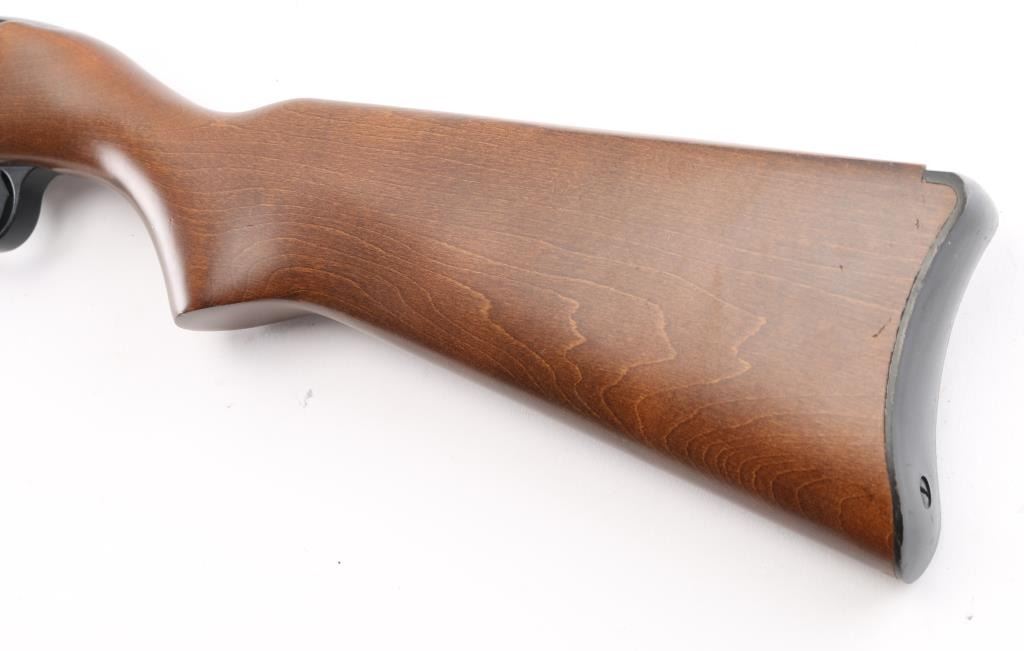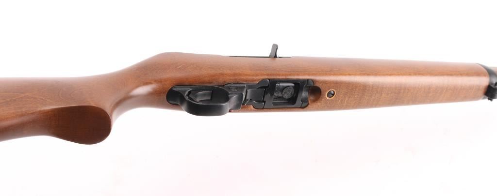 Semiautomatic rimfire rifle features blued finish, smooth wood stock with curved grip, factory plastic butt plate, 18" barrel, blade/bead front sight, folding adjustable rear sight, manual safety, detachable 10-rd rotary magazine. Receiver drilled/tapped for optics. Bore is excellent. Blue finish is excellent.. Stock is excellent overall, few small scratches. Includes (1) magazine. Manufactured 1993. NRA Condition is Excellent. Modern Firearm.