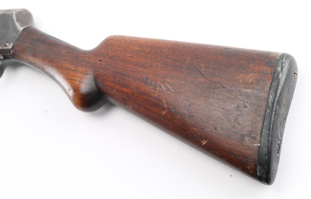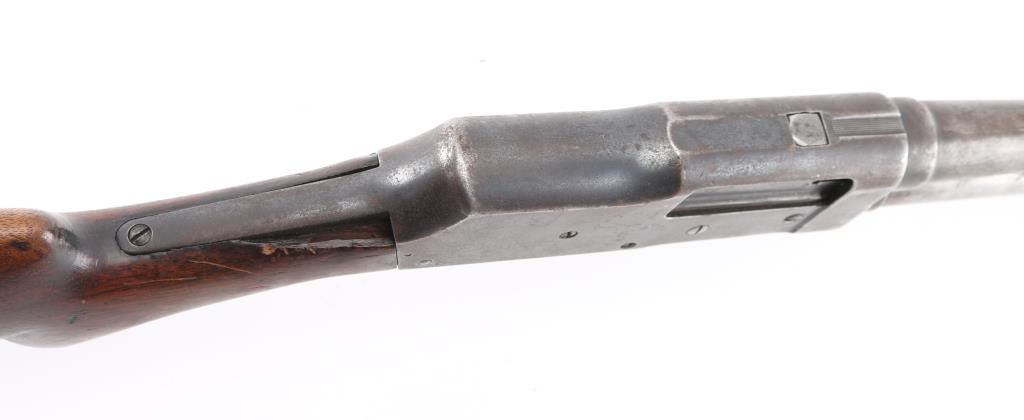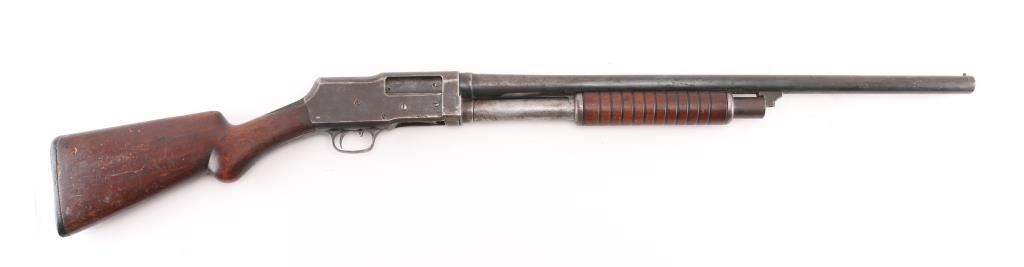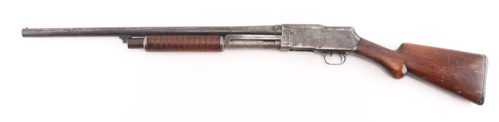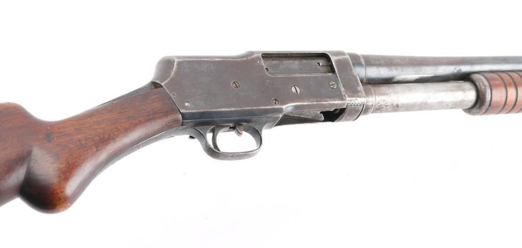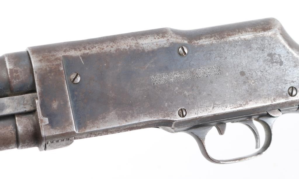 Note* parts/Repair gun. Slide action is frozen. Blued pump-action takedown shotgun with a fixed CYL choke 24" barrel, bead front sight, safety in front of trigger in trigger guard, "Corn cob" style forend and a plain wood shoulder stock with black Stevens butt plate.. LOP is 13 3/4" Metal finish has mostly gone to a patina. Wood stocks have scratches/dings and signs of wear. There is a chip out by the right upper tang. Condition is poor, slide action is inoperable. C&R firearm.