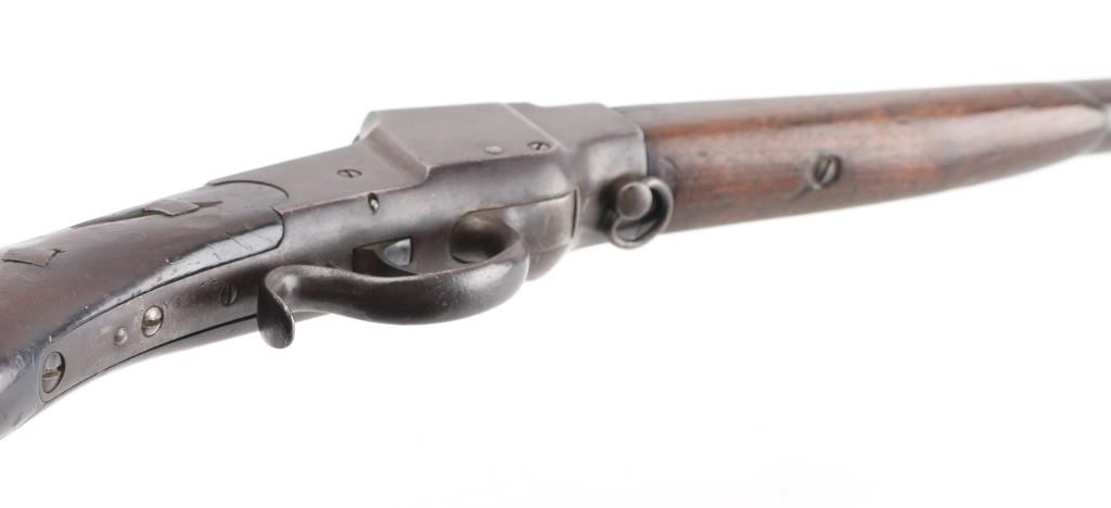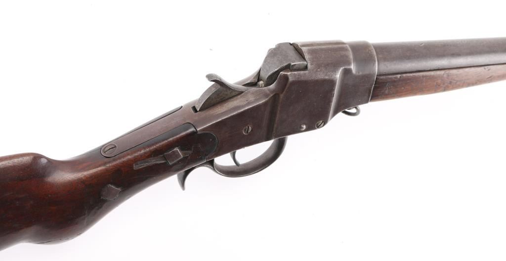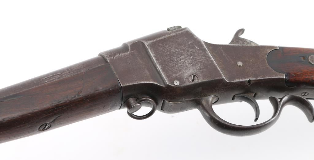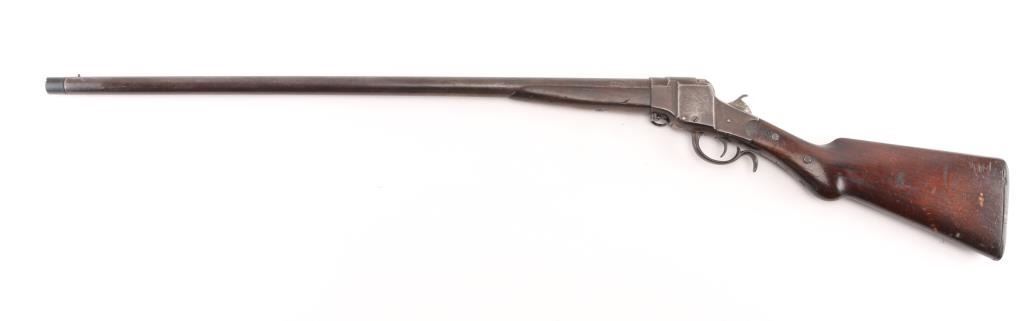 NVSN Here we present a Hopkins & Allen Falling Block Shotgun, manufactured in Norwich, Connecticut around the turn of the century. This would have been a working man’s hunting shotgun for fowl at the turn of the century. The top of the barrel is marked “MADE BY HOPKINS & ALLEN ARMS. CO. NORWICH, CONN. U.S.A.”. The overall condition is good. The metal surfaces are dark with age. The markings are clear and legible. The bore is clean and fairly bright. Brass front sight bead . The stock is in good shape with some handling marks. the wrist has a 2" chip under the right upper tang,there are two metal bolts inletted through the wrist, but there is no damage except for the chip, factory hard rubber butt pad. The action on this shotgun is strong. Auto extractor. NRA Condition-Good. C&R Firearm.