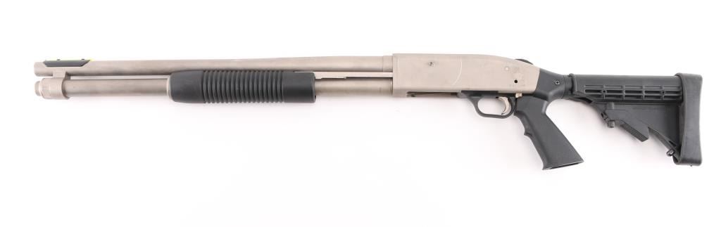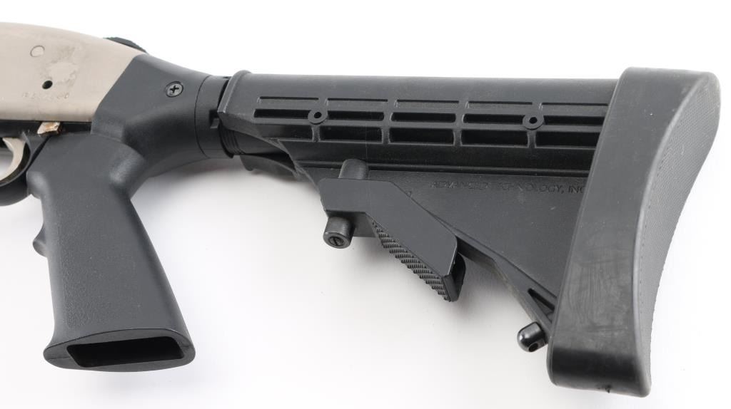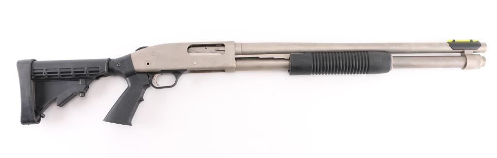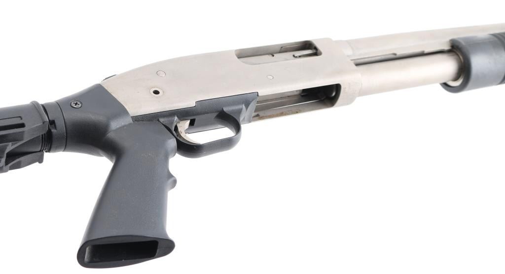 American made slide/pump action shotgun chambered in 12 Ga for 2 3/4" or 3" shells. 20" Marinecote (matte silver finish) barrel with brass bead front sight, full length magazine tube, sliding safety, smooth trigger, grooved black synthetic slide handle and textured black synthetic finger groove pistol grip, missing trigger pack pin, exhibits approximately 93% of it's original finish showing wear overall, some rust on slide release button and two bright circular scratches (where sidesaddle was) and screw protruding on left side of receiver. Action is smooth and bore is excellent, but both dirty. Comes with 6 position AR style buttstock with rubber buttpad and green fiber optic front sight. Condition is NRA very good. Modern Firearm.