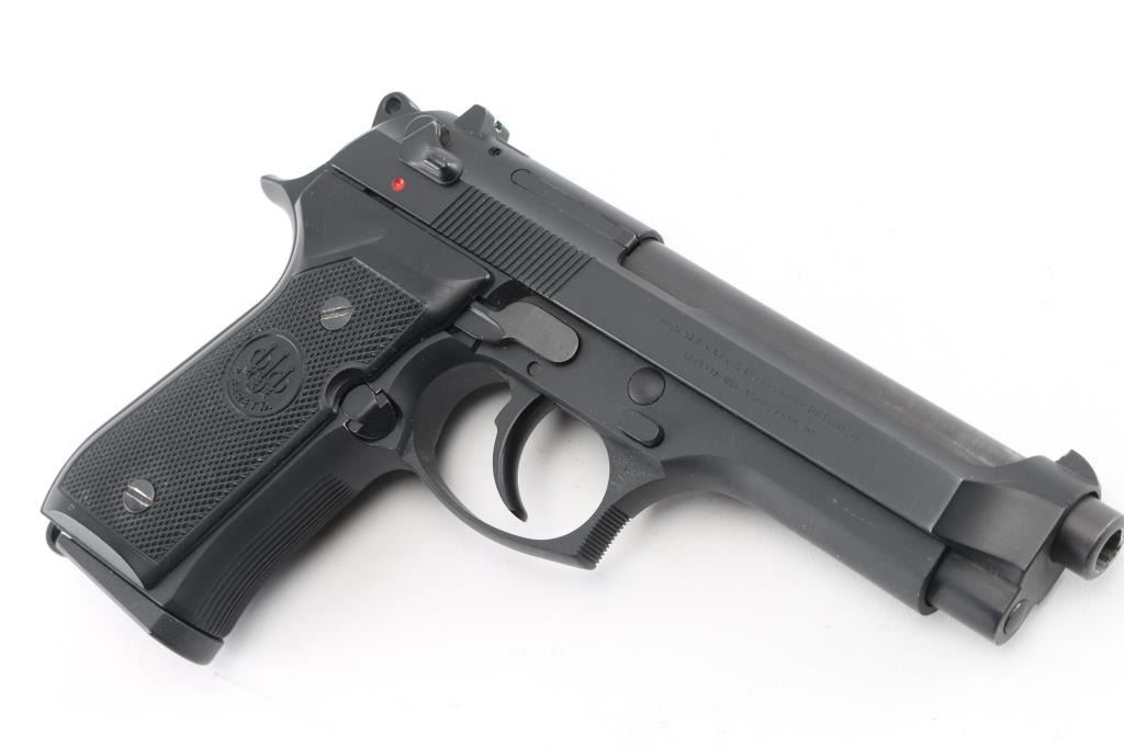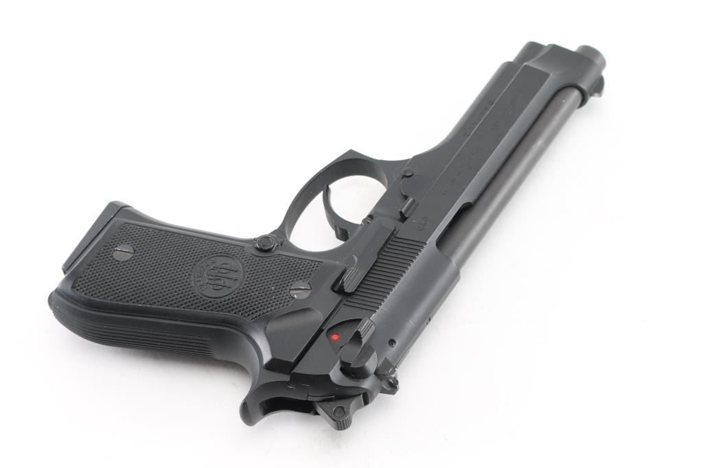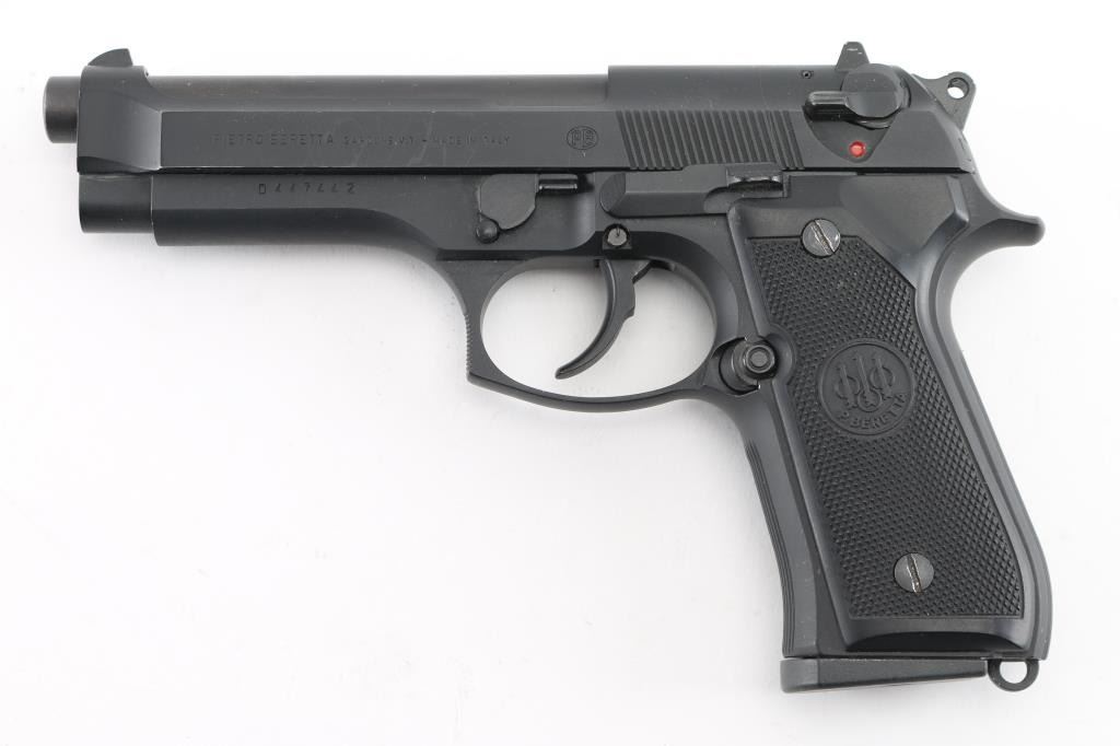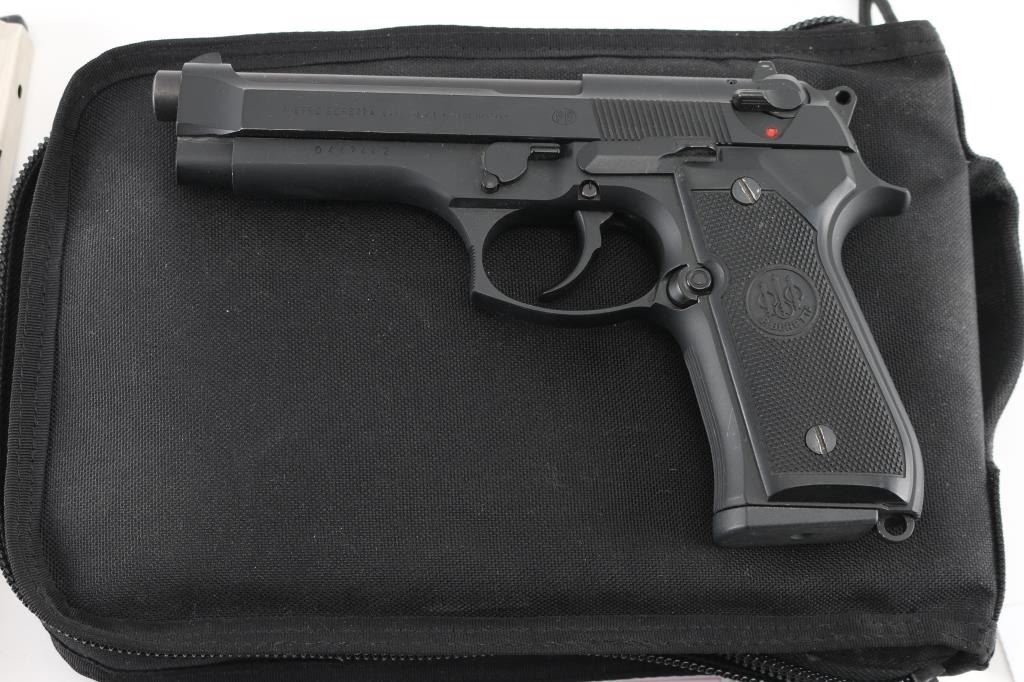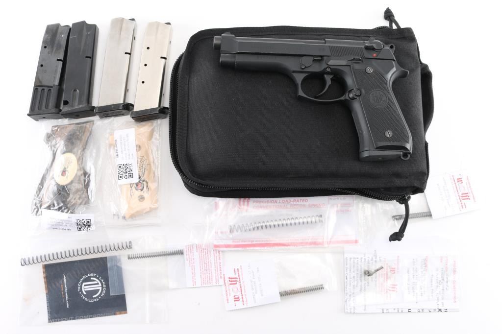 Italian made semi-automatic pistol, DA, matte black finish, approximately 5" barrel, bore is excellent/bright, iron sights, ambidextrous safety, serrated hammer spur, smooth trigger, serrated frontstrap and backstrap, black plastic Beretta grips, lanyard ring on frame at the bottom of the backstrap, 15-round metal magazine. Includes black nylon soft case, extra 4 15-round magazines (5 total), two sets of grips, one laminated wood with black widow spider insert, & one faux ivory with image of black widow spider on right panel, 3 extra hammer springs, 2 spare recoil springs, and a reduced power trigger conversion unit. . NRA Condition- Excellent. Modern Firearm