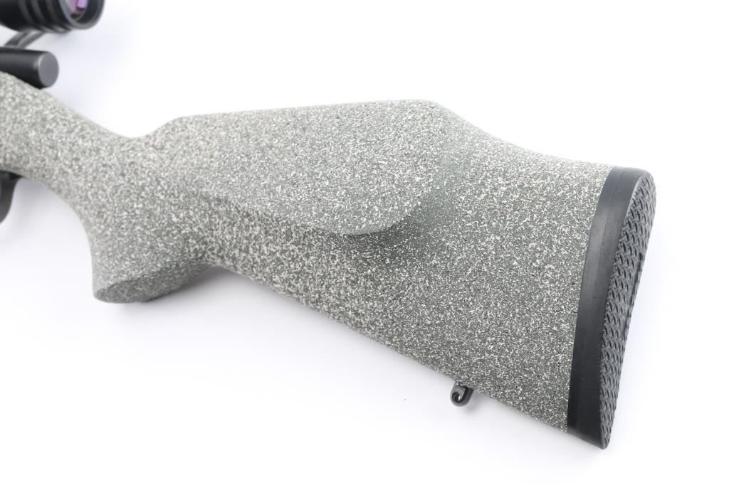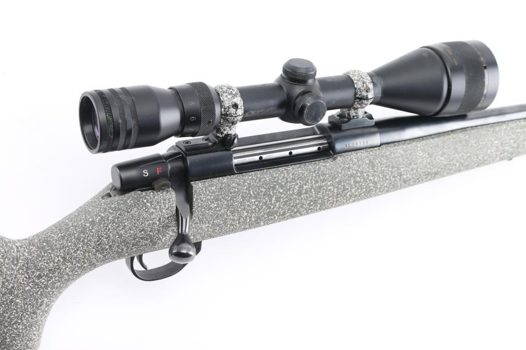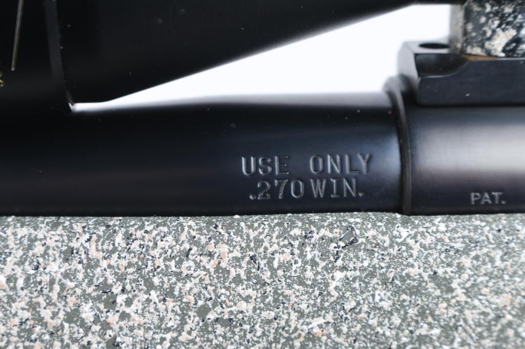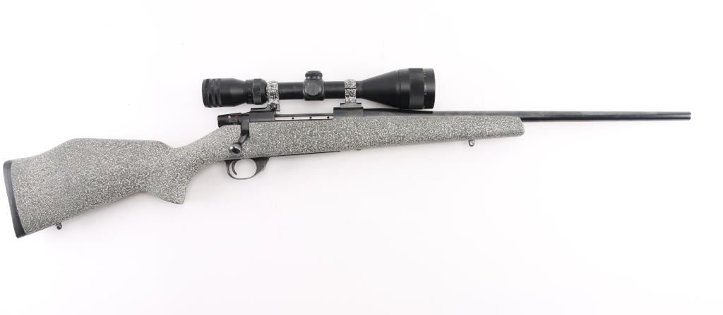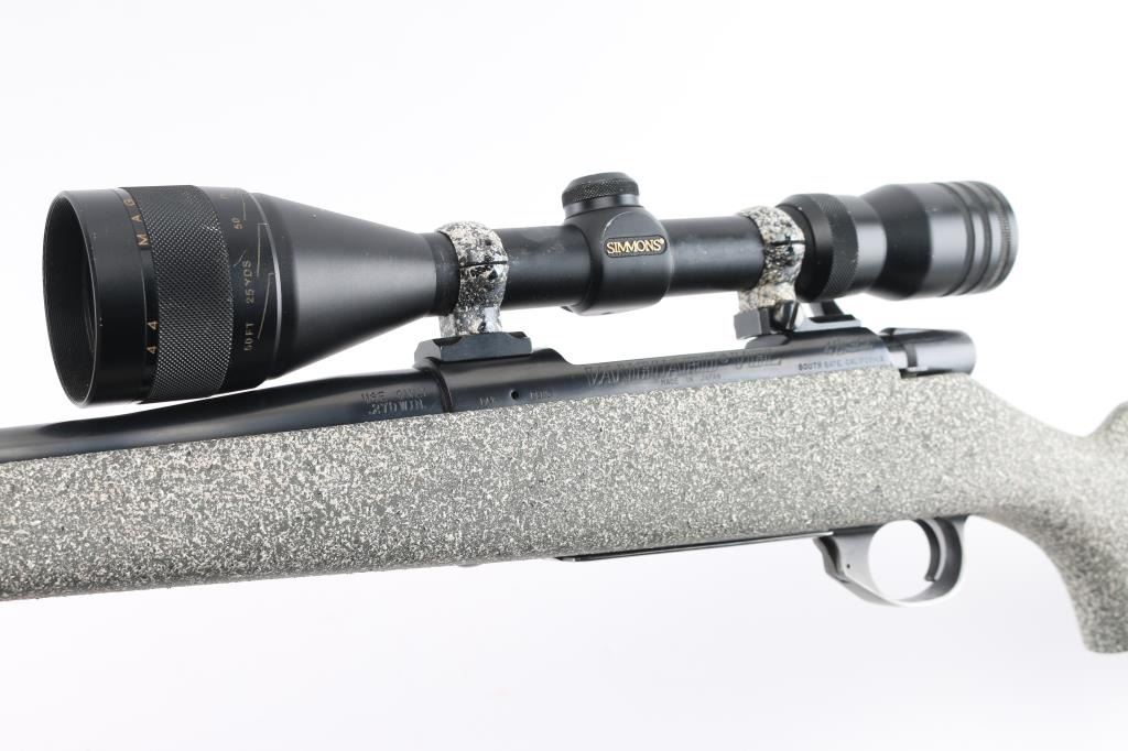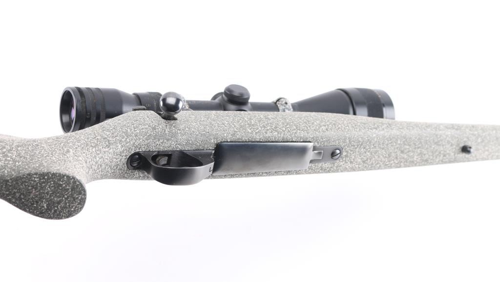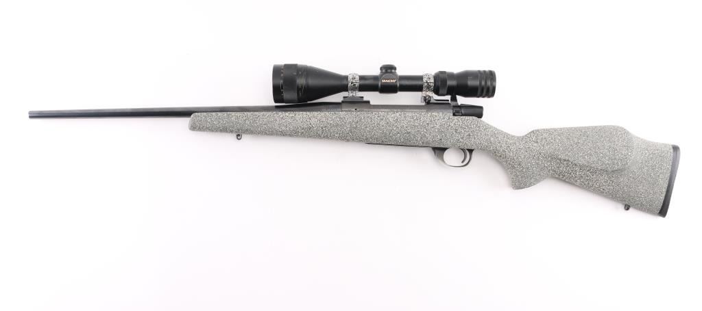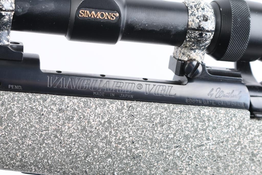 Japanese made bolt action rifle imported by Weatherby. Features blued finish, 20" barrel, no sights, two piece Leupold bases & rings, manual safety, hinged floorplate, sling studs, solid rubber recoil pad. Gray flecked finish on polymer stock (scope rings finished to match). Mounts a very good condition Simmons 4-12x scope with adjustable objective lens, duplex reticle, clear view. Bore is pristine. Retains 95% finish, with handling marks, small scrape to barrel. Scope body shows scratches, blemishes to finish. Condition is near NRA Excellent *** Modern Firearm ***