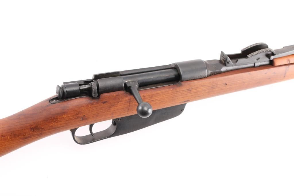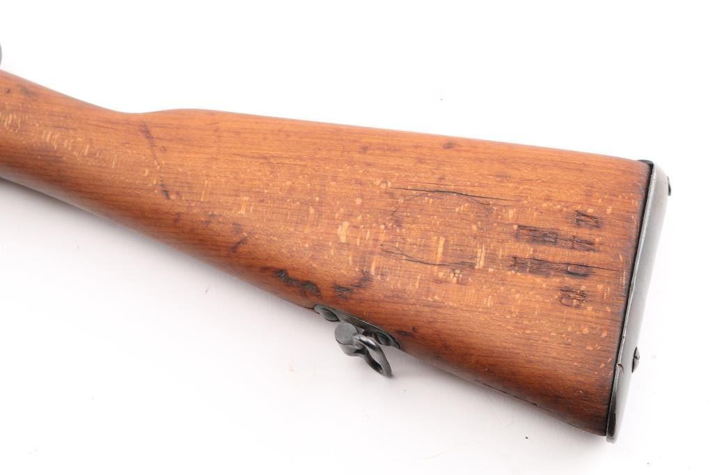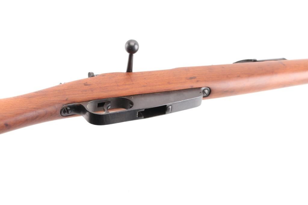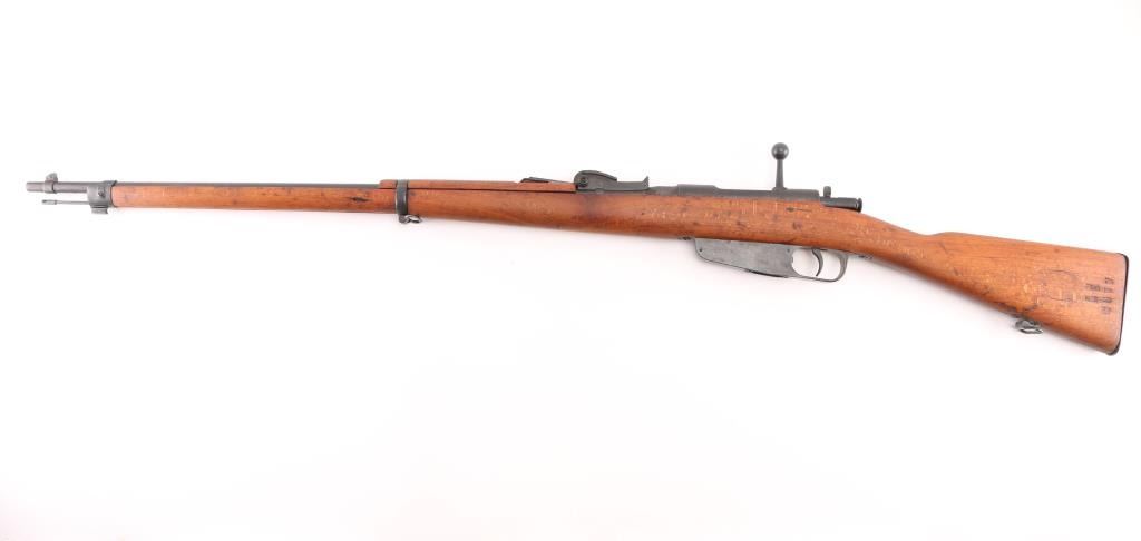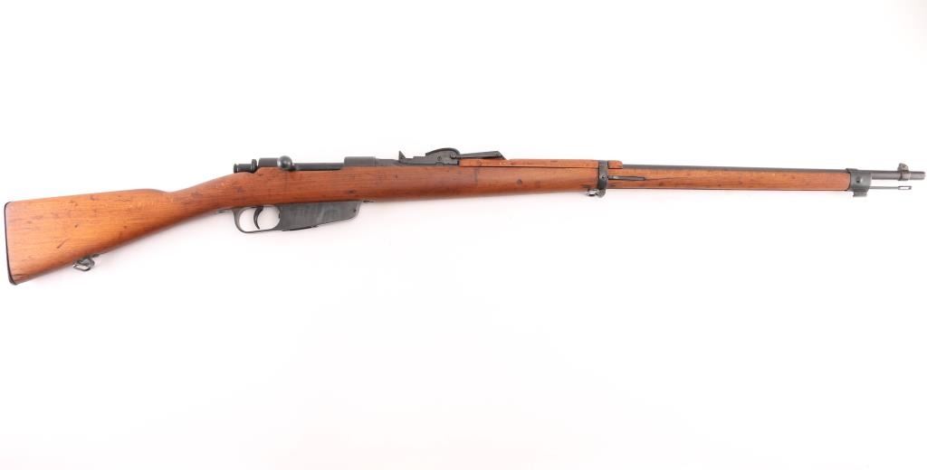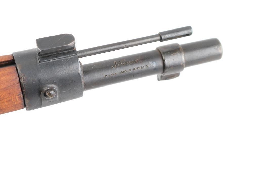 Italian military bolt action rifle, probably manufactured circa 1917. Imported by CAI, St Albans VT. Has crossed rifles "Accuracy Mark" stamped over the chamber. Features 31" barrel, blade front sight, bayonet lug, tangent rear sight, manual safety, sling swivels, wood stocks with almost full length forend & half length handguard, cleaning rod. Bore is fair to good condition with frosting, some darkness, strong rifling. Retains 90% re-blue with visible pitting along wood line of receiver. Wood is sanded, good condition, with gaps around buttplate, loose rear band. Condition is NRA Very Good (as refinished) *** C&R Firearm ***