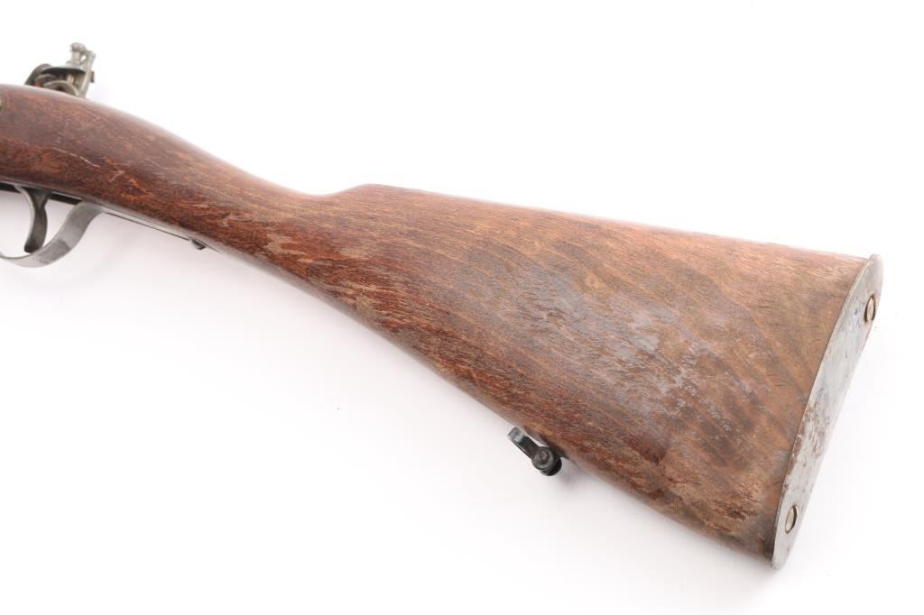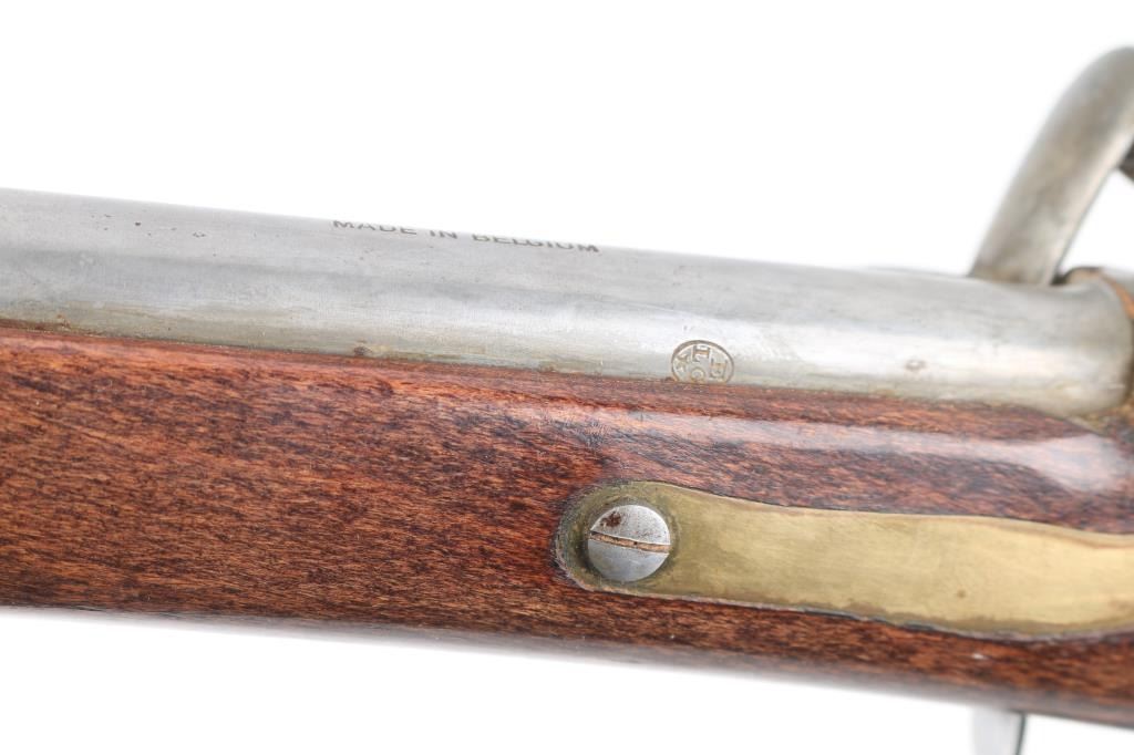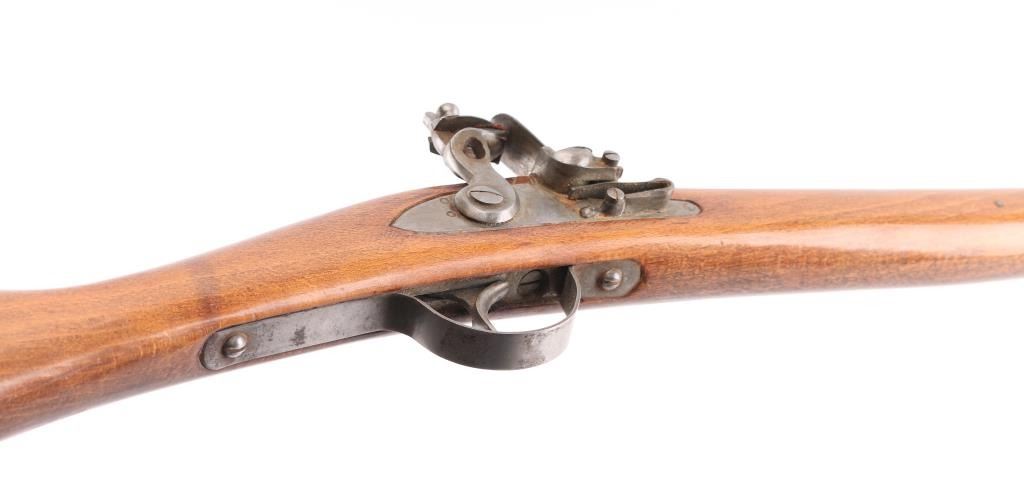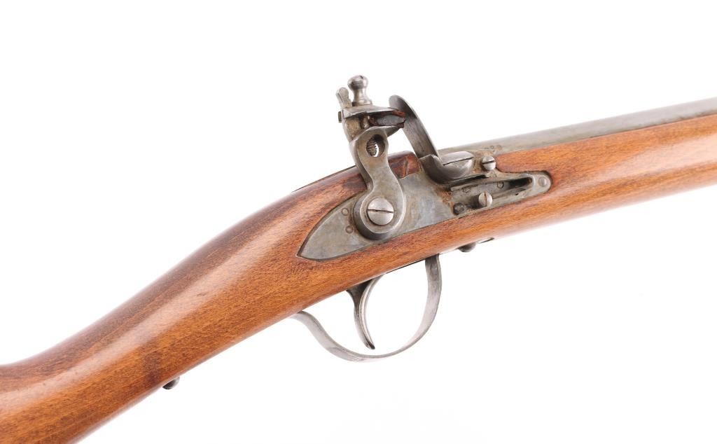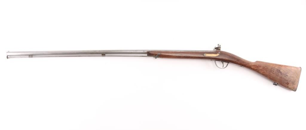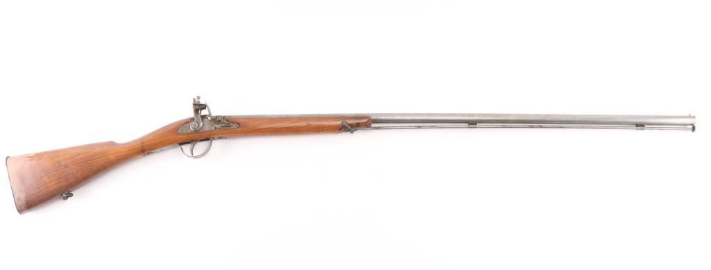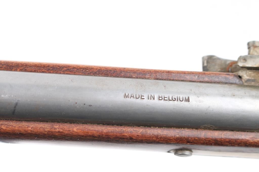 Reproduction of Hudson Bay half-stock flintlock fowler. 36 3/4" steel barrel with brass sighting bead, Marked "Made in Belgium" & "223". Steel ram rod, sling swivels, 2-cock action works great, smooth bore looks good, dusty, CYL choke, Wood is good sound overall with some finish loss at the butt due to water damage, butt plate is proud of the stock. NRA Condition-Very Good. Antique Firearm.