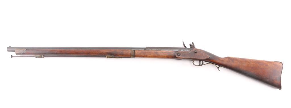 SN: 377. Japanese made reproduction of a British Land Pattern 'Brown Bess' musket. 32" round barrel with octagonal chamber, front blade sight, full length stock with brass fittings. steel ramrod, 2-cock action works well. Lock plate marked with "GR" under crown. Smooth bore looks good. dusty. Wood is good overall with chip out of the toe, and from heel. Musket has been artificially aged to give it a antique look, looks good. Barrel marked "Japan" & "377"' NRA Condition-Very Good. Antique Firearm.