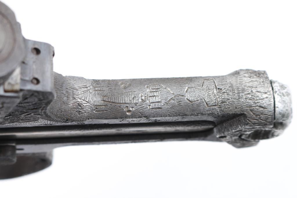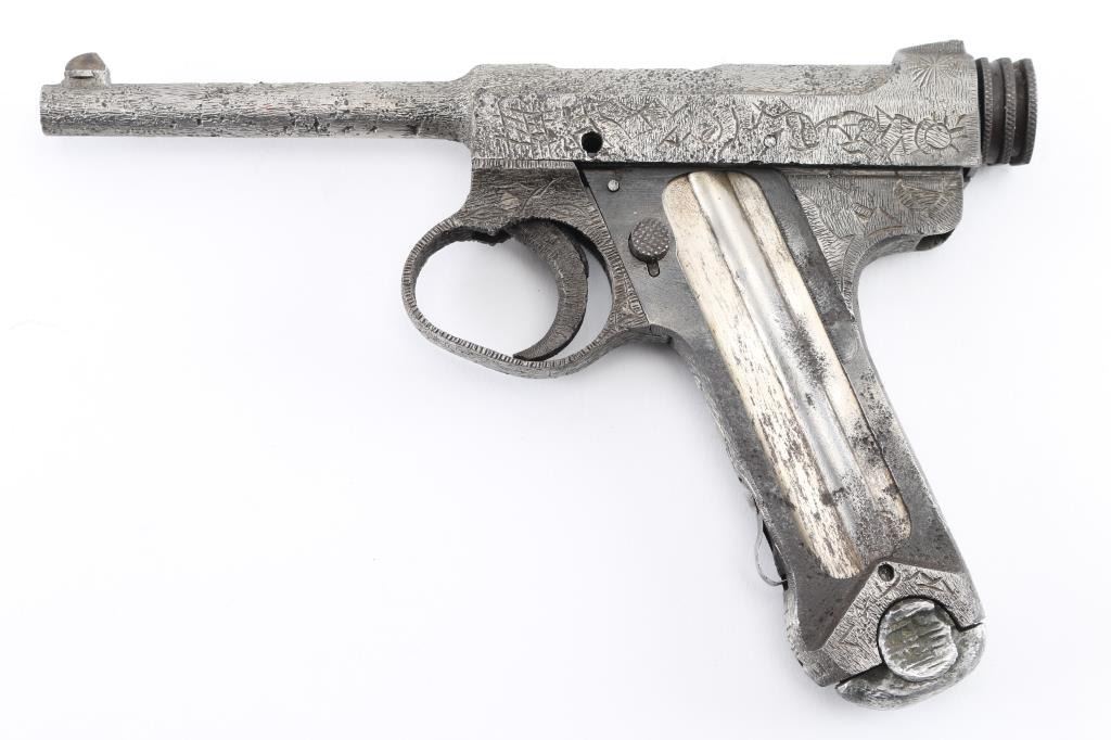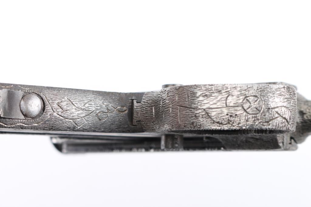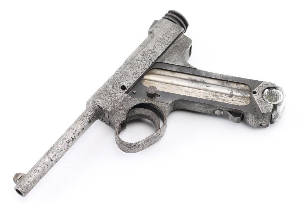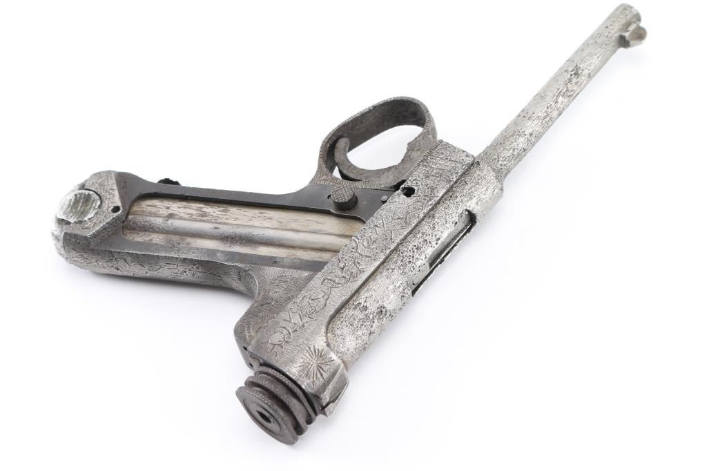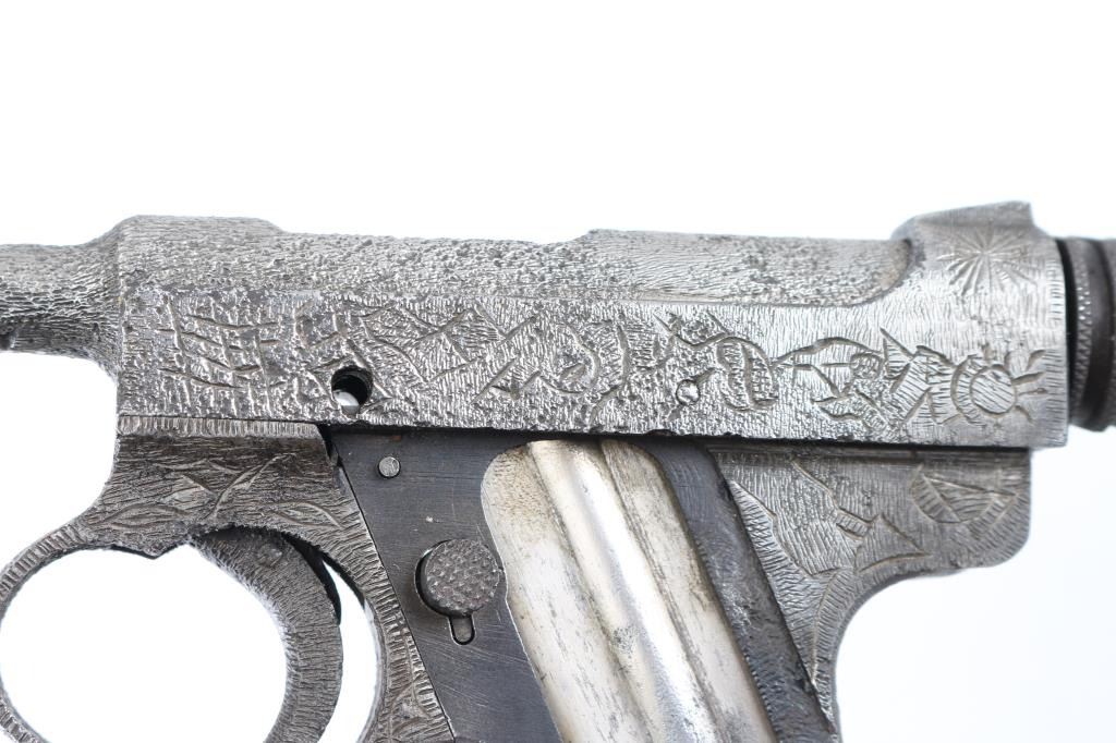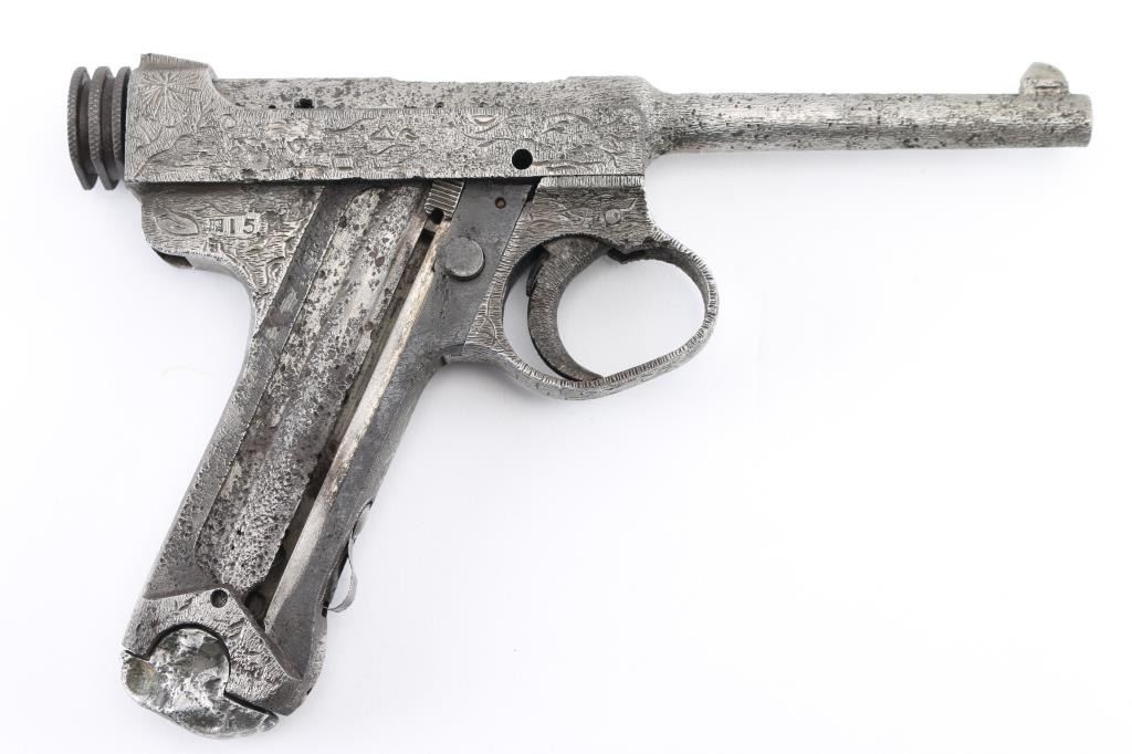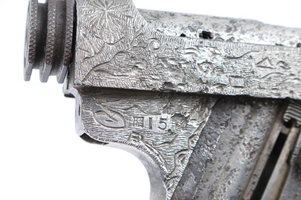 Near relic condition WWII era semiautomatic pistol, with "trench art" style soldier engraving. Features large triggerguard, 4.5" barrel, fixed sights, grips missing, many small parts missing. Bore is poor, rusted. Gun is cleaned, showing heavy pits throughout, simple line engraved shapes and initials. Poor condition magazine included. Condition is NRA Poor - Relic *** C&R Firearm ***