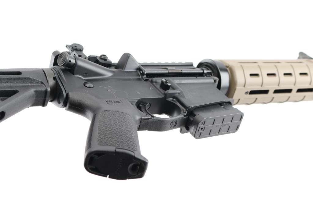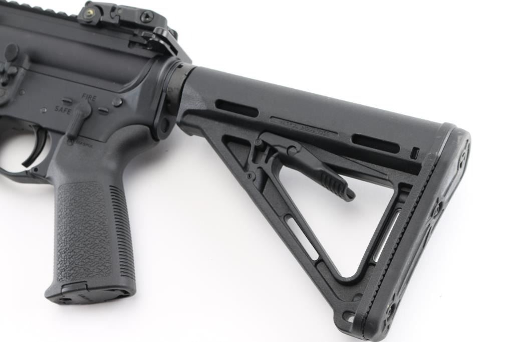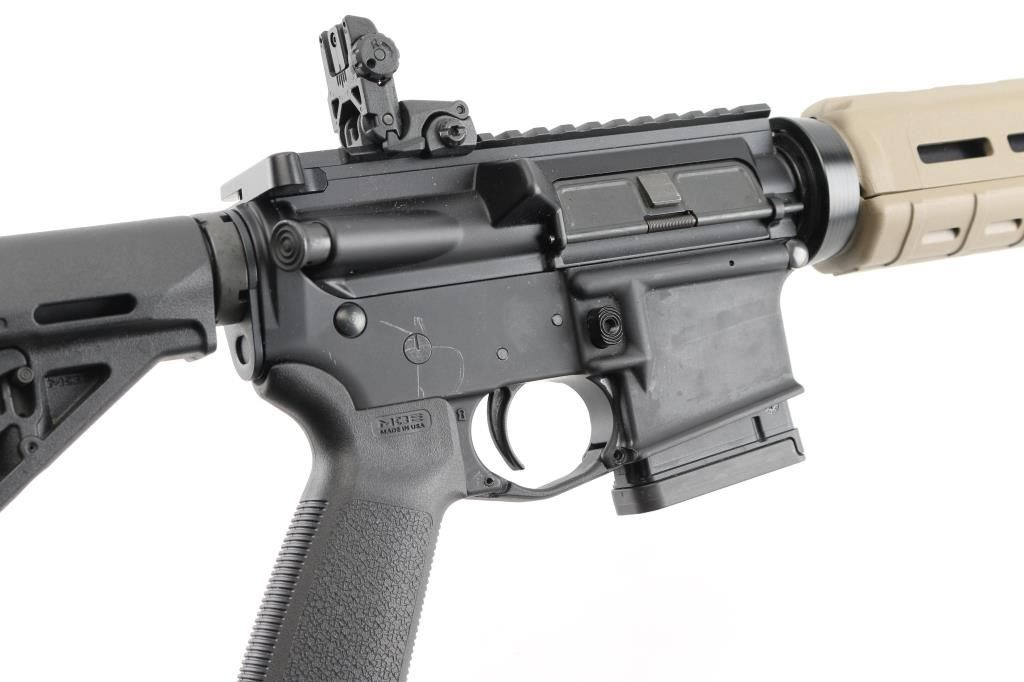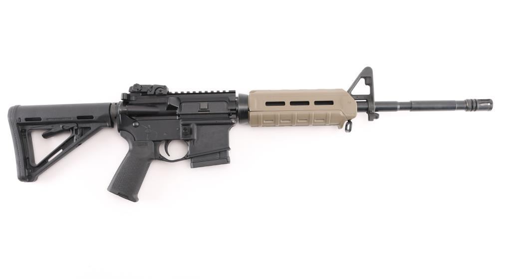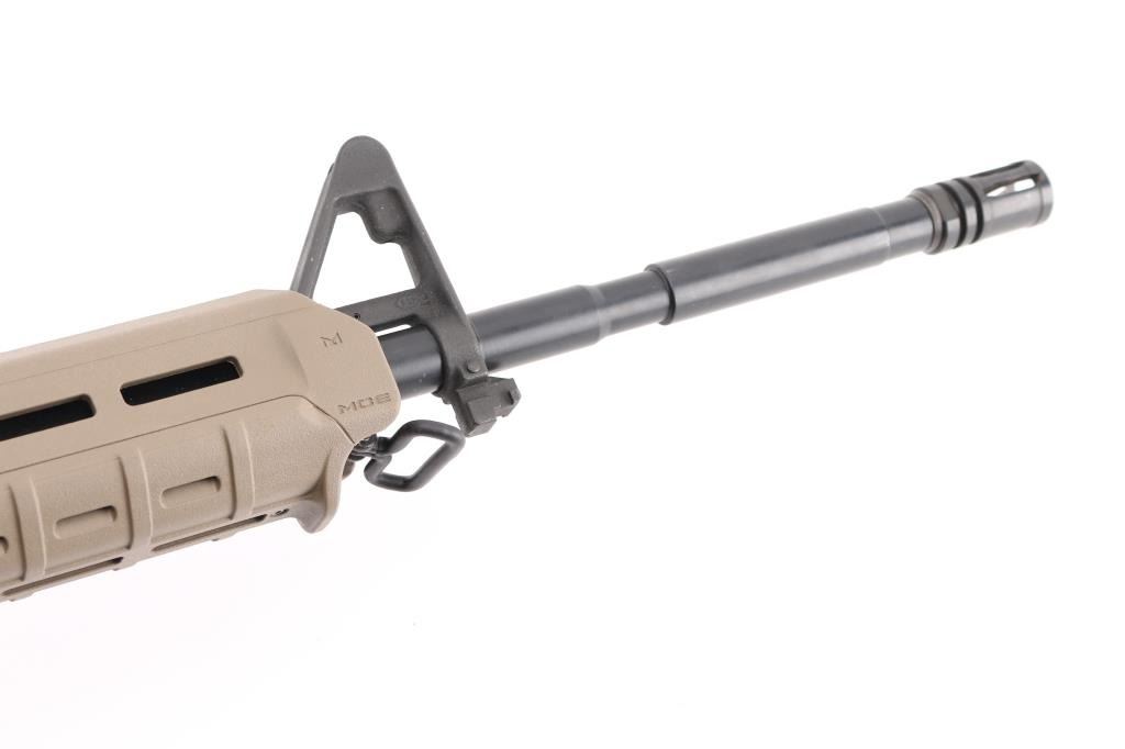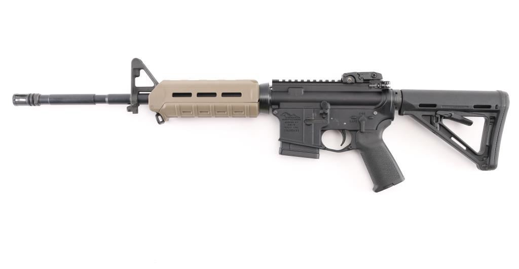 SN: 21405633. Gas operated semi-automatic AR platform rifle chambered in 5.56 NATO. Features a matte black finish, medium contour 16.25" 1/7 twist barrel, A2 birdcage flash hider, mid-length gas system, A2 shrouded adjustable post front sight with bayonet lug, MGUS adjustable rear aperture sight, forged flat-top upper receiver with forward assist, shell defector & dust cover, M-16 profile bolt carrier, push button magazine release, 10 rd lancer magazine, manual safety, A2 MOE black synthetic pistol grip, carbine length MOE desert sand handguard , and MOE 4-position stock. Rifle exhibits approximately 97% of it's black finish with some scratches on the right receiver. Action is smooth, the bore is pristine, and the synthetic stocks are fine. Condition is NRA Excellent. Modern Firearm.