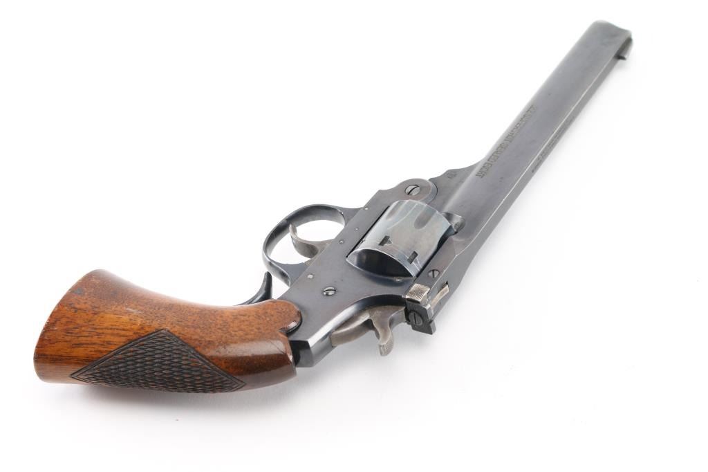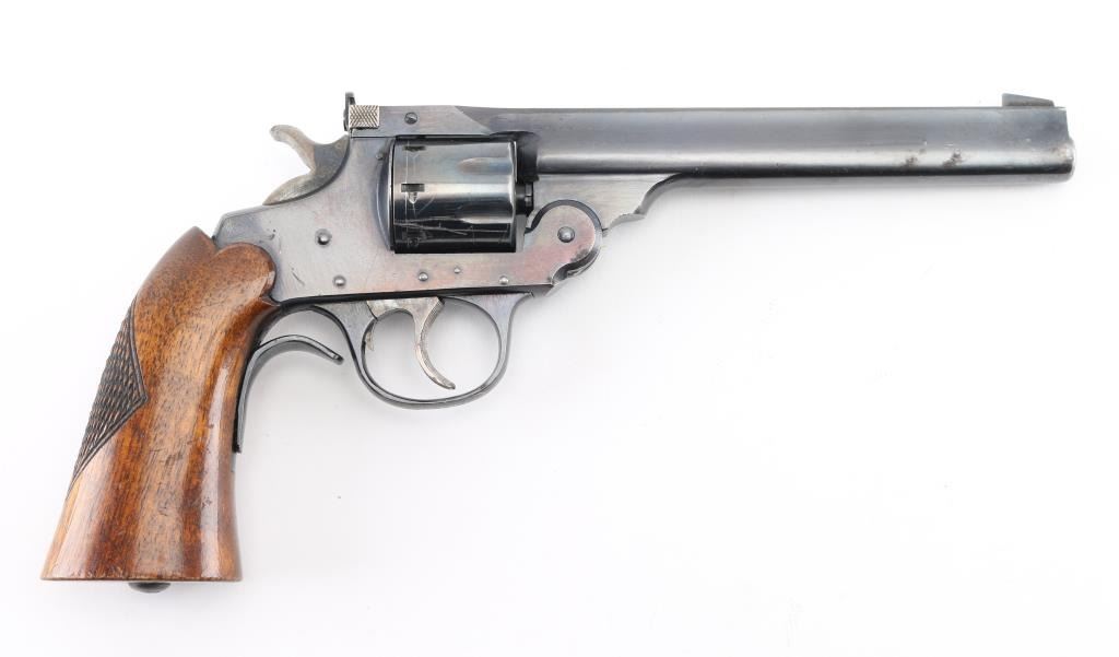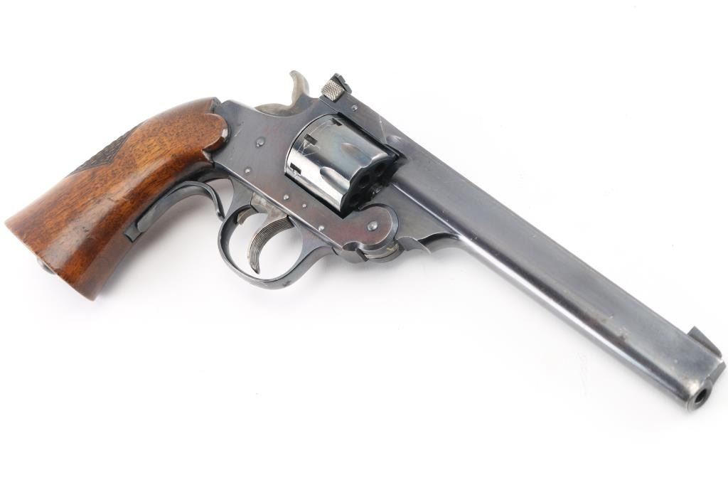 SN: L28733. Vintage break top double/single action 22LR revolver. (1932-58) Features 6" barrel, blued finish, one piece wood grip with checkered panel at rear, partridge front & square notch rear sight, serrated trigger, 8 shot fluted cylinder. Steel grip adapter attached. Bore is excellent. Retains 80% finish with losses along barrel, handling marks, scratches on cylinder. Wood grip is in very good condition. Action operates smoothly with good lock up. Condition is NRA Very Good. C&R Firearm.