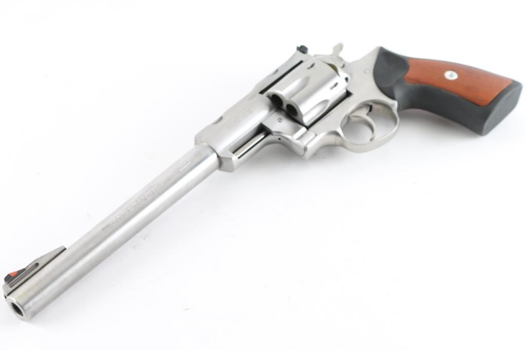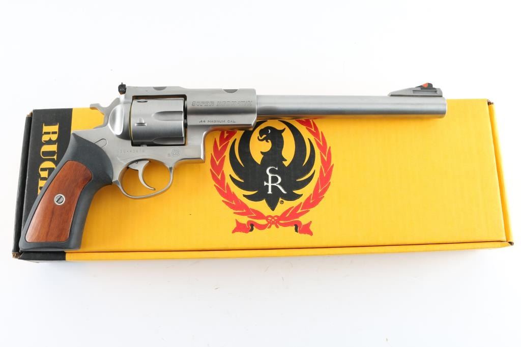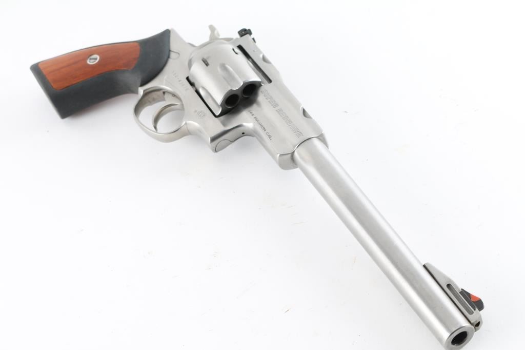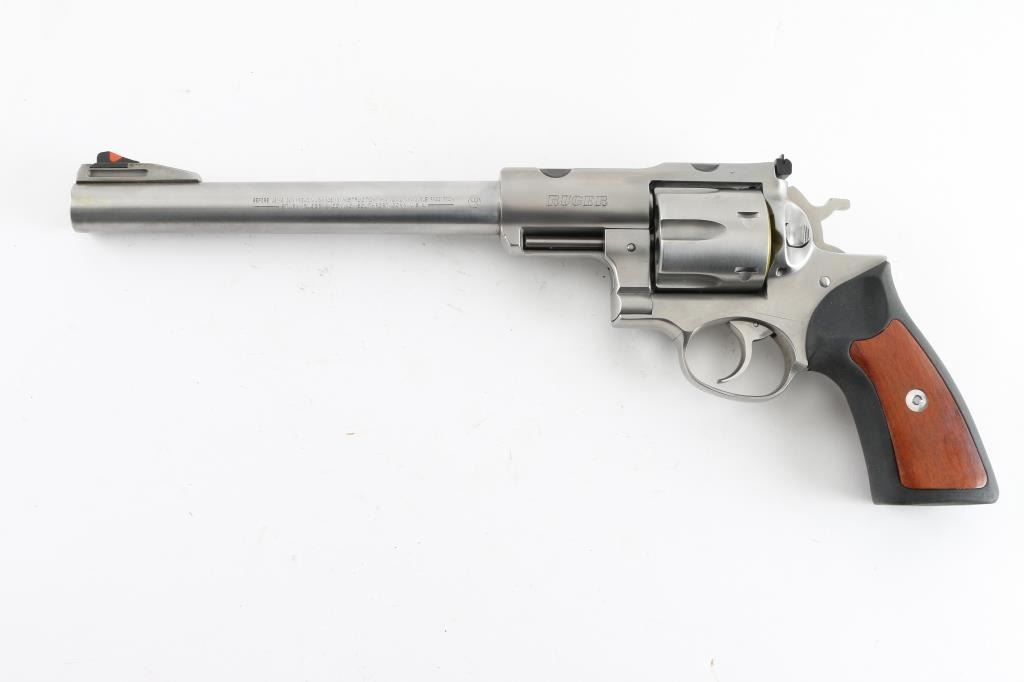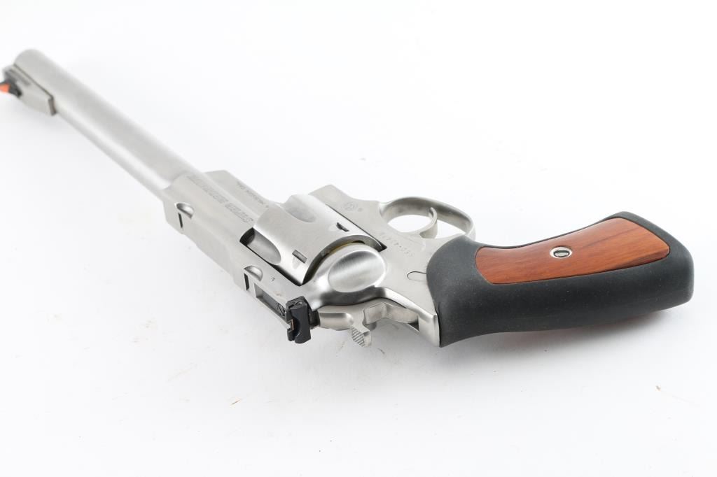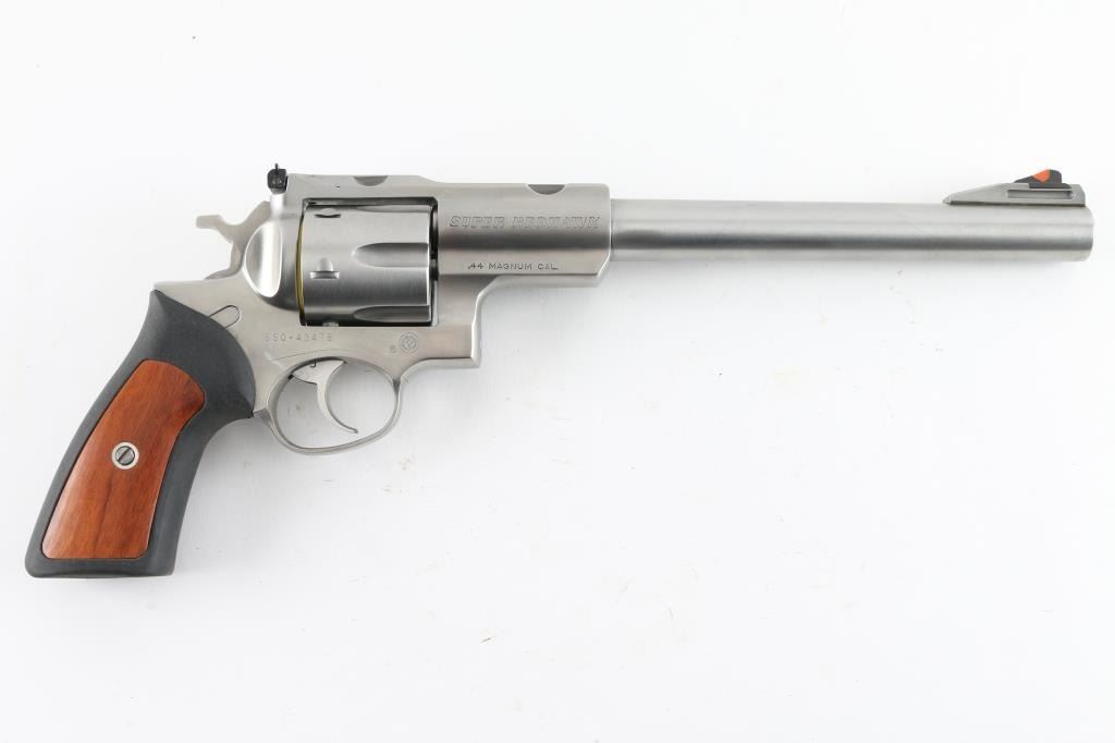 Large frame stainless steel double action revolver chambered in .44 Magnum, manufactured circa 1990. Features a bright brushed finish, 9.5" round barrel, raised serrated ramp front sight with orange insert, adjustable rear sight with white outline, shrouded ejector rod, fluted six shot cylinder, smooth trigger, knurled hammer spur, transfer bar safety, extended frame with integral scope base cuts in the top strap, and black rubber grips with smooth wood inserts. Bore is pristine. Metal shows few handling marks. Grips are excellent condition. Includes factory yellow cardboard box, manual, Ruger scope rings. Condition is NRA Excellent *** Modern Firearm ***