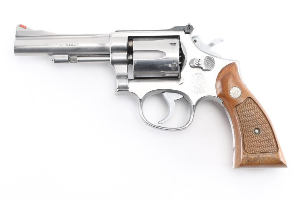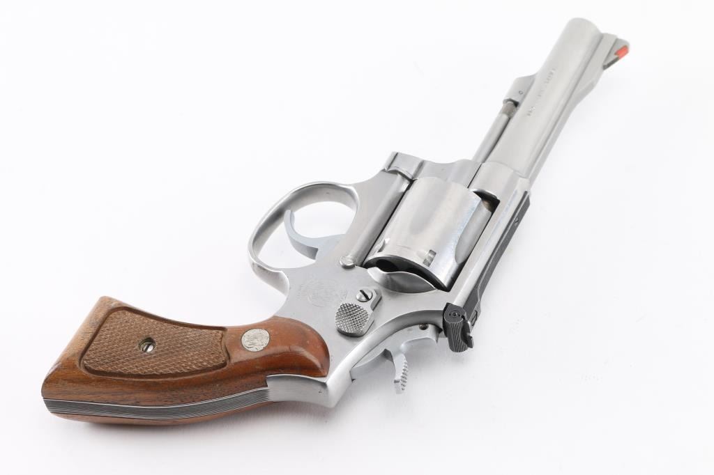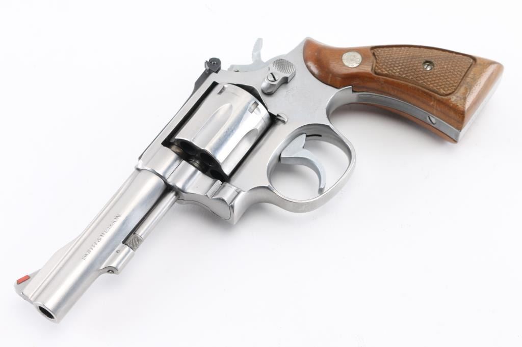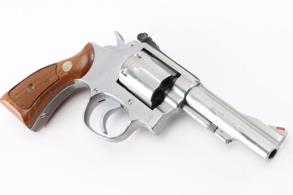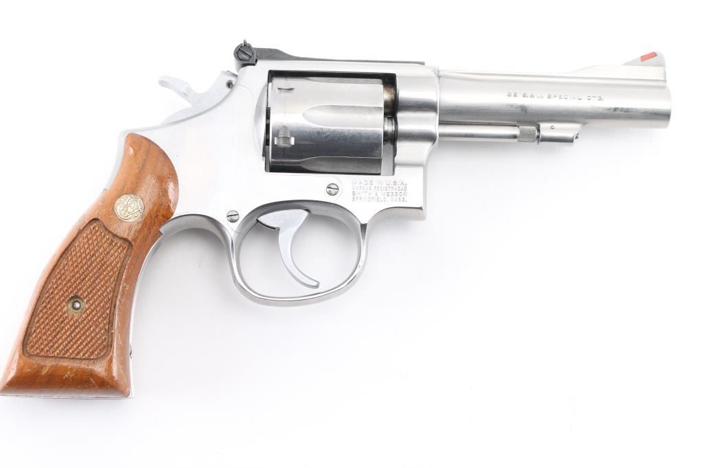 American made six shot revolver chambered for .38 Special ammunition. It features stainless steel construction, a 4.25" barrel, raised ramp front sight with orange insert, adjustable rear sight, fluted cylinder, knurled hammer spur and cylinder release. It has two piece wood grips with checkered grip panels and S&W medallions with a serrated back & fore strap. Metal finish looks good with minor scratches, & track line on cylinder. Wood grips are very good. Bore looks excellent, bright. NRA Condition-Very Good. Modern Firearm.