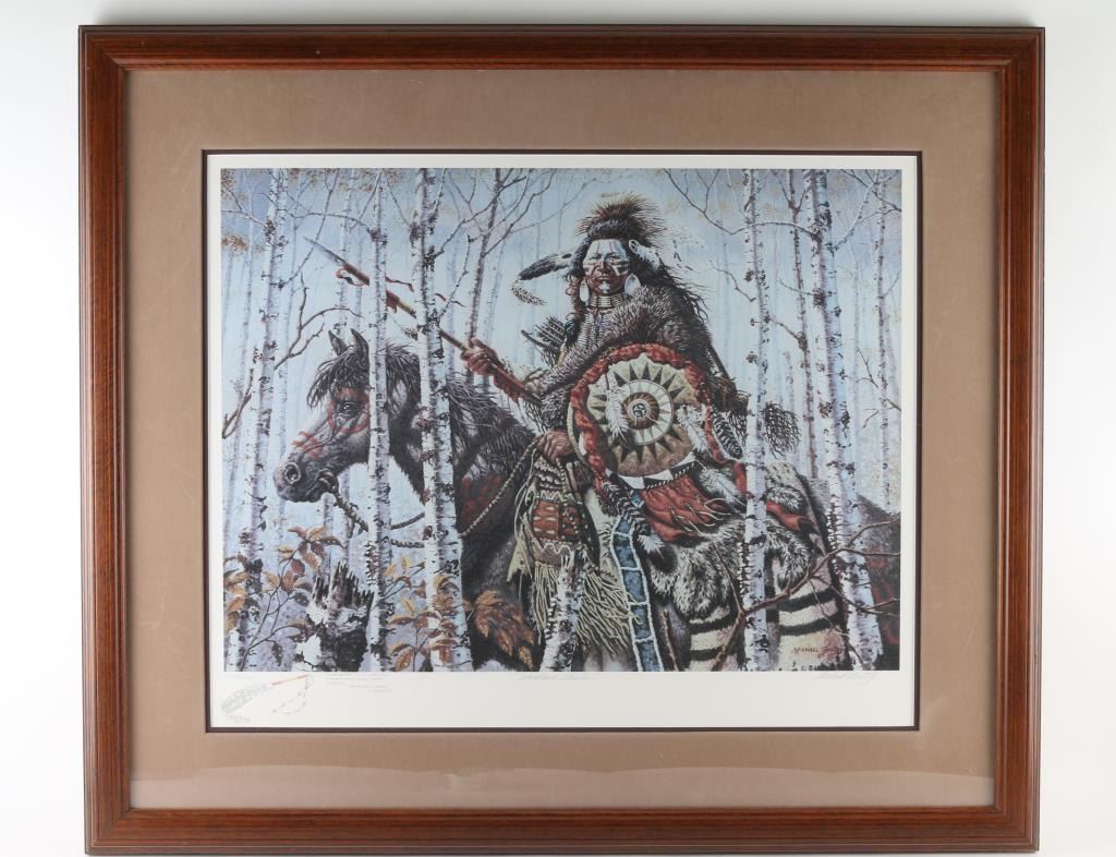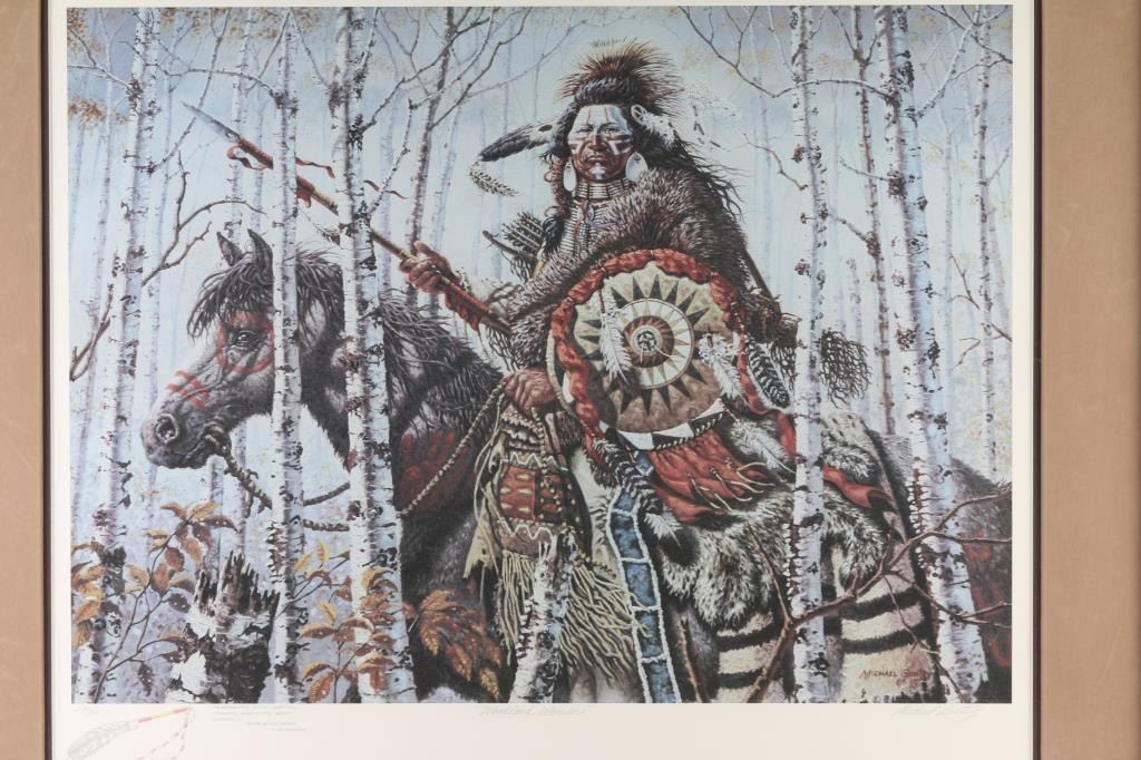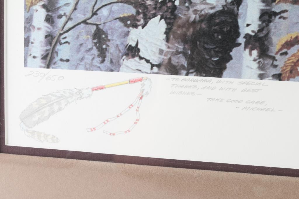 Michael Gentry entitled Woodland Warrior, 27"x21" number 239/650. "To Barbara Special Wishes" Signed twice, with drawing of feather fan.