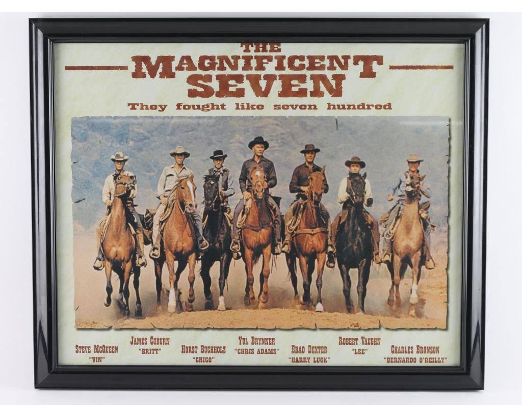Mass produced movie poster printed in 1960. This movie was very popular, and featured good names like "Steve McQueen", Robert Vaughn" and more. In good condition and framed. Image size measures 19x15.