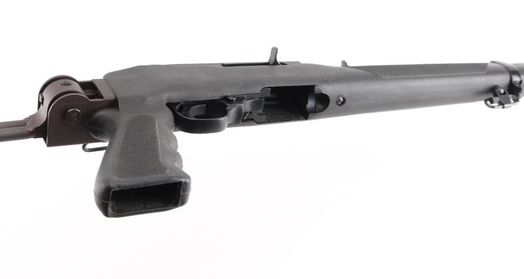 Semi-automatic Carbine chambered in .22 LR. 18 1/2" barrel with 2 1/4" muzzle brake, blade front sight with brass bead and flip-up adjustable rear sight, black polymer stock with checkered pistol grip and metal wire folding stock with a black rubber Butler Creek recoil pad, smooth trigger and push button safety, sling swivels attached and no magazine. LOP 13". Metal retains 98% of it's finish with 1 1/2" scratch on top front of receiver. Bore is excellent and action is smooth. Condition is NRA Excellent. Modern Firearm.