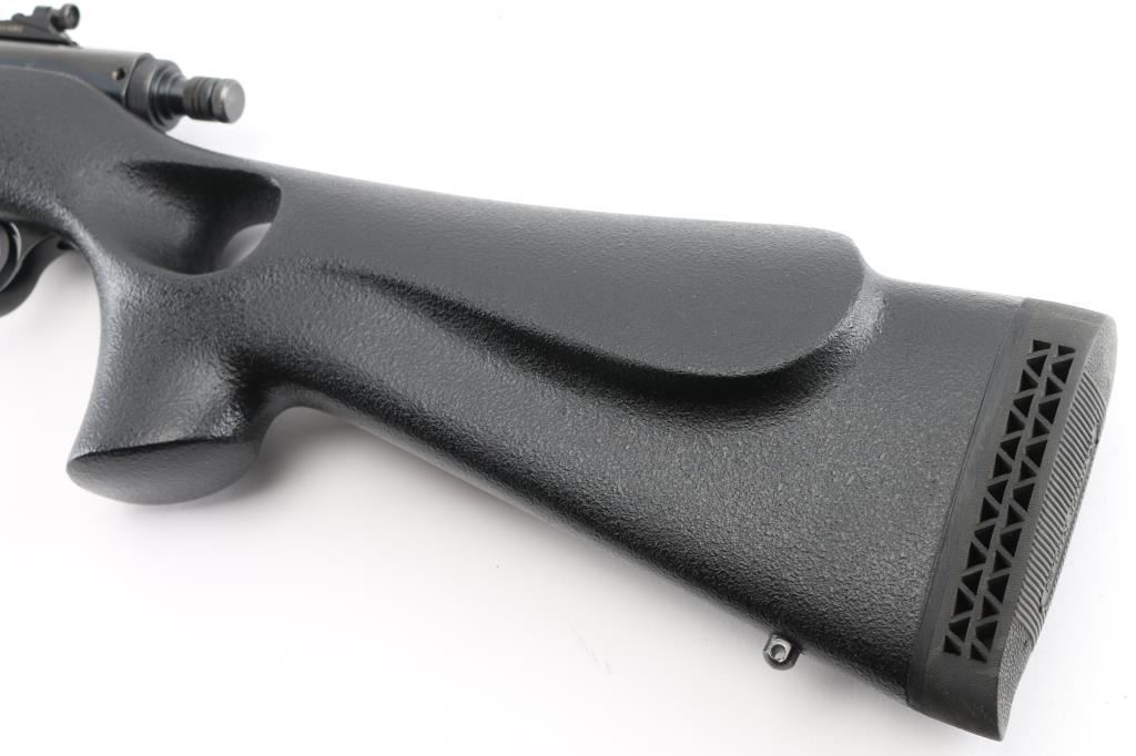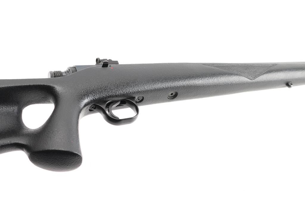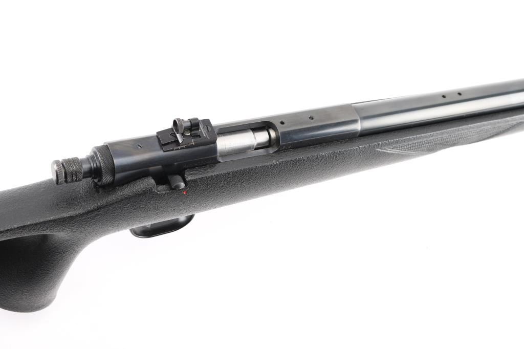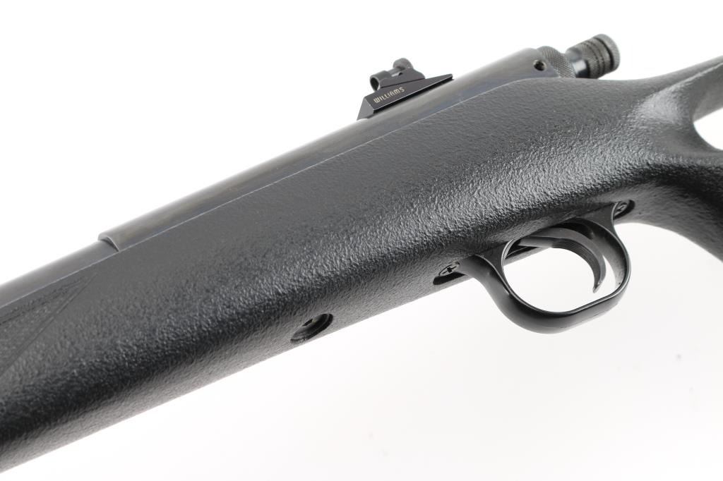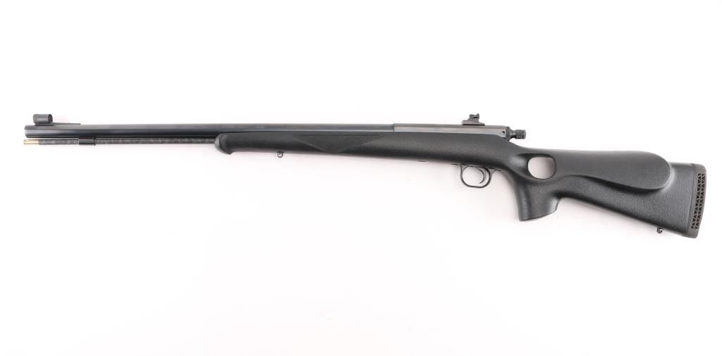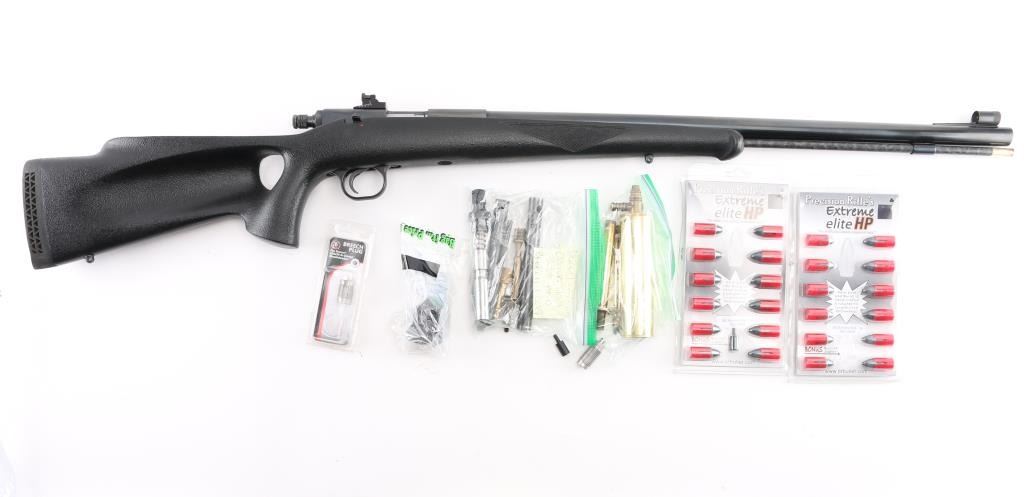 Single shot Black Powder (or Pyrodex) Only rifle uses #11 percussion caps for ignition, includes 209 primer conversion parts. Features blued finish, black pebble grain composite thumbhole stock, 25" round barrel, fiberglass ramrod under barrel, hooded blade front & Williams adjustable peep rear sights, manual safety, sling studs, ventilated rubber recoil pad. Receiver drilled & tapped for mounting an optic. Overall condition is excellent with bright shiny bore, light handling marks. Includes 2 dozen saboted bullets, brass powder measure, brass powder dispenser, inline capper, breech plug wrench, the previously mentioned 209 primer conversion parts, a collection of jags and other tips for the ramrod, set of Leupold bases (with quick detach levers and matching rings). Condition is NRA Excellent *** "Antique" Firearm ***