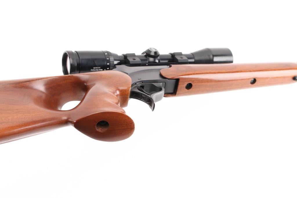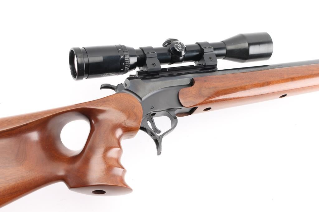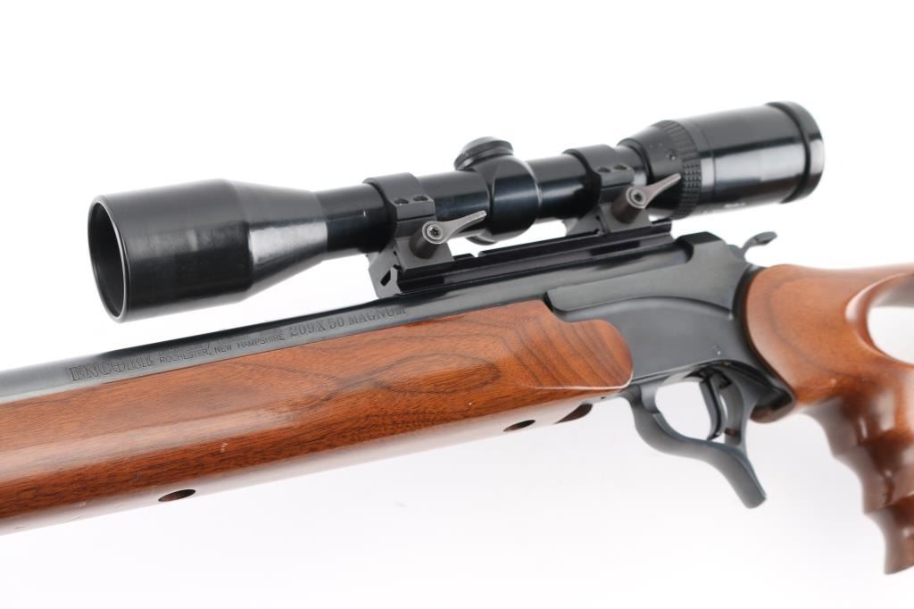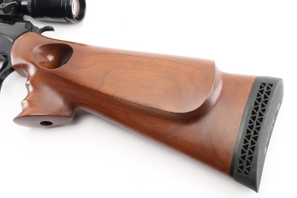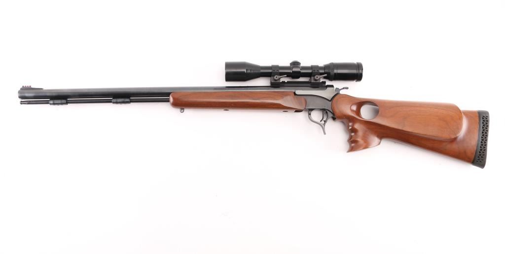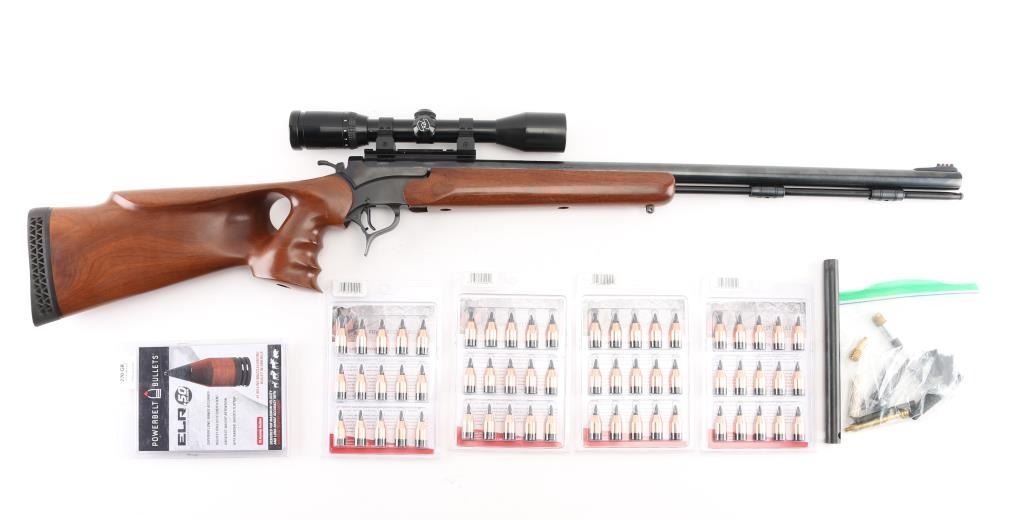 Single Shot break action rifle currently mounting a "209 x 50 Magnum" barrel, using 209 primer ignition for Black Powder or substitute. Other barrels can be installed on this frame. Features blued finish, smooth walnut forend & thumbhole stock (with finger grooved pistol grip & right handed cheek piece), ventilated rubber recoil pad, aluminum ramrod under barrel, fiber optic front sight, weaver rail on barrel at rear, quick detach lever scope rings, Zeiss Diavari-C 3-9x36mm scope (clear view, duplex reticle), sling stud on forend. Bore is pristine. Retains 95% finish with minor handling marks. Wood is very good with dents & dings. Includes 5 packs of saboted 325gr Powerbelt ELR bullets (15 each, 75 bullets total), extra breech plug & wrench, ramrod tips, ball starter, different front sight, Williams peep rear sight, TC adjustable rear sight, Williams notch rear sight. Condition is near NRA Excellent *** Modern Firearm ***