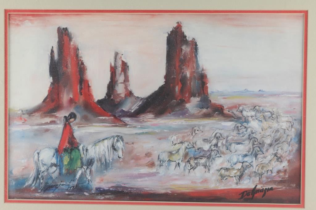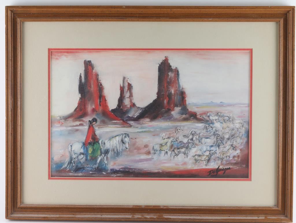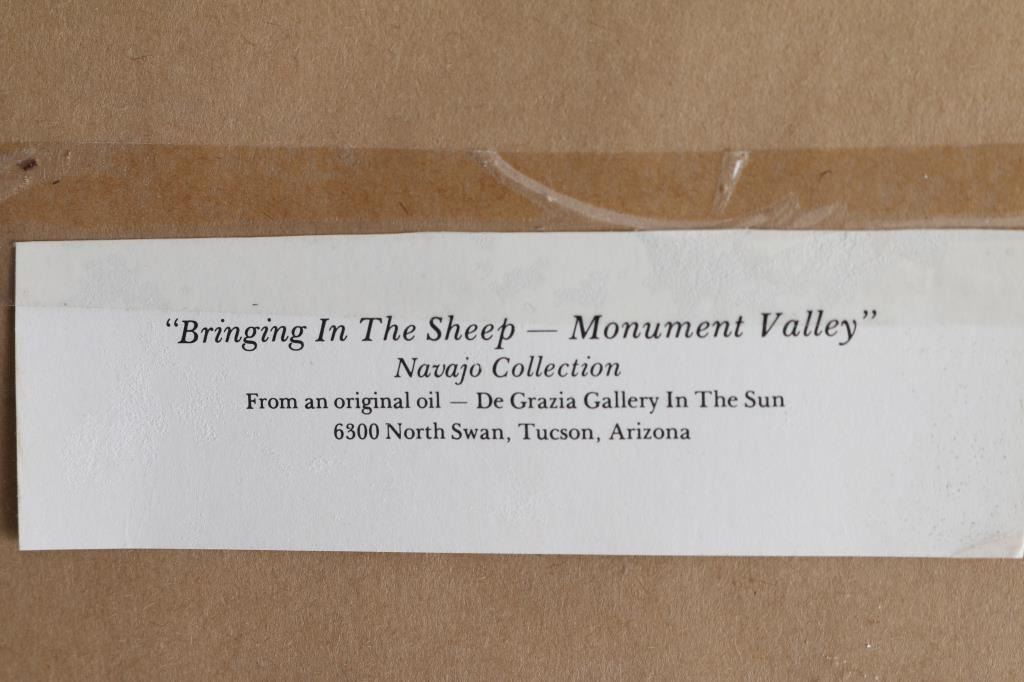 By Arizona artist "De Grazia" entitled "Bringing In The Sheep- Monument Valley" signed an dated 1981 located lower left. Framed and triple matted measuring 20x14.