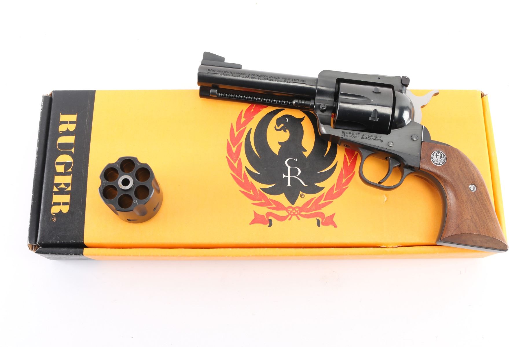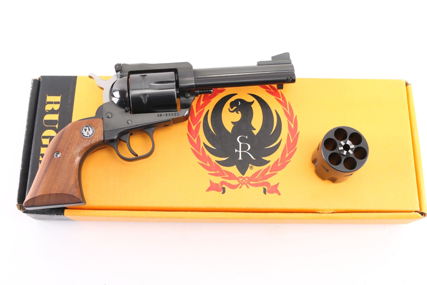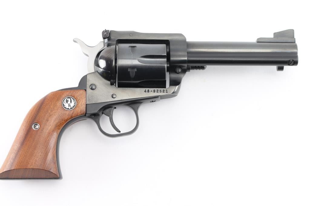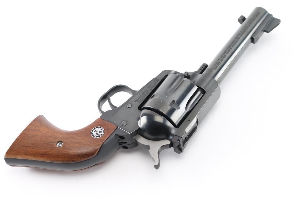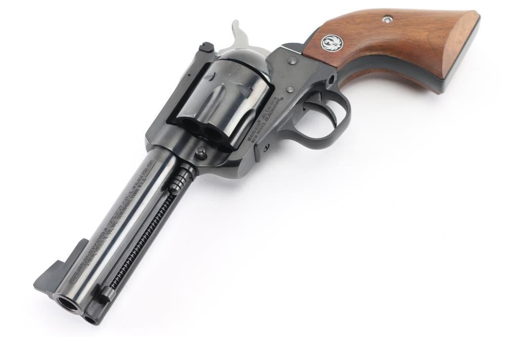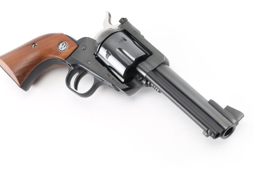 SN: 46-92521. Single action six-shot revolver chambered in .45 Colt, convertible to ACP with the extra cylinder. Features a blued finish, 4.5/8" cold hammer-forged barrel, raised serrated ramp front sight, adjustable rear sight with square notch, ejector rod, fluted cylinder, smooth trigger, serrated hammer spur, transfer bar safety, and two-piece smooth walnut grips with Ruger medallions. Includes a factory cardboard box with manual. Revolver exhibits the majority of its blued finish showing very little wear with some very minor scratches, edge wear, faint track line on the cylinder. Action is smooth with very good lock-up, the bore is excellent and the wood grips are fine. 45 Colt cylinder included, the 45 ACP cylinder is installed. Condition is near NRA Excellent in box. Modern Firearm.
