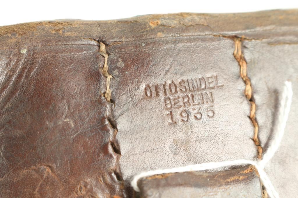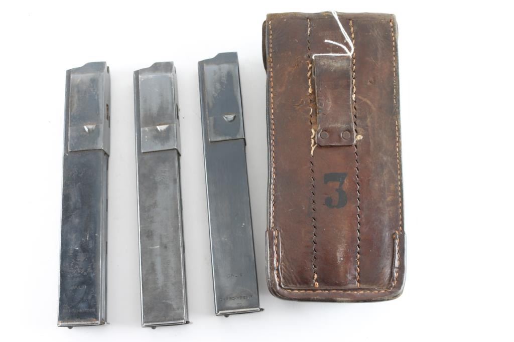 in leather carrier stamped Otto Sindel Berlin 1955. 8-32round marked blued mags DRP Schmeisser 9 cal marked. Very good plus to almost fine some normal leather wear and age.
