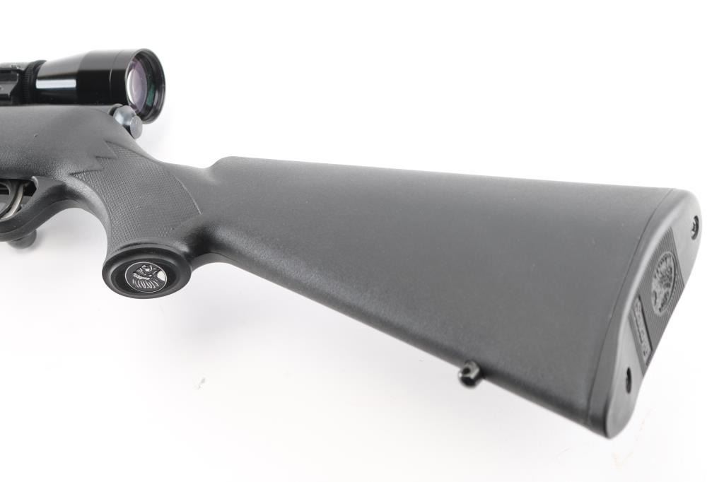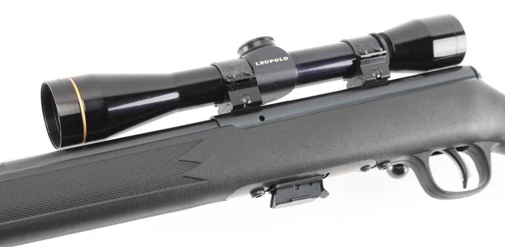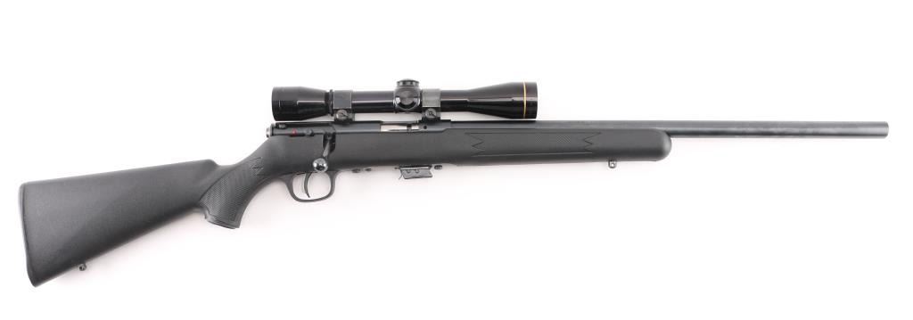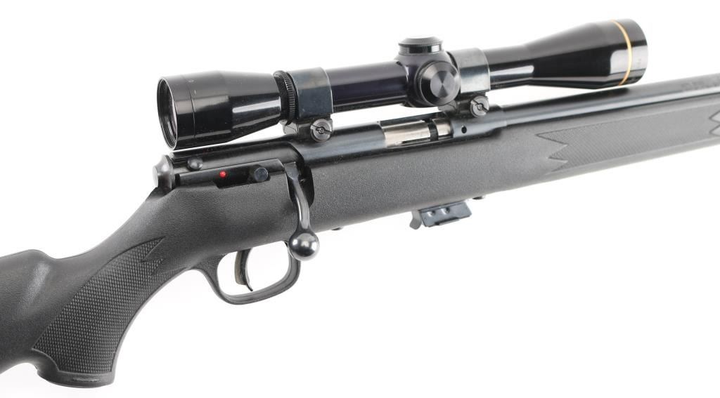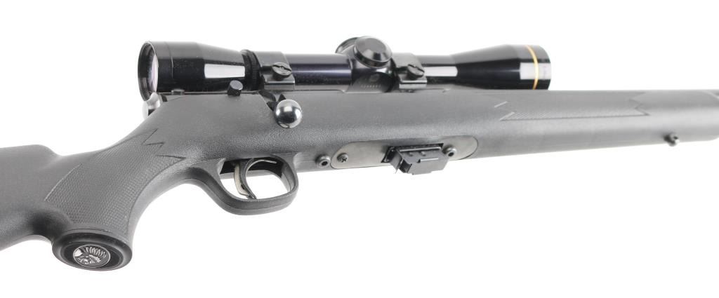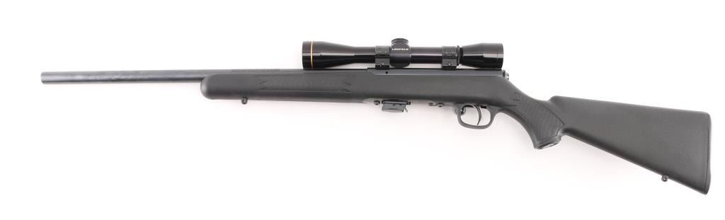 Canadian made magazine fed bolt action sporting rifle chambered in 22 Long Rifle. Imported by Savage Arms Inc. of Westfield, M.A. with import marks on the left side of the barrel. Features a blued finish, 21" semi-heavy barrel with recessed crown & no provisions for sights, Leupold FX-11 6x36mm scope mounted on a two-piece Weaver base, adjustable Accu-trigger, manual safety on the right side of the receiver, swept-back bolt handle, detachable 5 round magazine, and checkered black synthetic semi-pistol grip shoulder stock with integral trigger guard, installed swivel studs & black plastic buttplate, sling swivel studs. Rifle retains approximately 99% of its blued finish showing very little wear. Action is smooth, the bore is pristine, optics are sharp and the synthetic stock is near fine. Condition is NRA Excellent. Modern firearm.