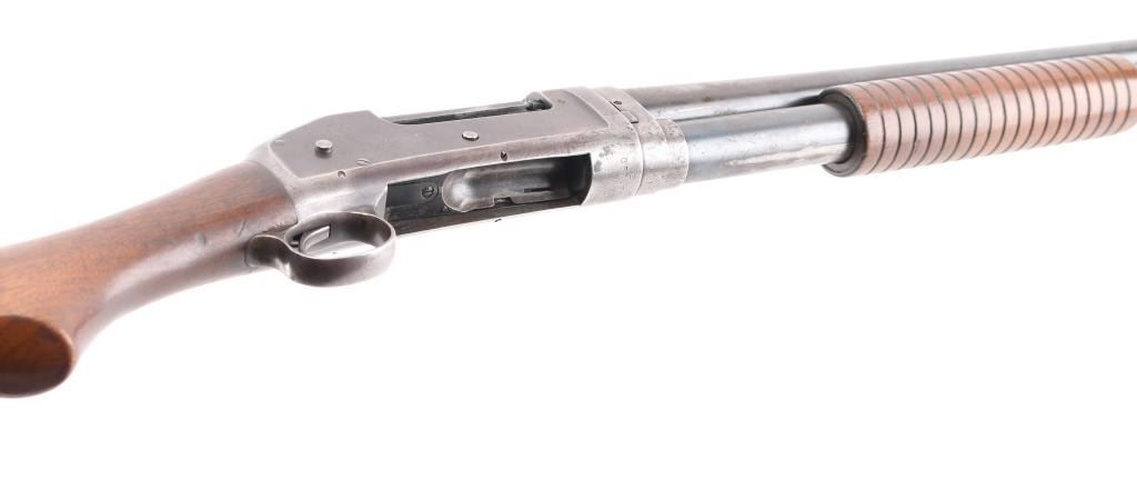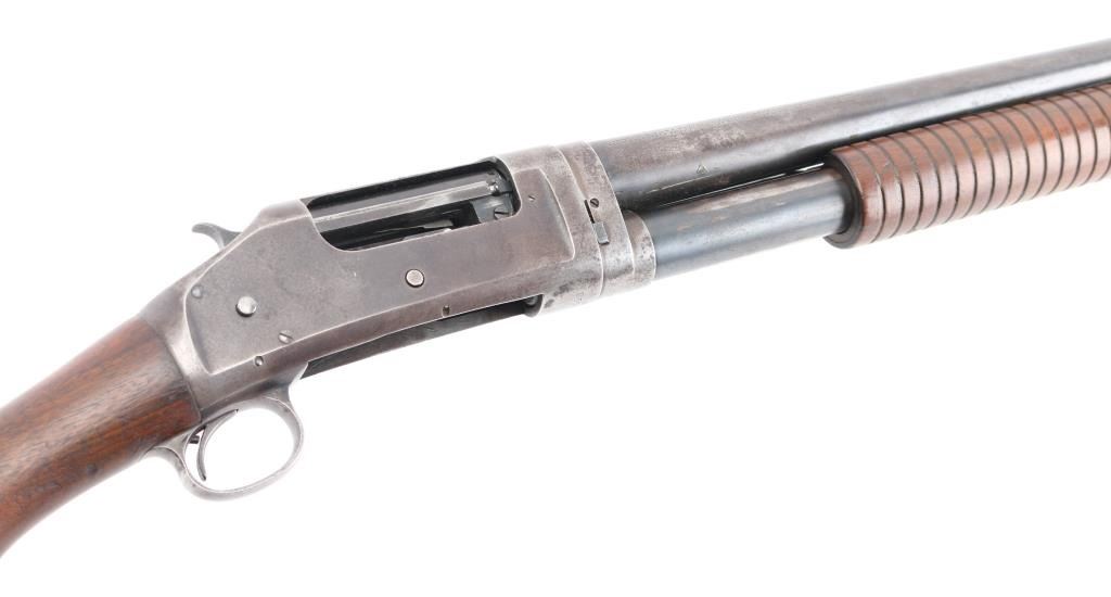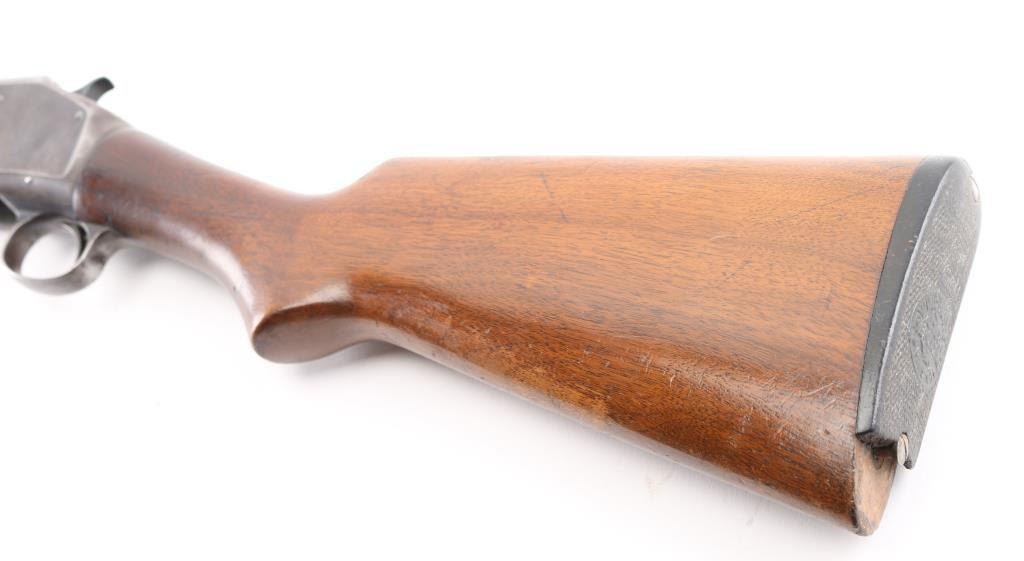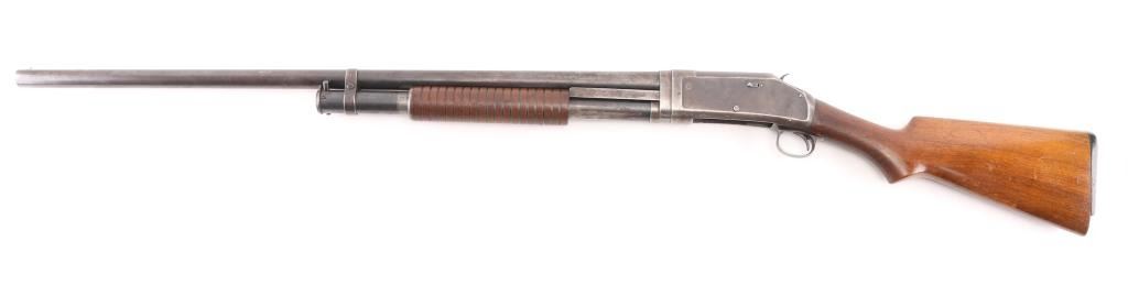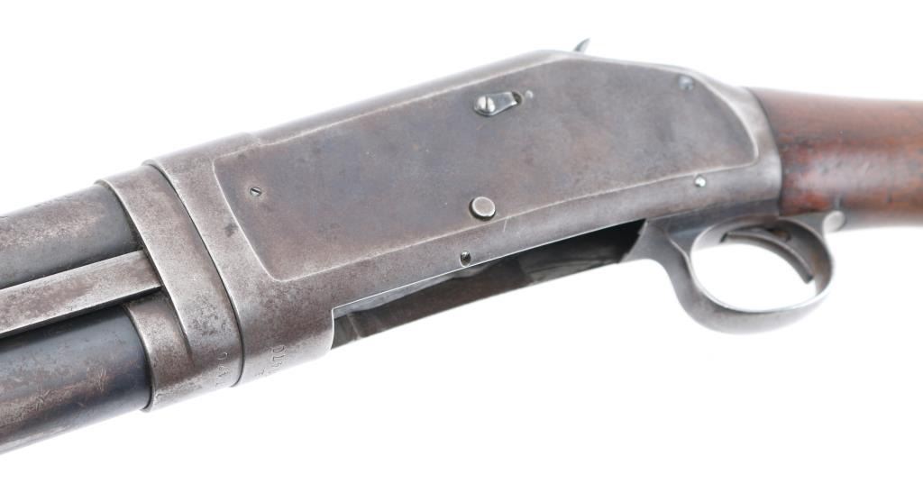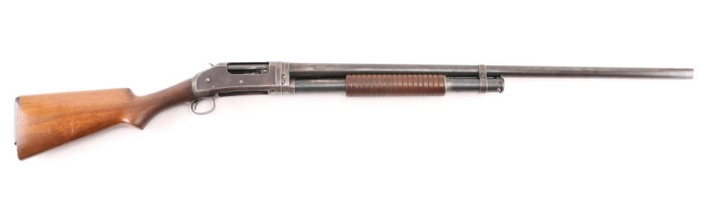 Vintage take down pump action shotgun manufactured circa 1938. Features 30" plain barrel marked FULL choke with a steel front bead, half length magazine tube, smooth wood semi-pistol grip stock & grooved pump handle. It has a thin smooth trigger and a factory hard rubber butt plate, exposed hammer.. Bore is very good/bright, needs cleaning, action is crisp/tight, markings are crisp/clear, wood is very good with minor scratches/dings. blue finish is about 30% mostly turned a gray/brown patina, LOP is 13". There is a 1" chip out of the buttplate. NRA Condition-Fair to Good. C&R Firearm.