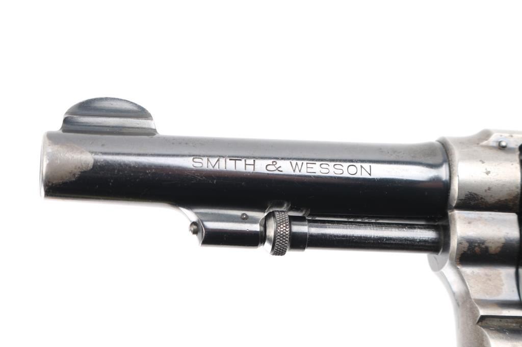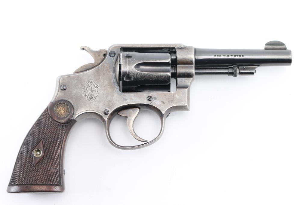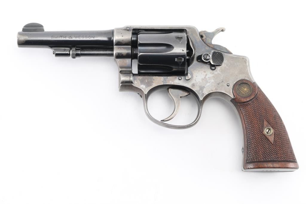 SN: 75587. Pre-war. 'Model of 1905 4th Change 'Model of 1905, double action revolver built on a square butt K frame., 4th change, Manufactured 1915-1940. Blued finish, 4" barrel, fixed sights, checkered wood grips with S&W Medallions. Bore is excellent/bright, Blue finish is about 40% with handling loss, mostly on the frame. Grips are very good, action is crisp/tight NRA Condition-Fair to Good. C&R Firearm.
