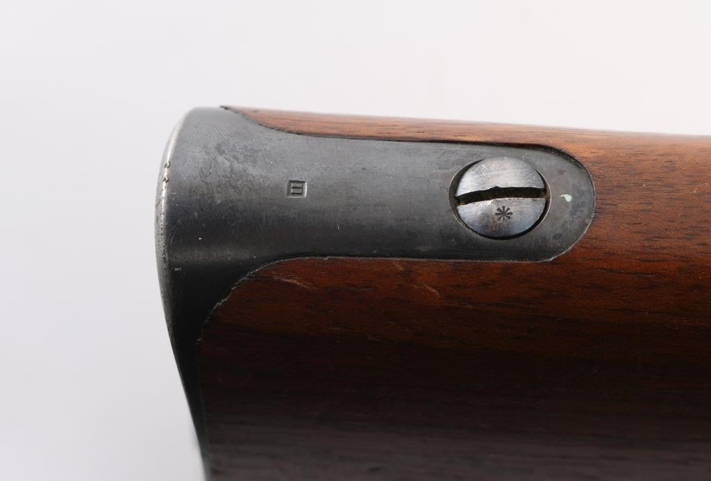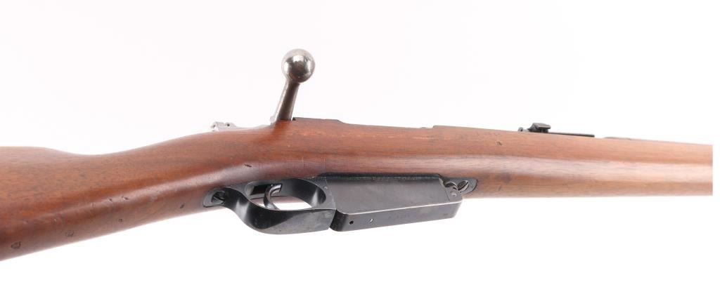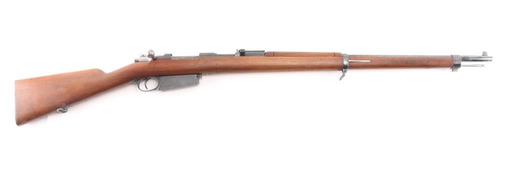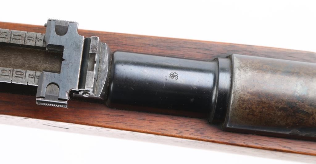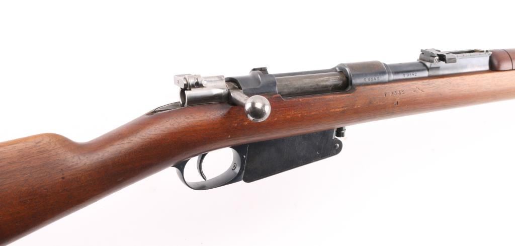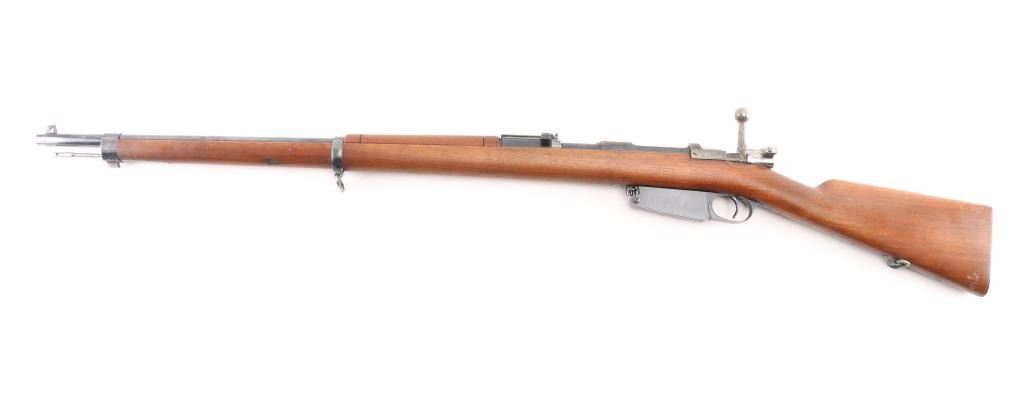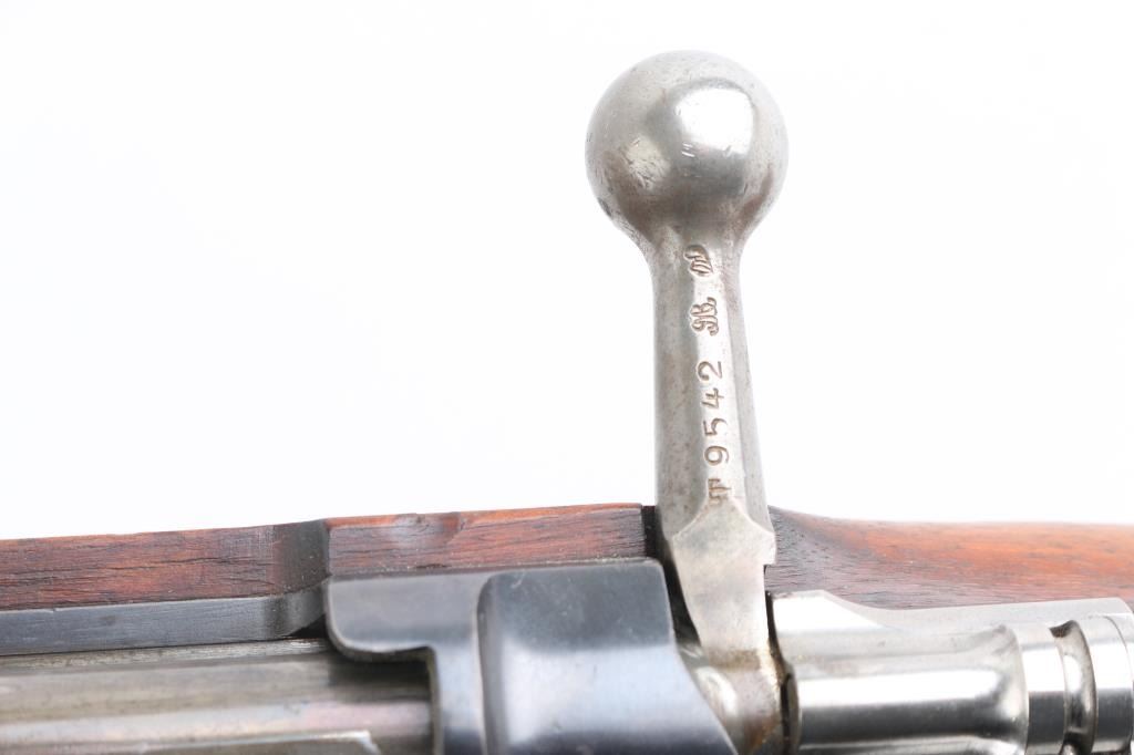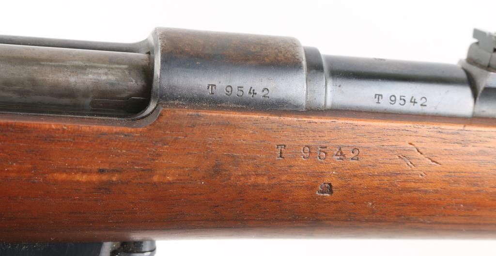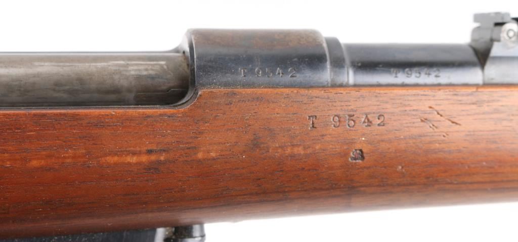 SN: T9542. German military Mauser bolt action rifle manufactured by DWM, Berlin for the Argentine government circa 1891-1909. Features blued finish, wood stock & handguard, straight grip, steel buttplate, 29" barrel, military tangent sights, bayonet lug, cleaning rod under barrel, sling swivels, straight bolt handle, manual safety. Bore is good condition, strong rifling, needs cleaning. Bolt assembly is very good, in the white. Remainder of metal parts retain 90% coverage of a dark polished blue, with scratches and dings, some brown patina on sides of magazine, discolored area on receiver ring where Argentinean crest was removed. Wood is very good condition with minor scratches. serial number matched on barrel, chamber stock, cleaning rod, & bolt, cartouche on stock. No import marks observed. NRA Condition-Very Good. C&R Firearm.
